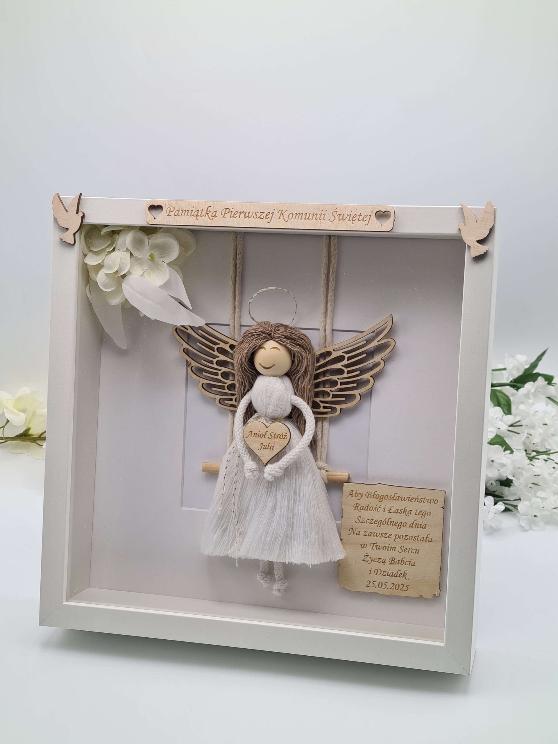 Podaruj wyjątkowy prezent, który będzie piękną pamiątką na całe życie! Ten uroczy Anioł Stróż dla dziewczynki – Pamiątka Pierwszej Komunii Świętej to ręcznie wykonana dekoracja w ramce 3D, która wzrusza i zachwyca swoją symboliką.
