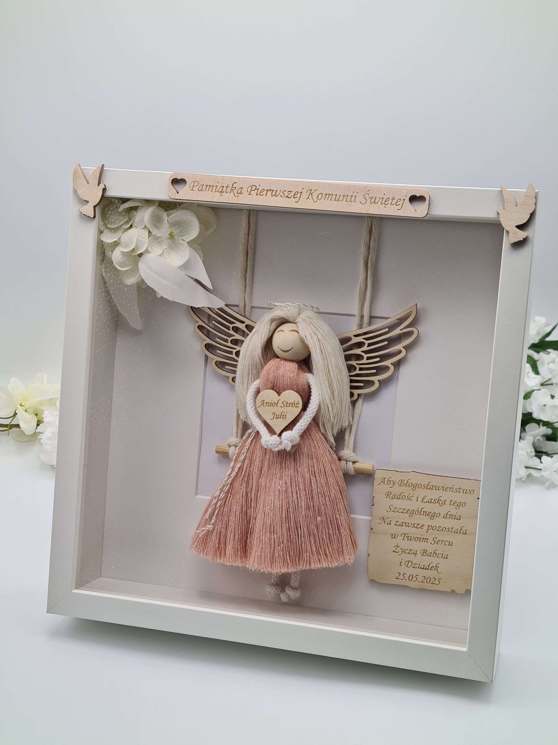 W środku ramki znajduje się subtelna postać aniołka z delikatnymi, drewnianymi skrzydłami i sukienką w różowym odcieniu. Trzyma serduszko z wygrawerowanym imieniem dziecka, a obok znajduje się personalizowana dedykacja z datą uroczystości. Całość dopełniają białe kwiaty i eleganckie zdobienia.