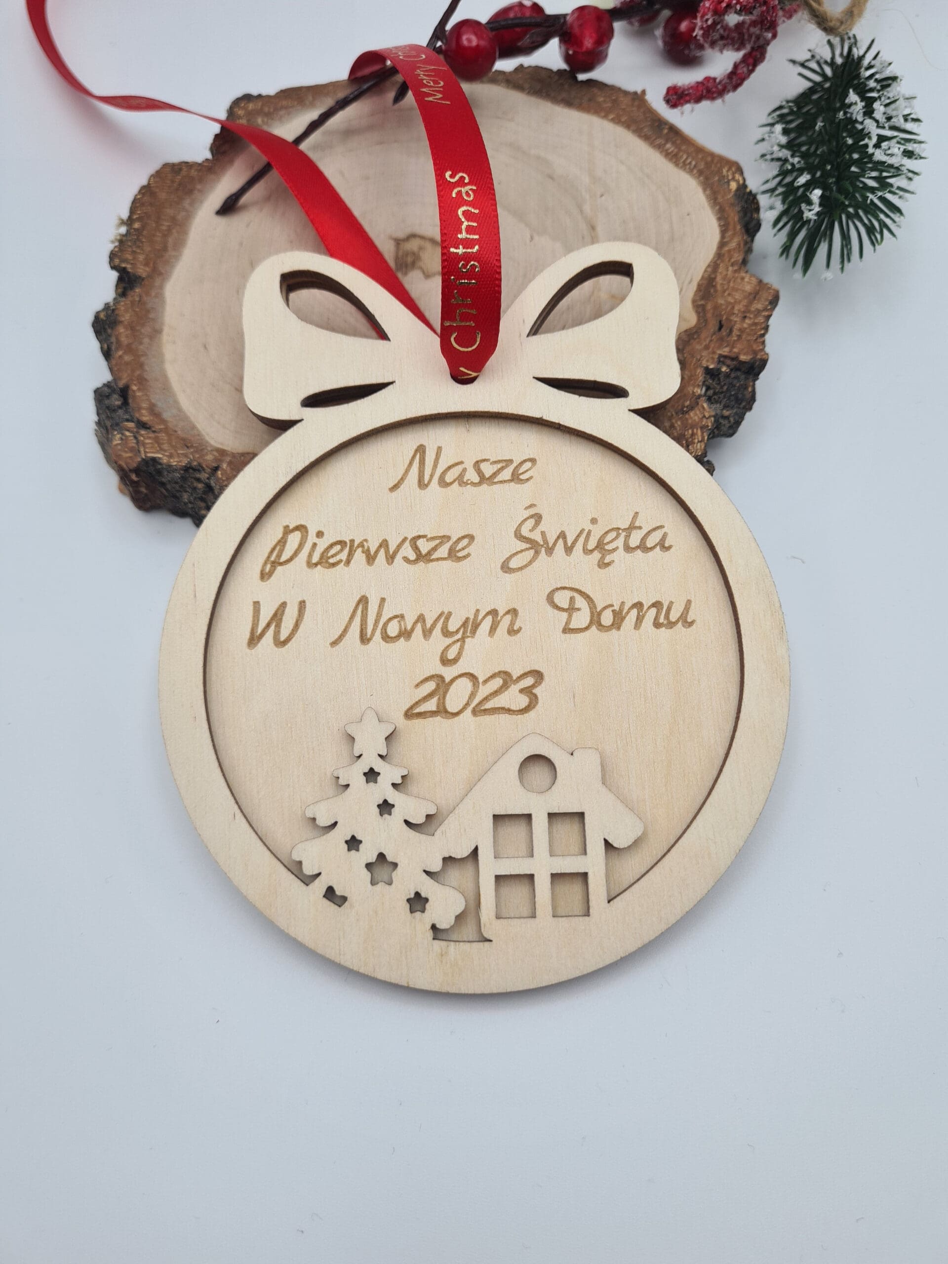 Drewniana Bombka Zawieszka Choinkowa „Nasze Pierwsze Święta w Nowym Domu” – Symbol Nowego Początku