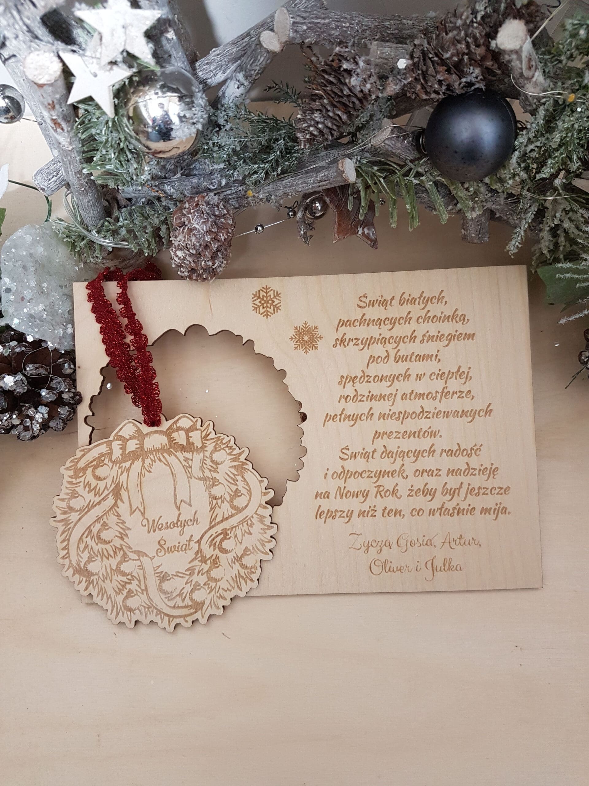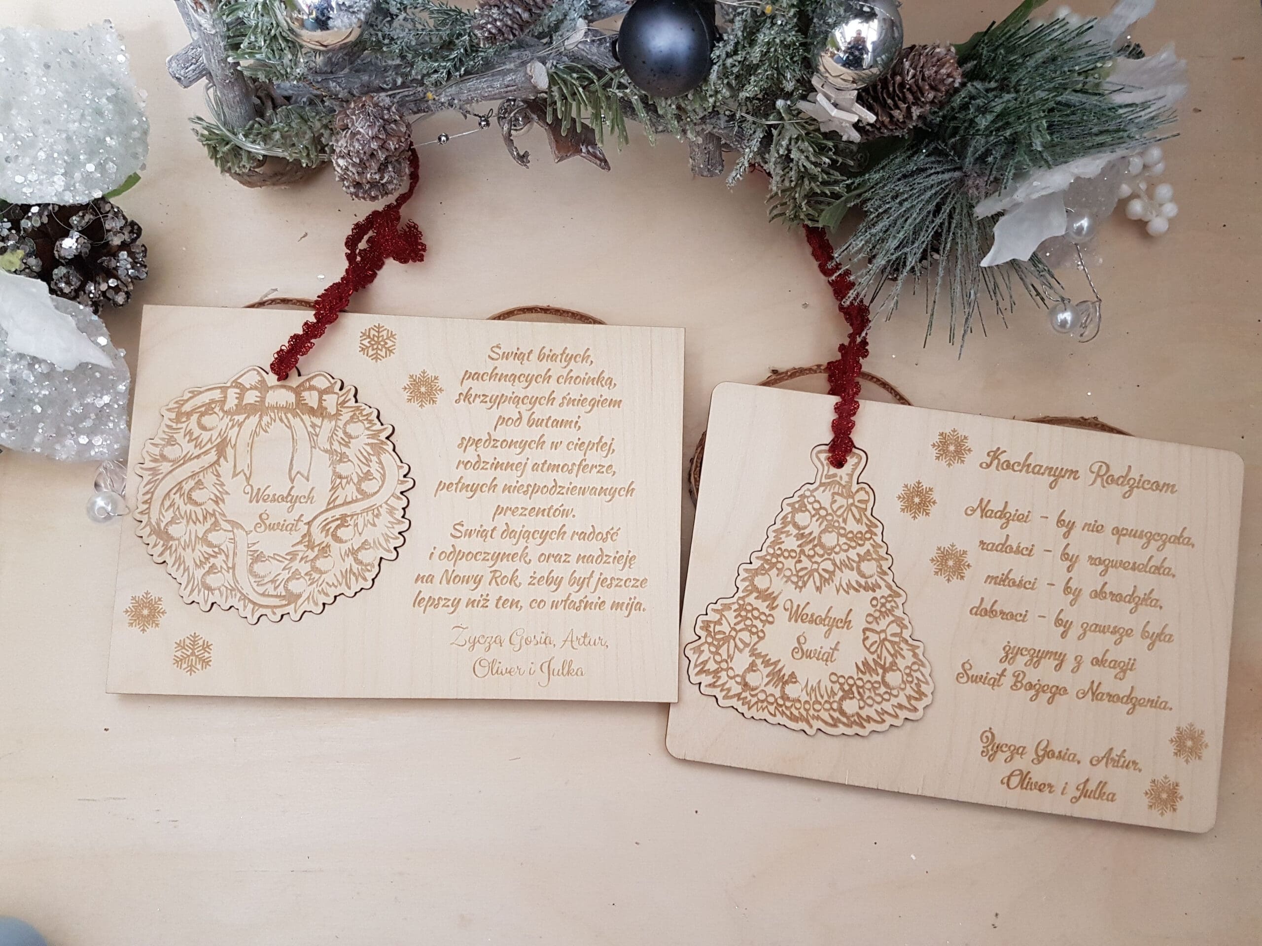 Kiedy nie możemy osobiście złożyć świątecznych życzeń, postarajmy się aby kartka świąteczna, którą wyślemy była oryginalna, zaskoczyła obdarowanego. Nasza propozycja to drewniana kartka świąteczna, zdobiona grawerem. Spośród innych kartek wyróżnia je to, że zawierają w sobie drewniana ozdobę choinkową, którą można wyjąć i zawiesić na świątecznym drzewku.