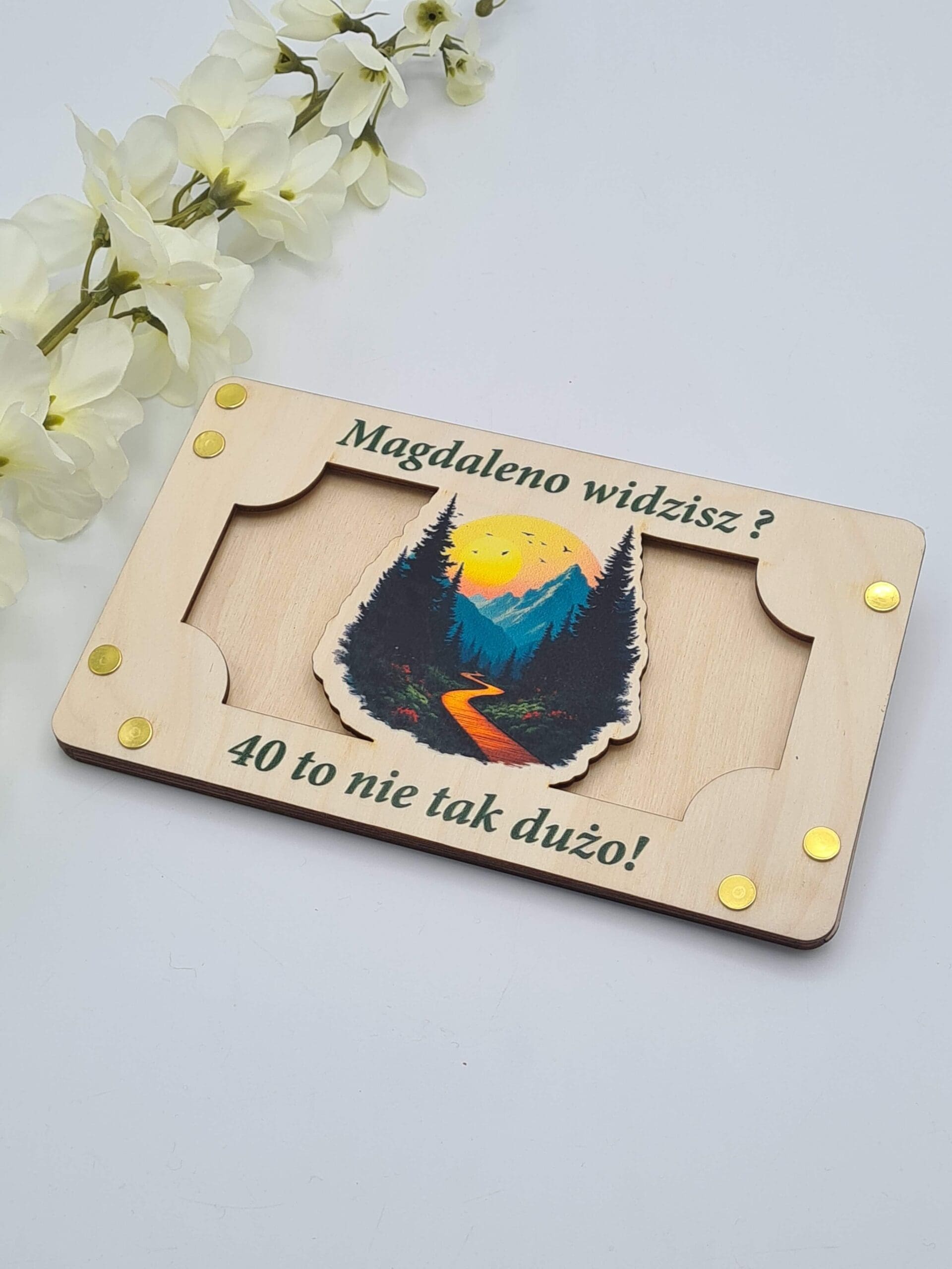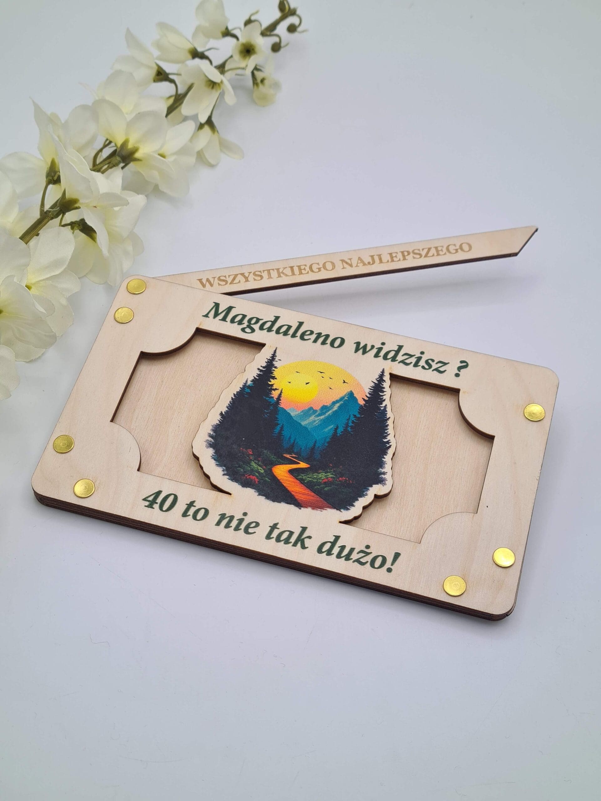 Podarowanie gotówki w wyjątkowy sposób jeszcze nigdy nie było tak stylowe! Drewniana koperta na pieniądze – Widzisz? To wcale nie tak dużo! to oryginalny prezent, który zachwyca estetyką i personalizacją. Idealny jako prezent na każde nie tylko 40 urodziny, który nie tylko pozwala elegancko wręczyć banknoty, ale także staje się pamiątką na długie lata.