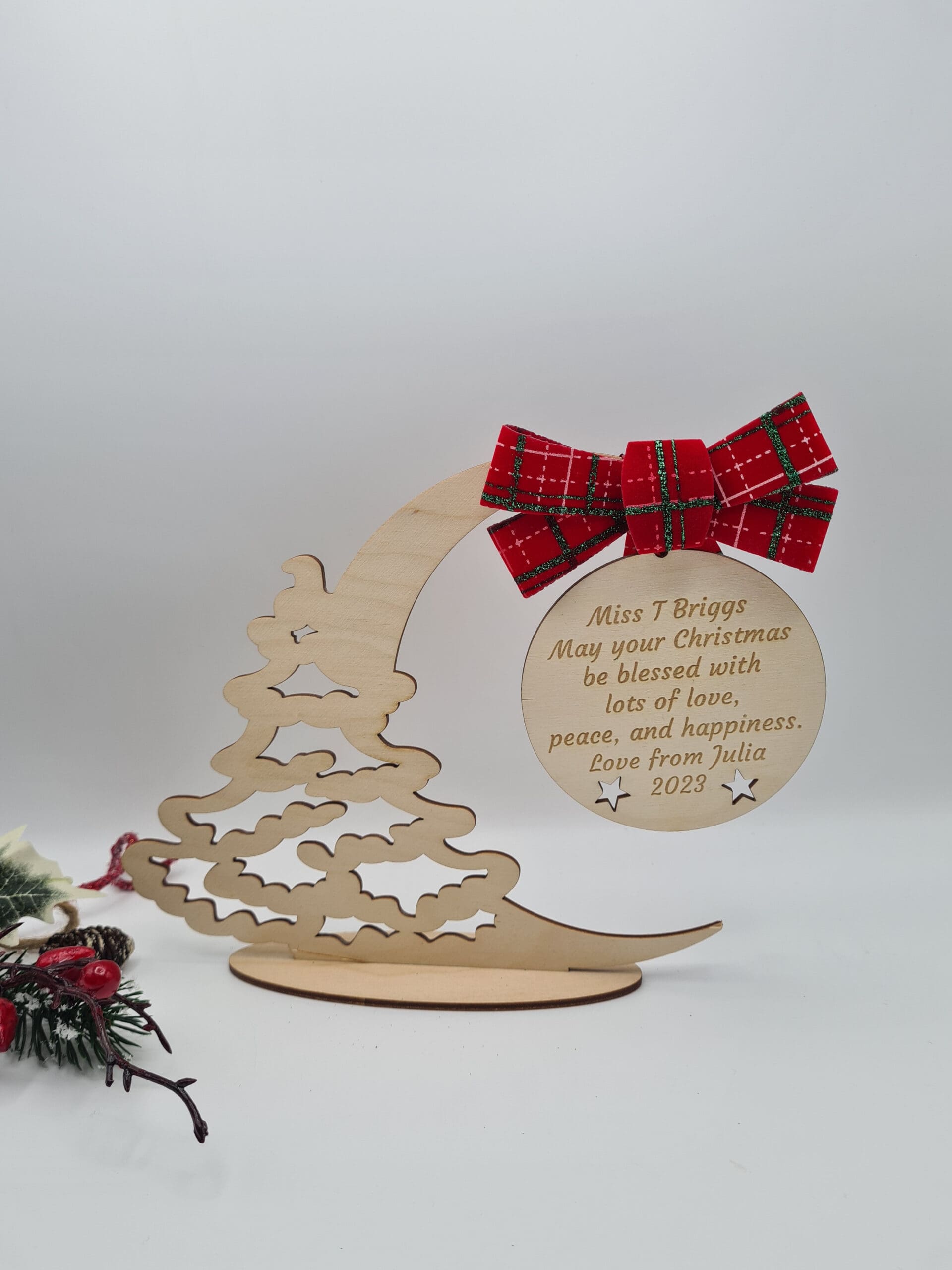 Personalizowana bombka świąteczna na stojaku z kokardą