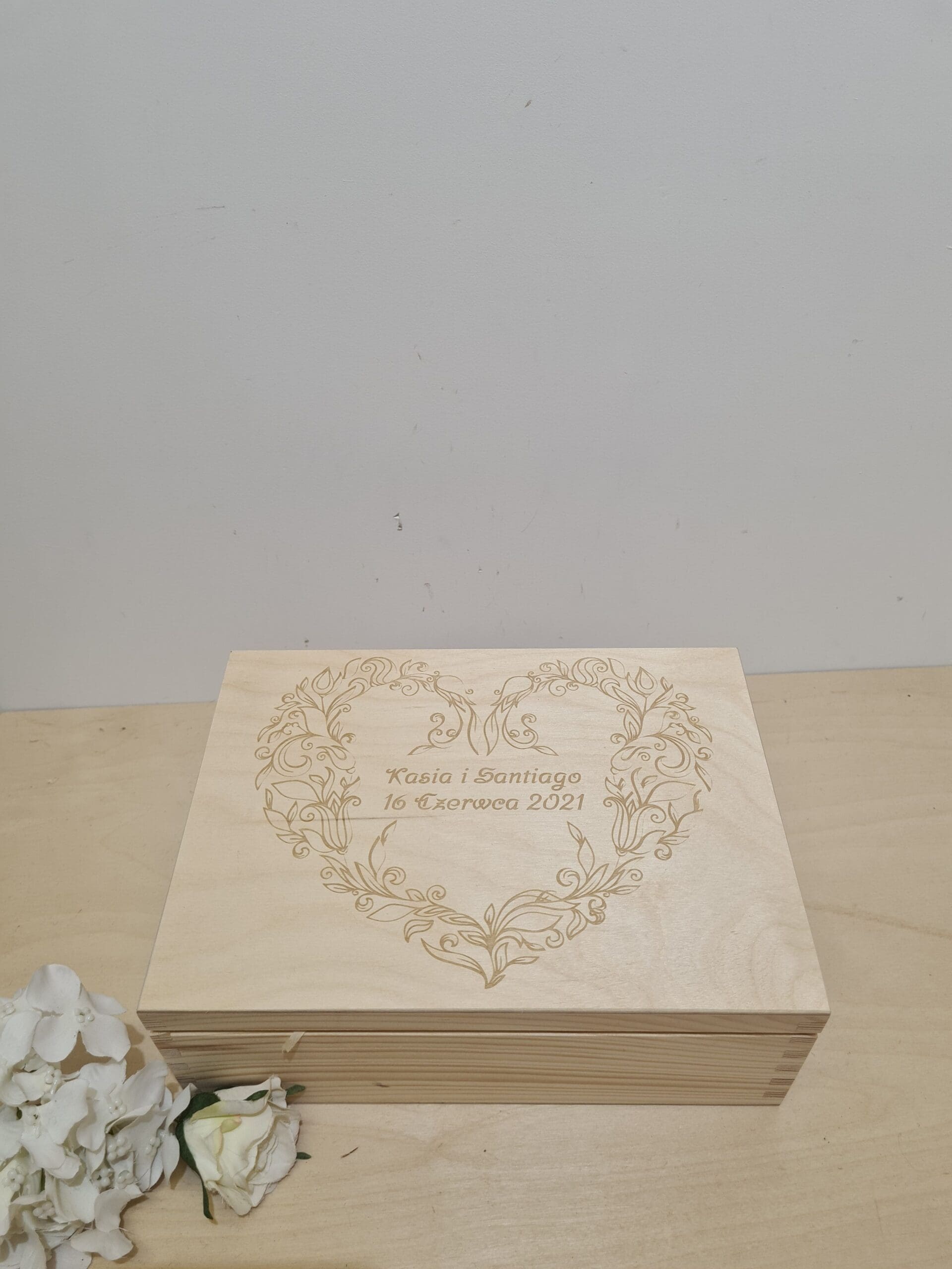 Na wierzch pudełka wygrawerujemy serce do którego dodamy grawer z imionami nowożeńców oraz datą ich ślubu.