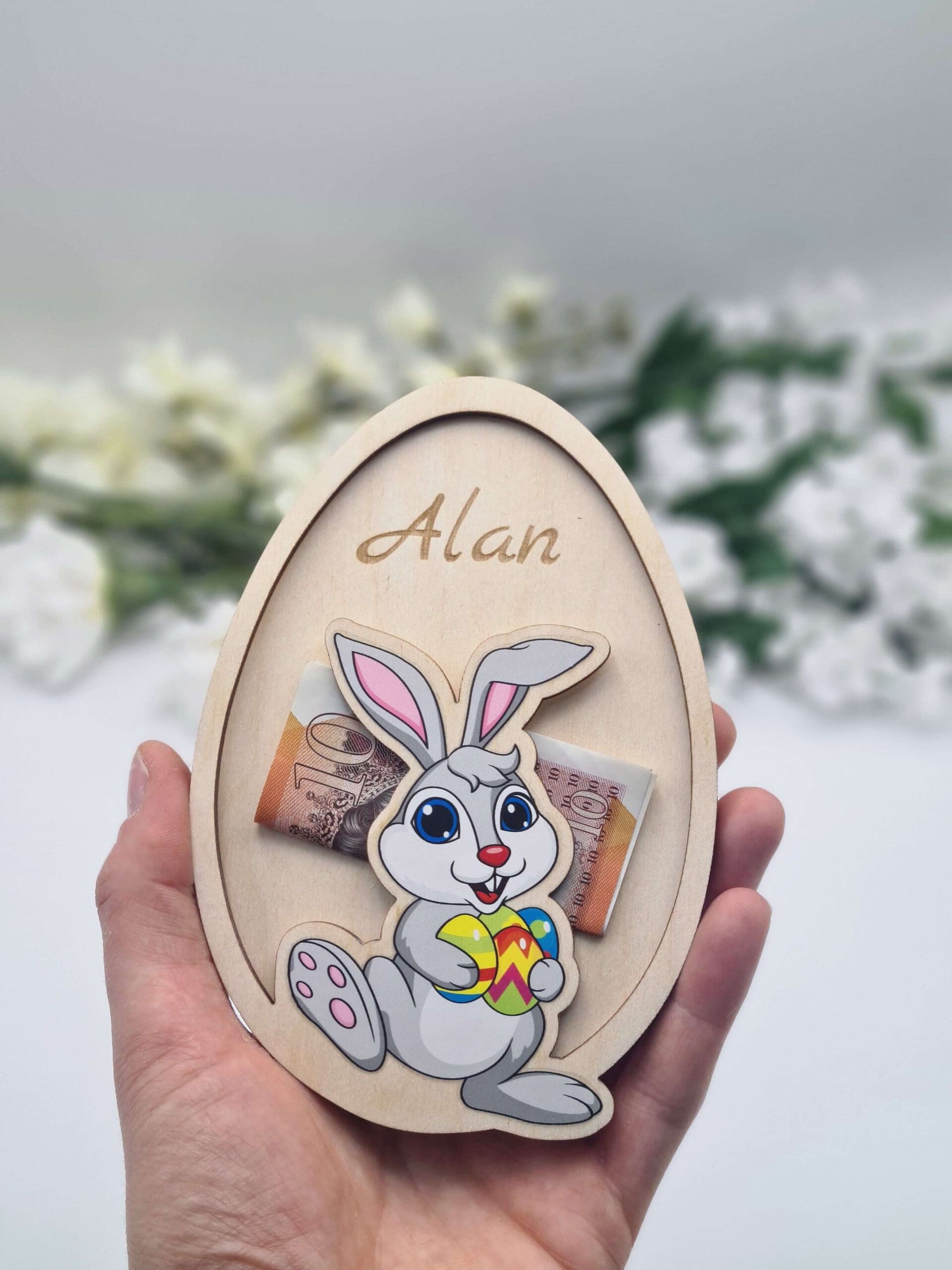 Drewniane jajko na pieniądze – personalizowany prezent wielkanocny z kolorowym zajączkiem