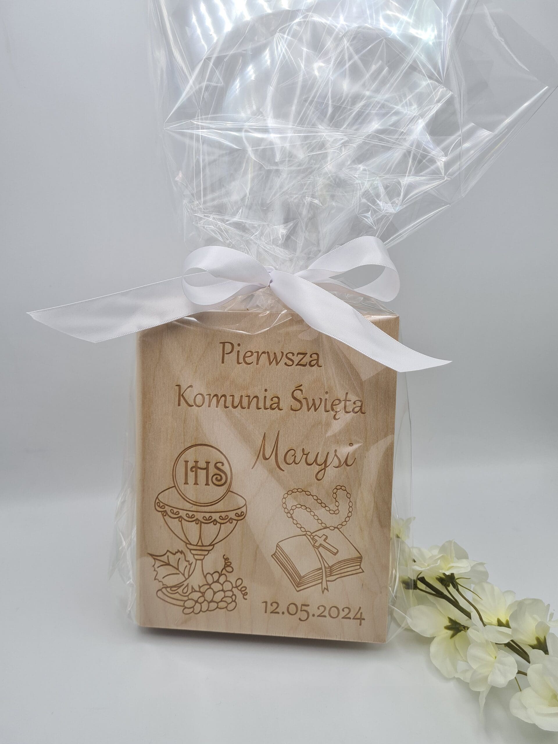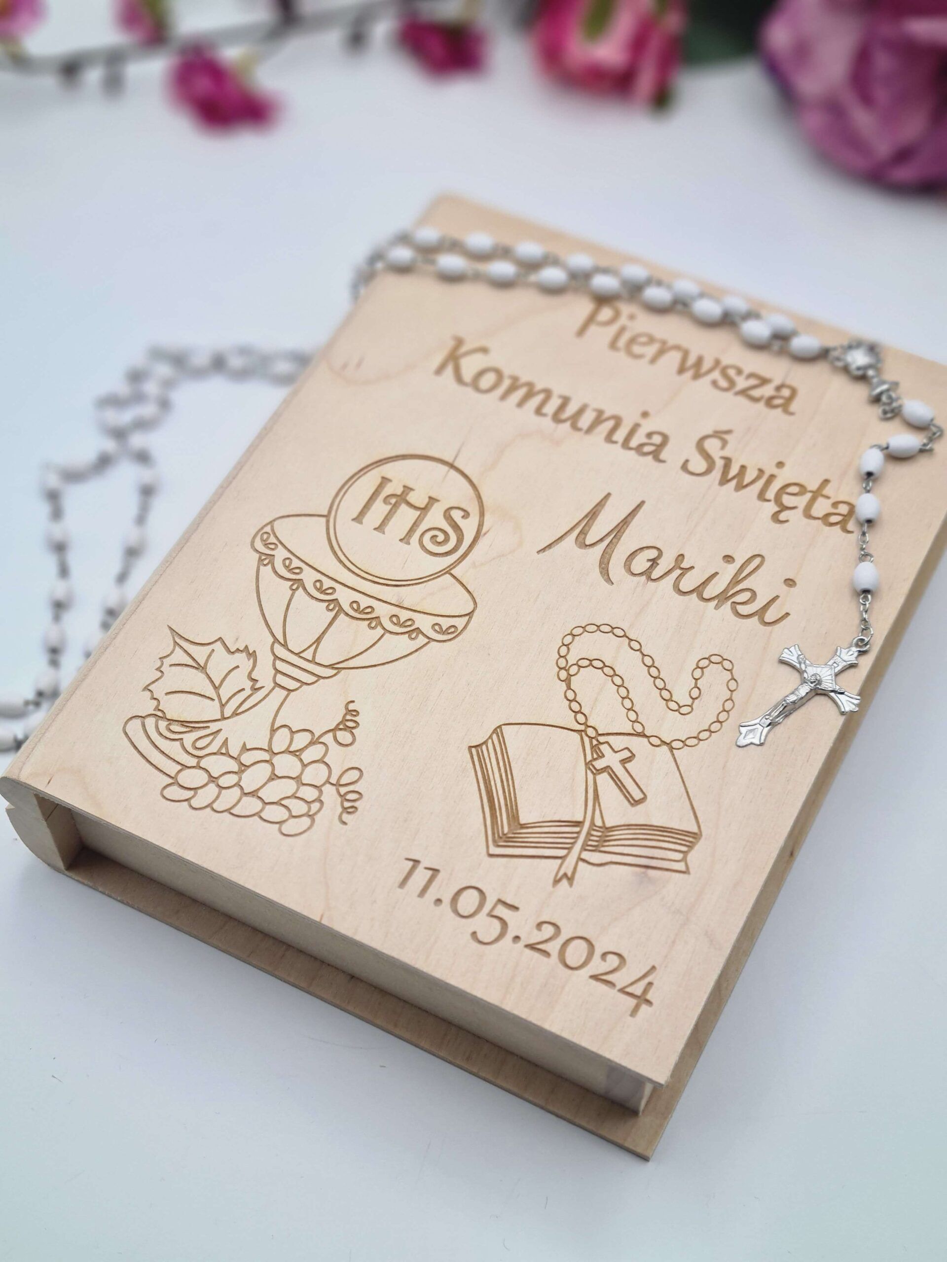 Drewniane grawerowane personalizowane pudełko w kształcie książki – idealny prezent z okazji Pierwszej Komunii Świętej!