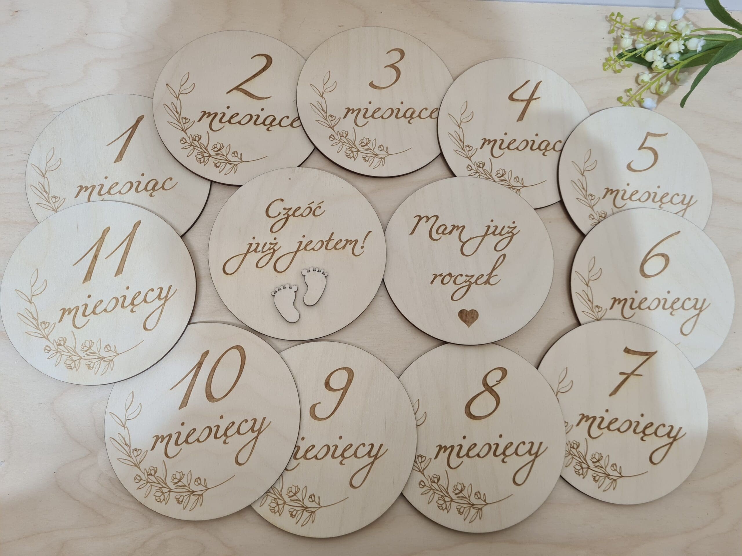 Zestaw zawiera 13 tabliczek: miesiące od 1-11, tabliczkę z napisem „Mam już roczek” oraz „Cześć już jestem”