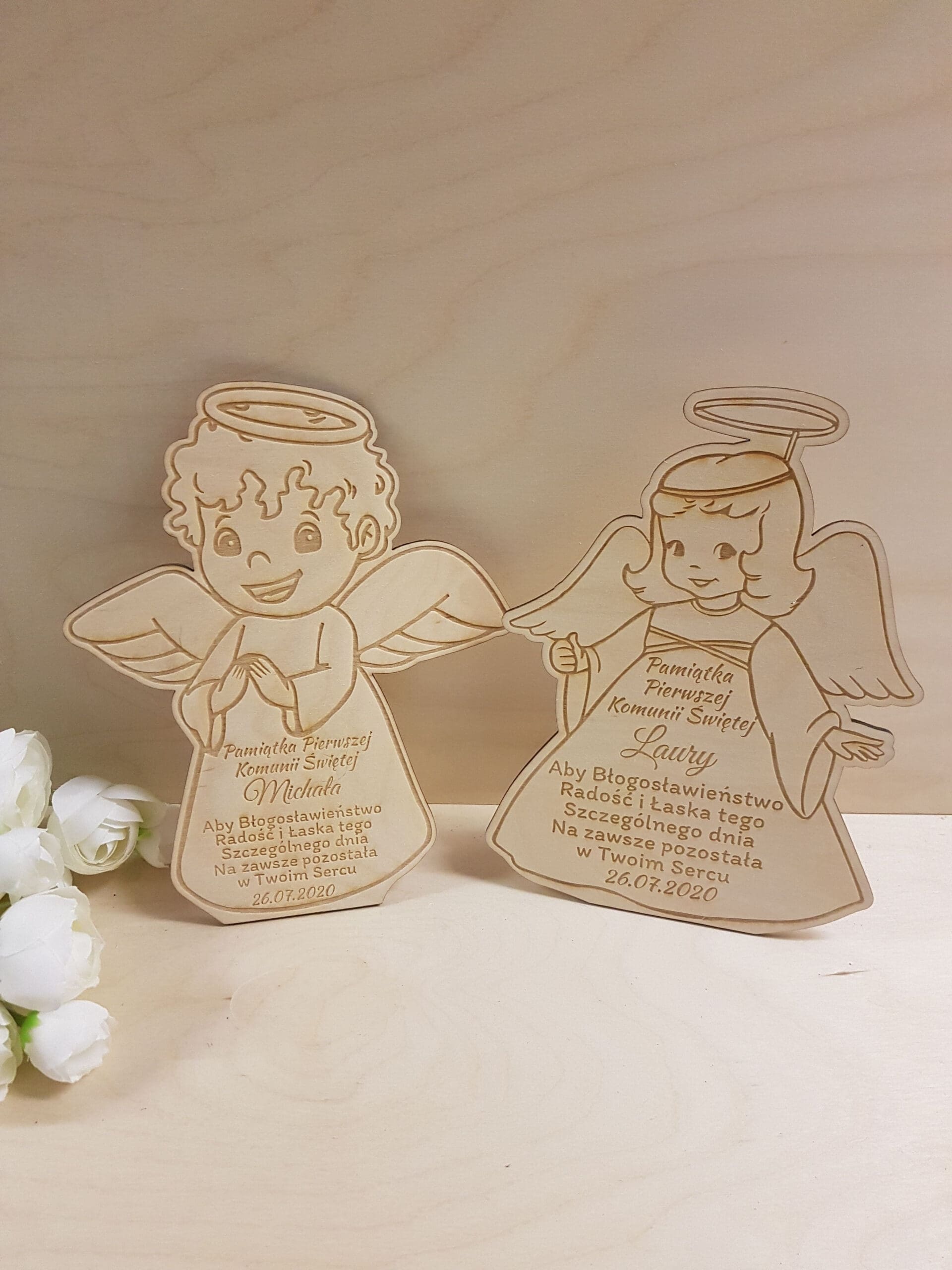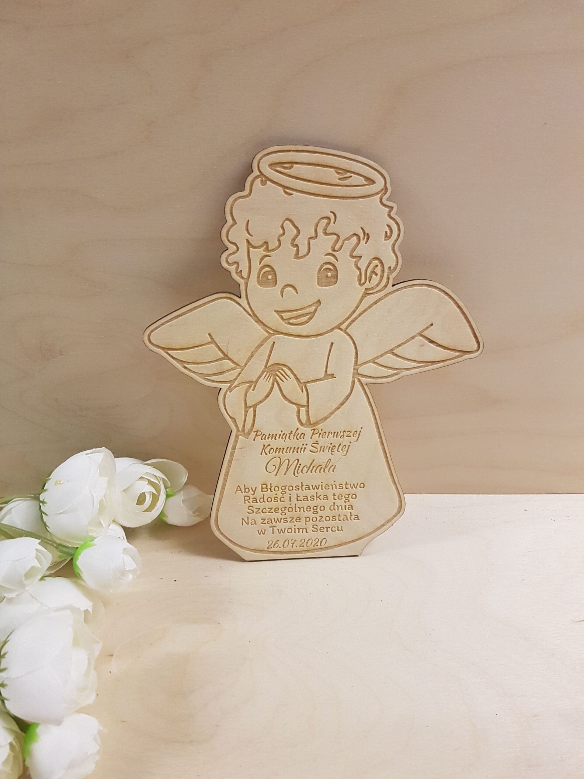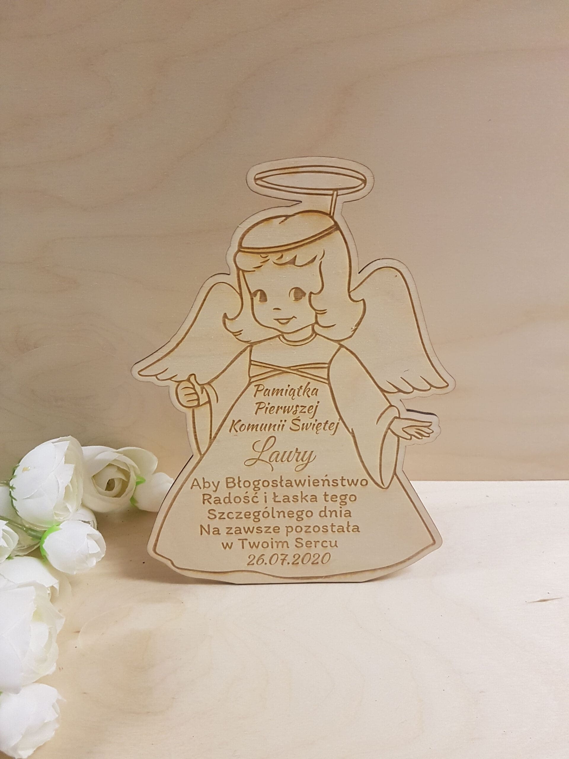 Drewniany aniołek świetnie sprawdzi się jako prezent oraz pamiątka Pierwszej Komunii Świętej.