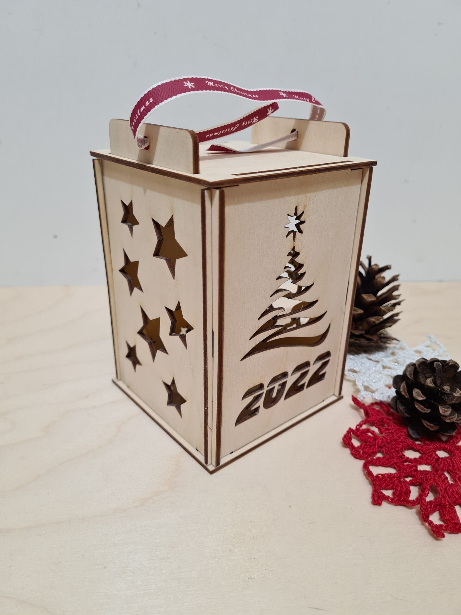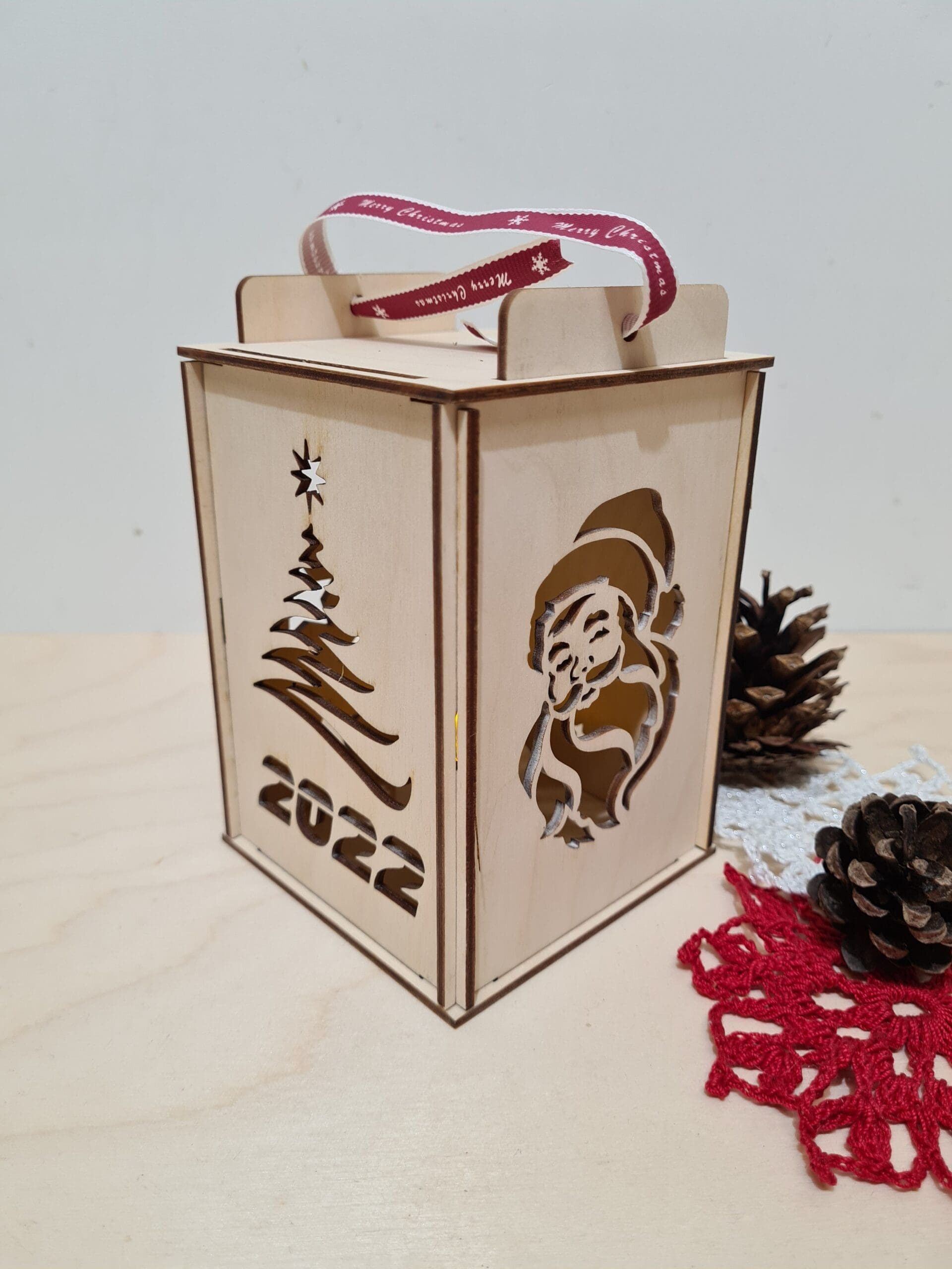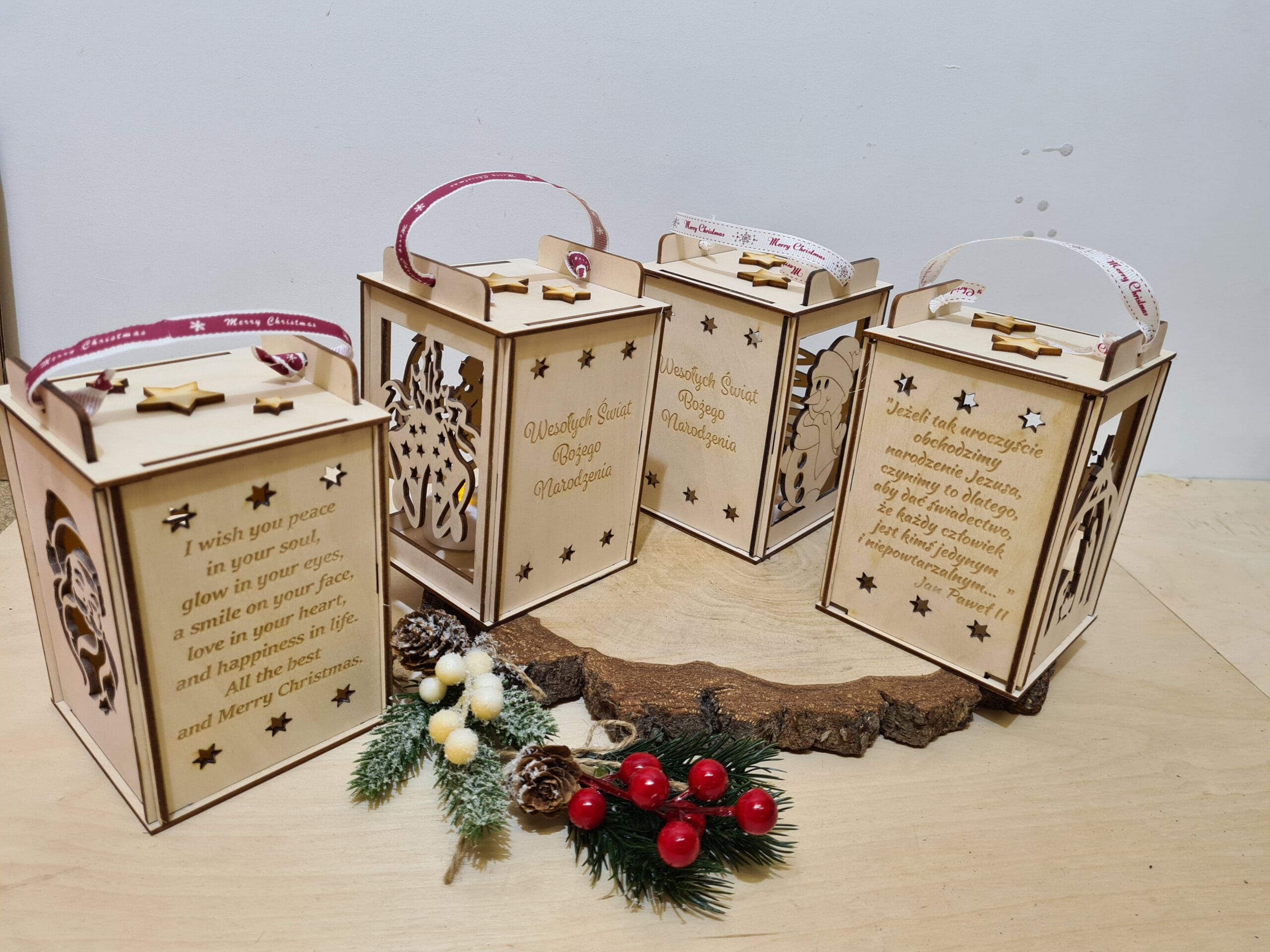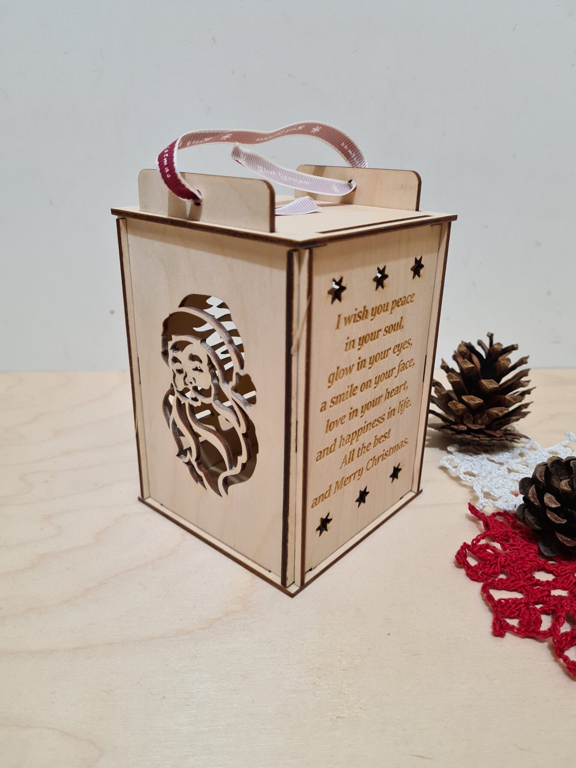 Konstrukcję tego oryginalnego lampionu ozdobiono wzorami mikołaja, choinki i tekstu 2025, gwiazdek oraz Twoją dedykacją umieszczoną na jednej ze ścianek lampionu.
