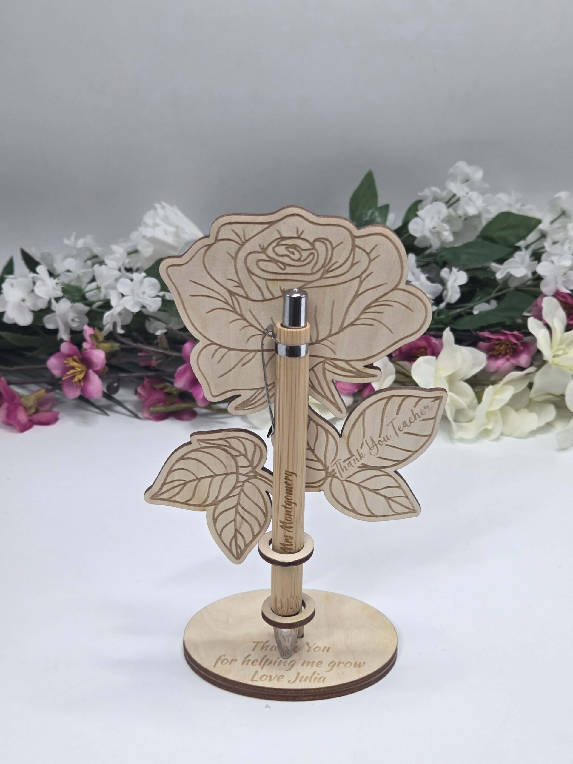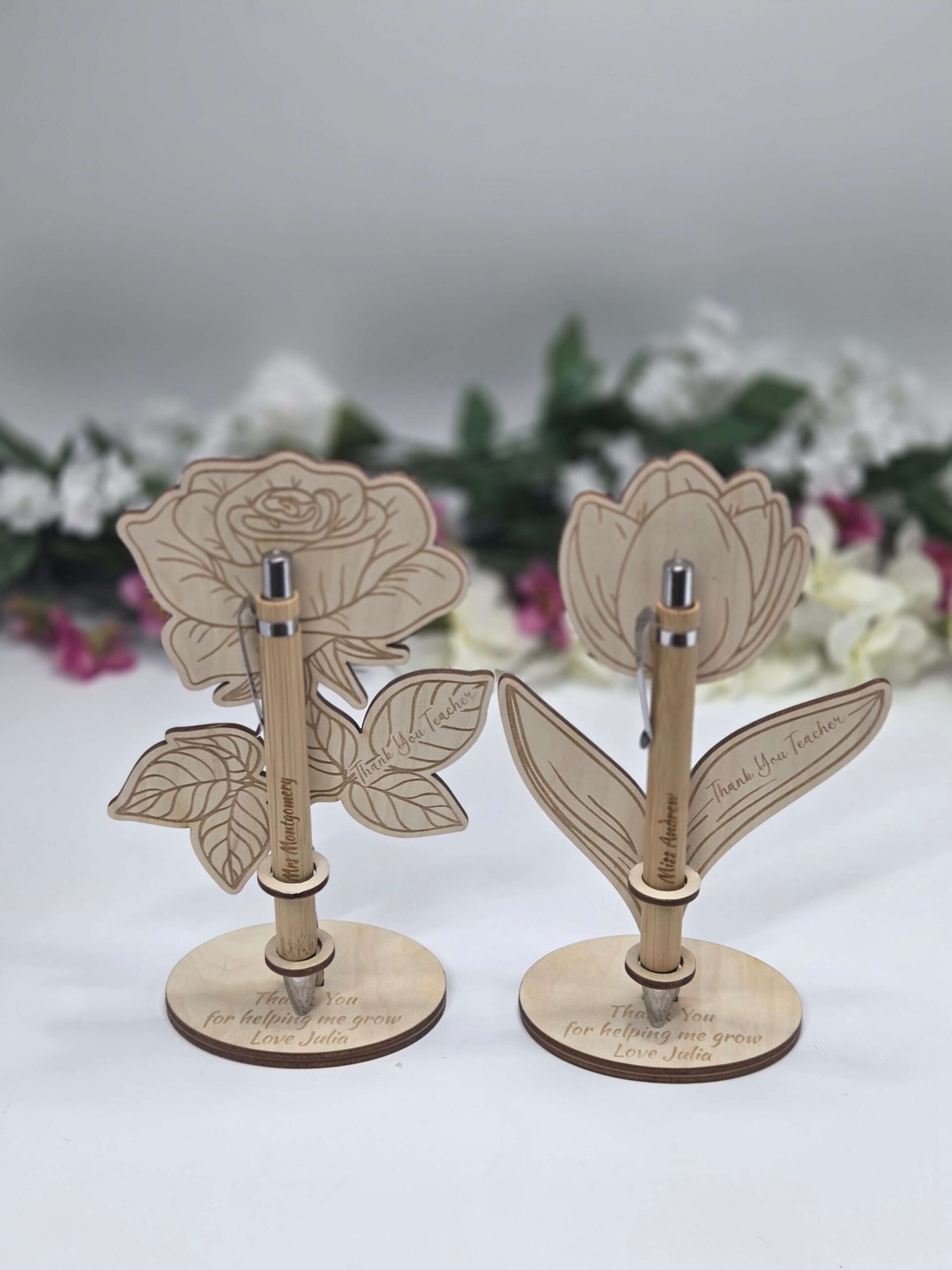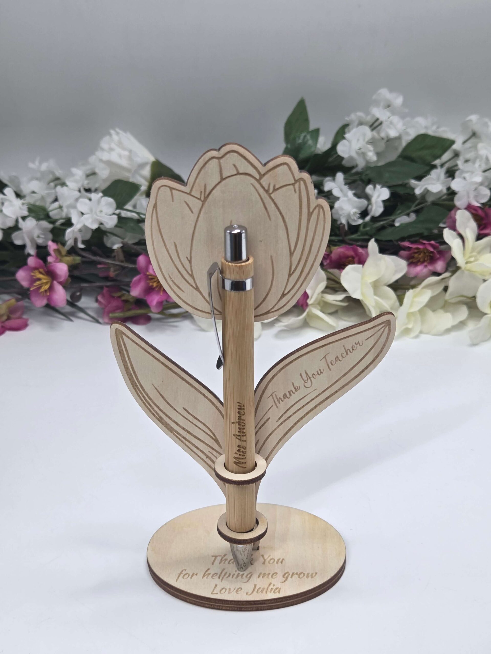 Stojak wykonany jest z naturalnego drewna w formie tulipana lub róży, z grawerem “Thank You Teacher” na listku oraz dedykacją na podstawce „Thank You for helping me grow”. W zestawie znajduje się elegancki, drewniany długopis prezent dla nauczyciela z możliwością wygrawerowania imienia lub krótkiego tekstu.