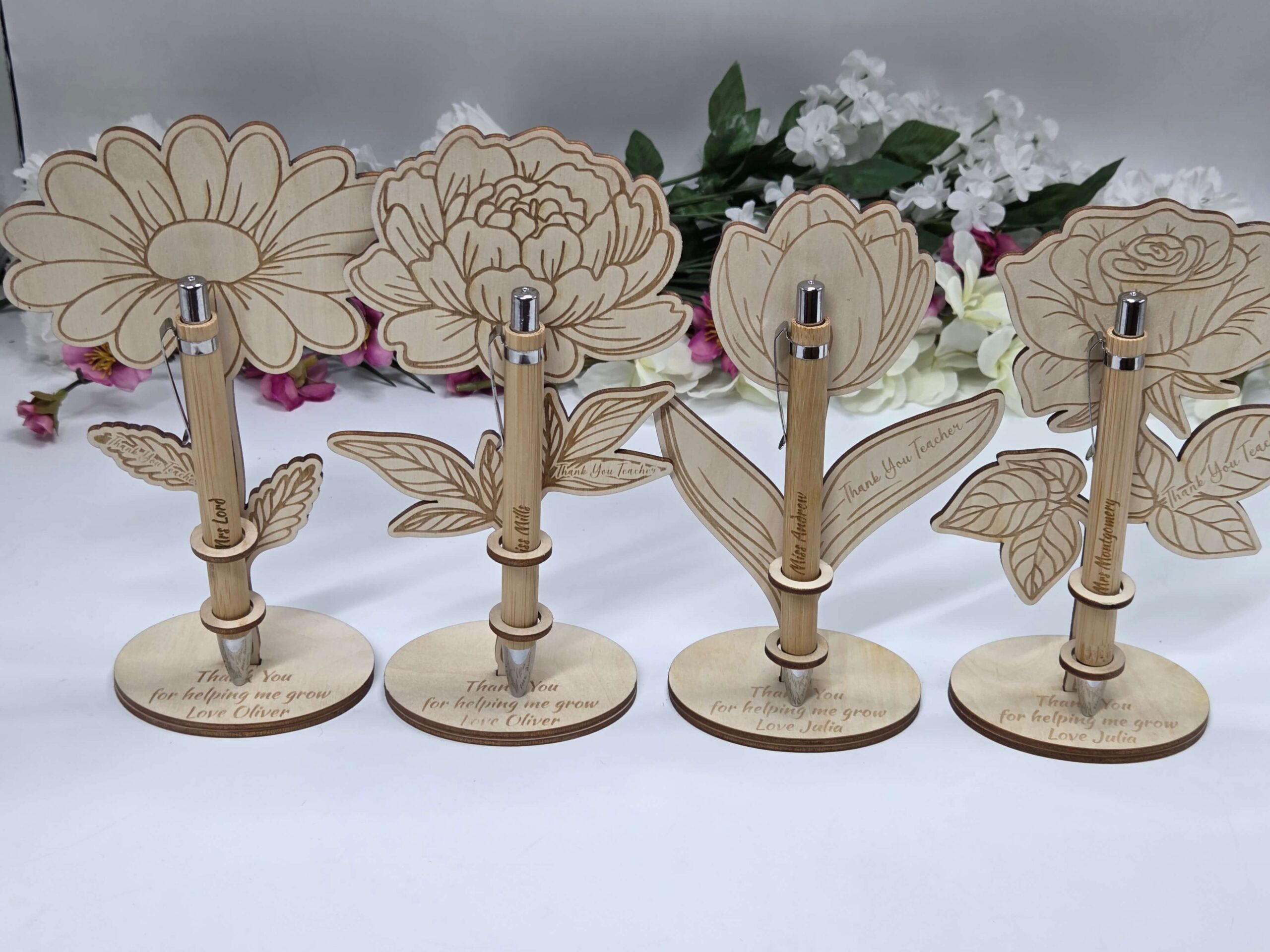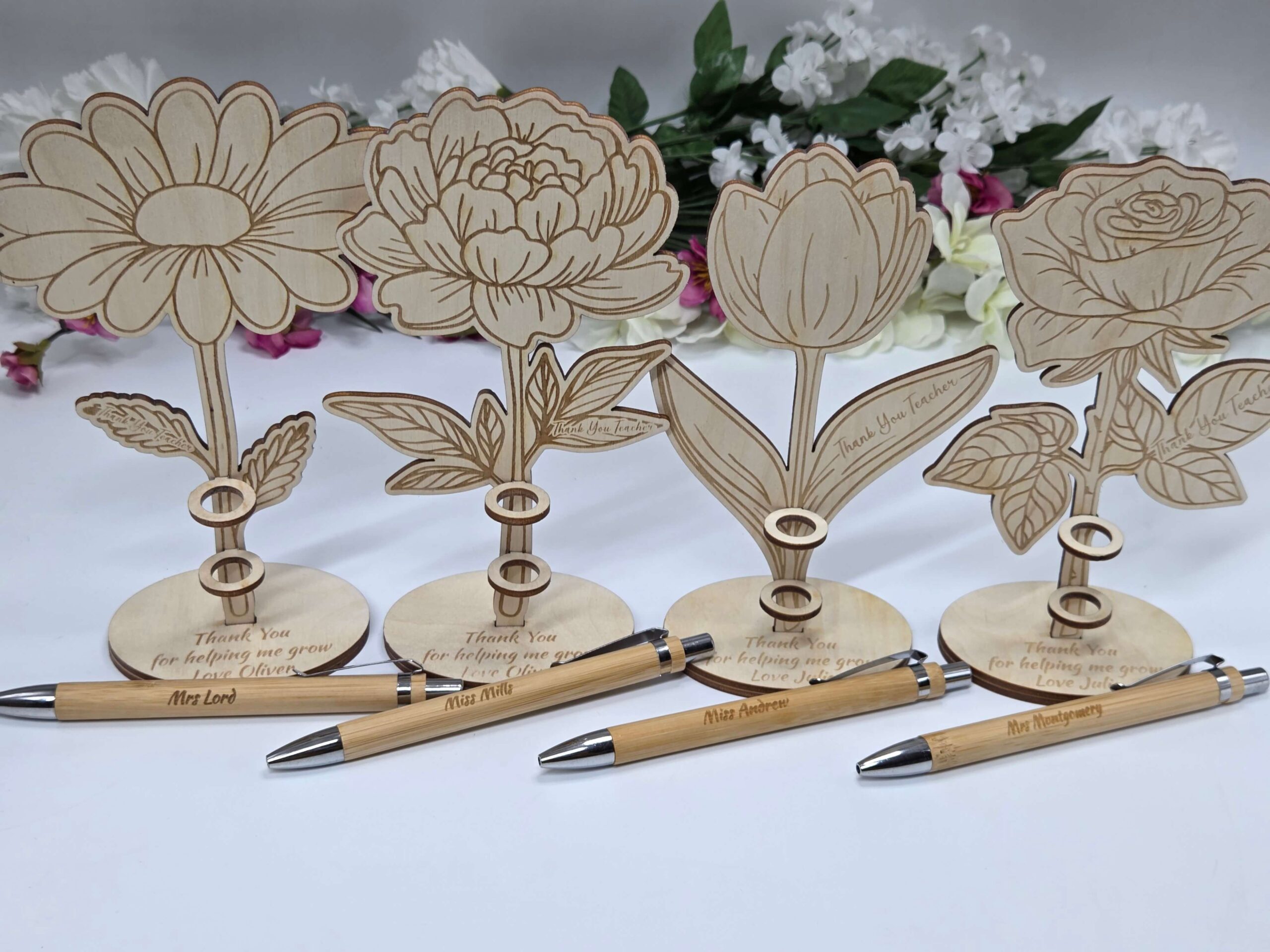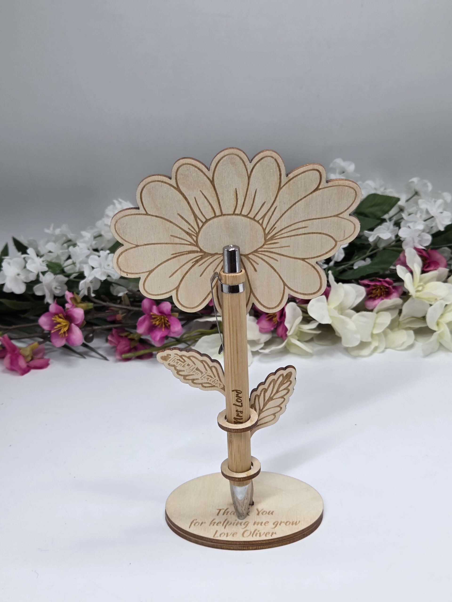 Stojak wykonany jest z naturalnego drewna w formie tulipana lub róży, z grawerem “Thank You Teacher” na listku oraz dedykacją na podstawce „Thank You for helping me grow”. W zestawie znajduje się elegancki, drewniany długopis prezent dla nauczyciela z możliwością wygrawerowania imienia lub krótkiego tekstu.