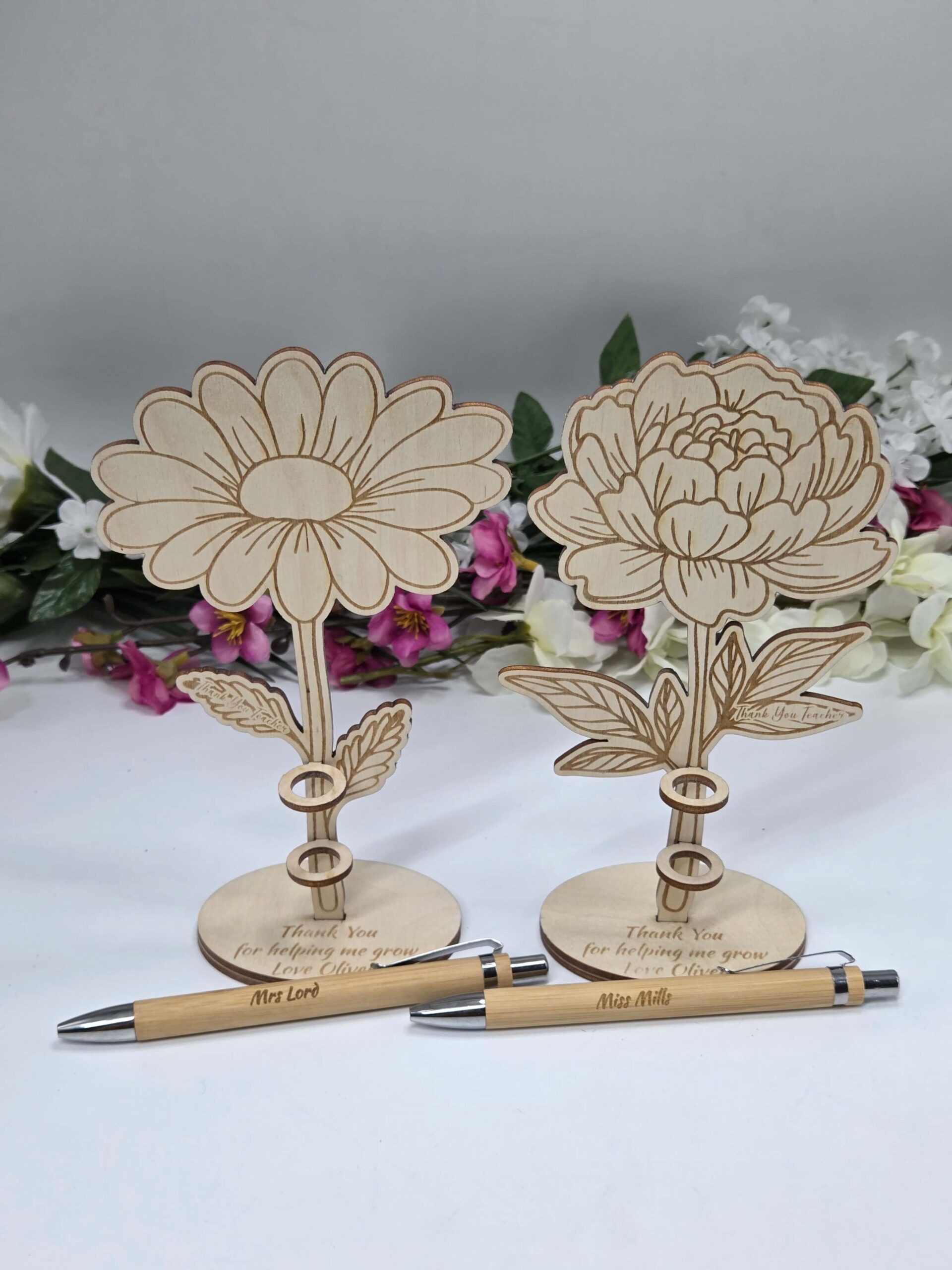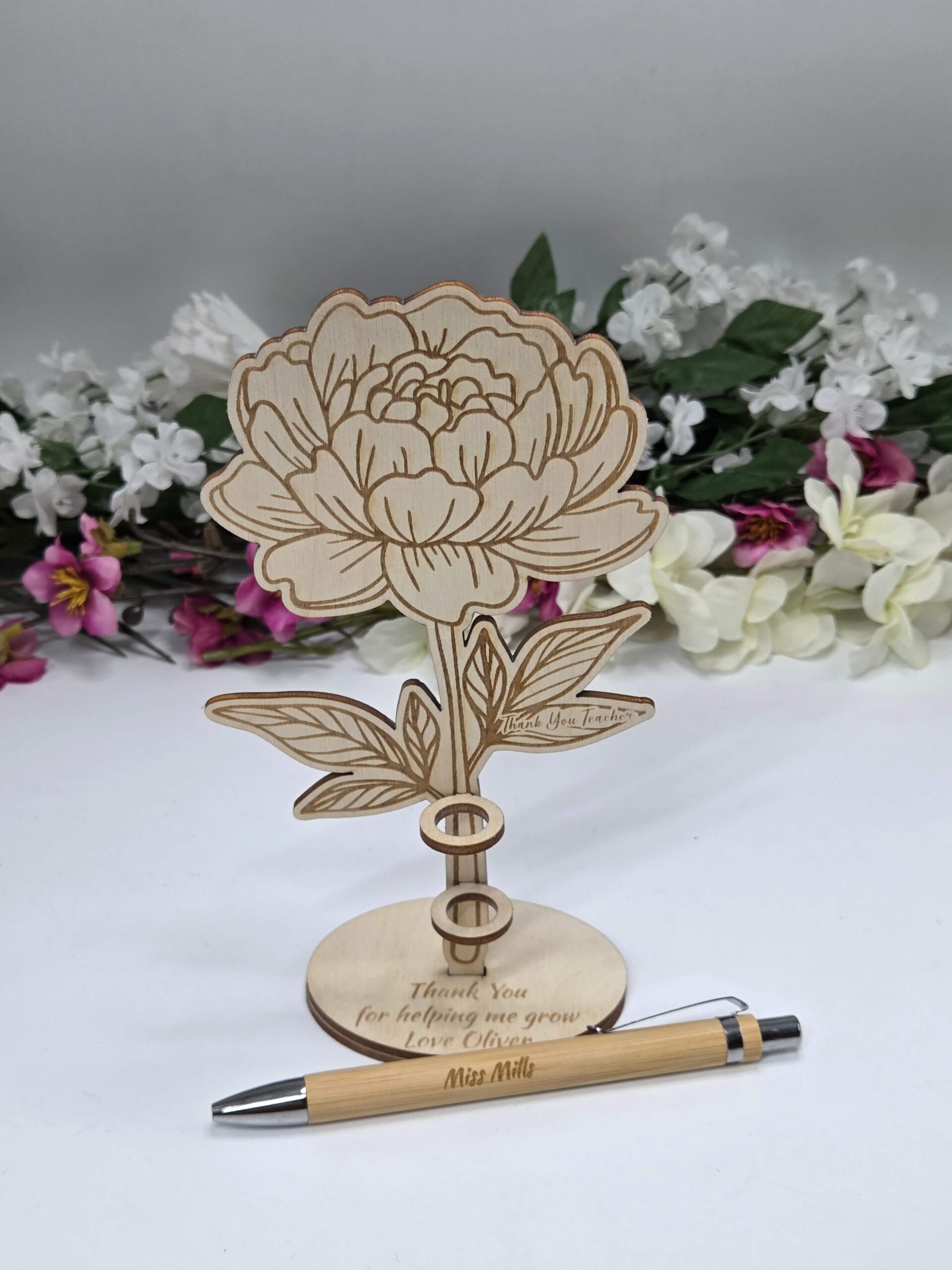 Drewniany stojak kwiatek z personalizacją + długopis dla nauczyciela PIWONIA