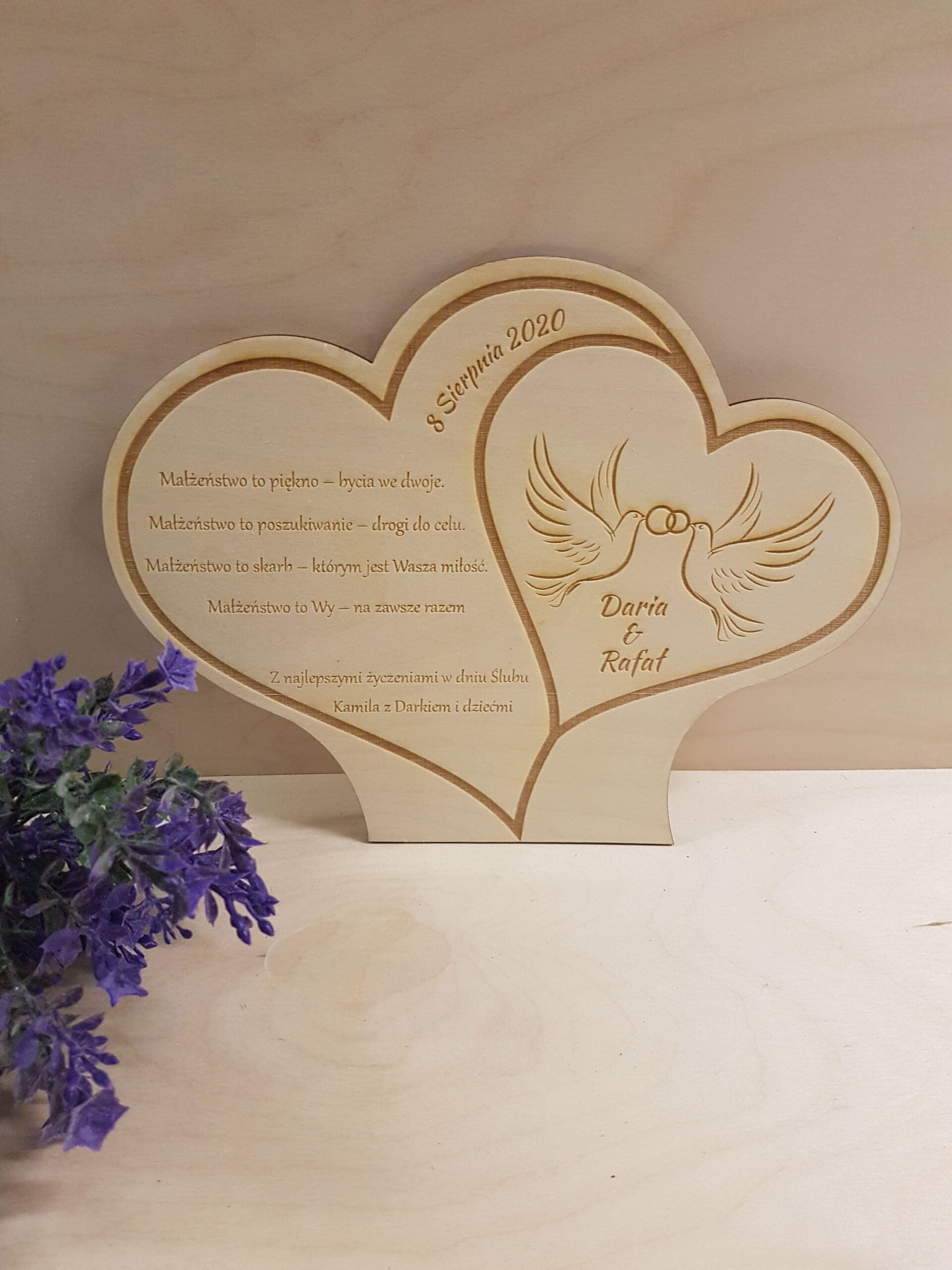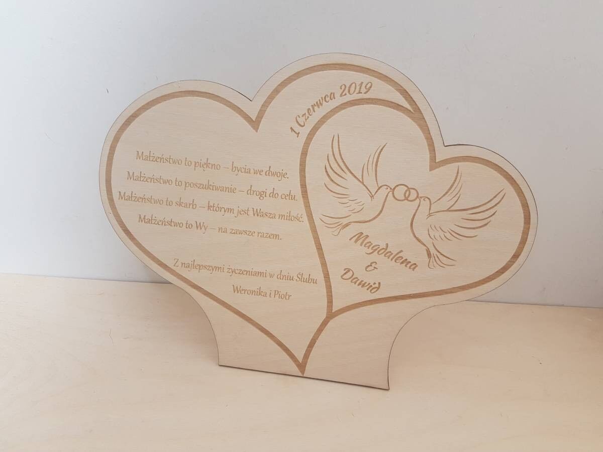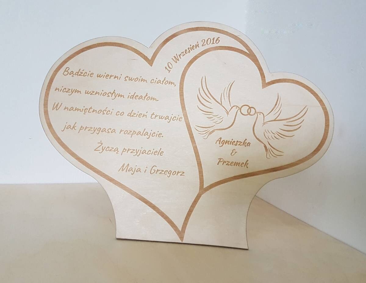 Duże grawerowane serce świetnie sprawdzi się jako prezent z okazji ślubu. Z pewnością ucieszy młodą parę. Na jego powierzchni znajdować się tekst grawerowany laserowo z Twoim podpisem. Dzięki temu upominek ma osobisty charakter i stanie się pamiątką na całe życie.