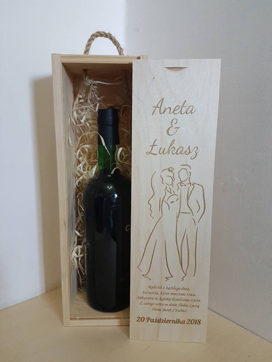 Szukasz wyjątkowego i eleganckiego prezentu ślubnego dla Młodej Pary? Nasza personalizowana drewniana skrzynka na alkohol to idealny wybór! Ta piękna i praktyczna skrzynka pomieści ulubione wino, szampana lub inny trunek, a dzięki możliwości personalizacji stanie się niezapomnianą pamiątką na lata.