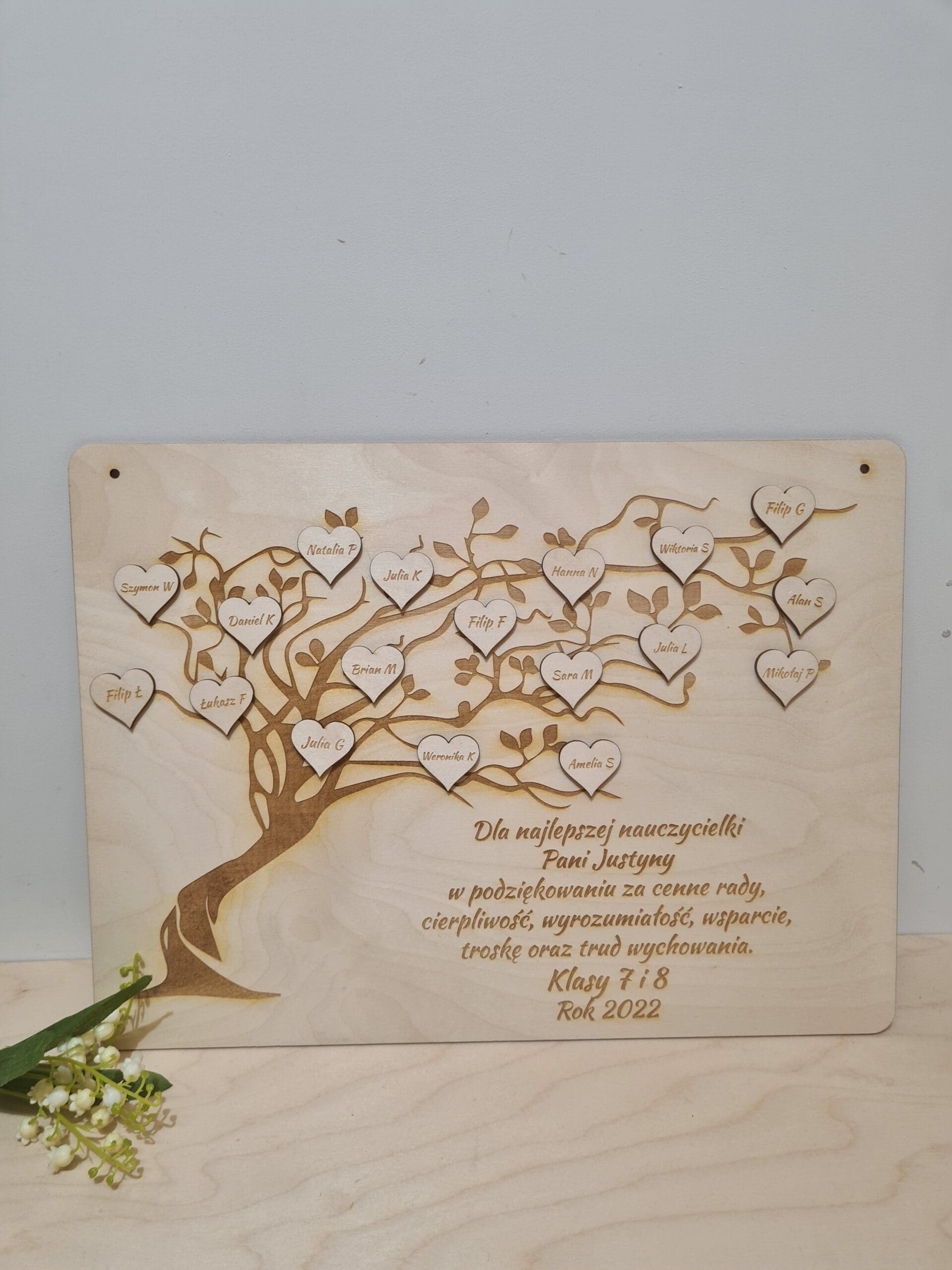 Unikalny Prezent dla Nauczyciela na Zakończenie Roku: Grawerowana Tabliczka z Drzewem z imionami dzieci w sercach