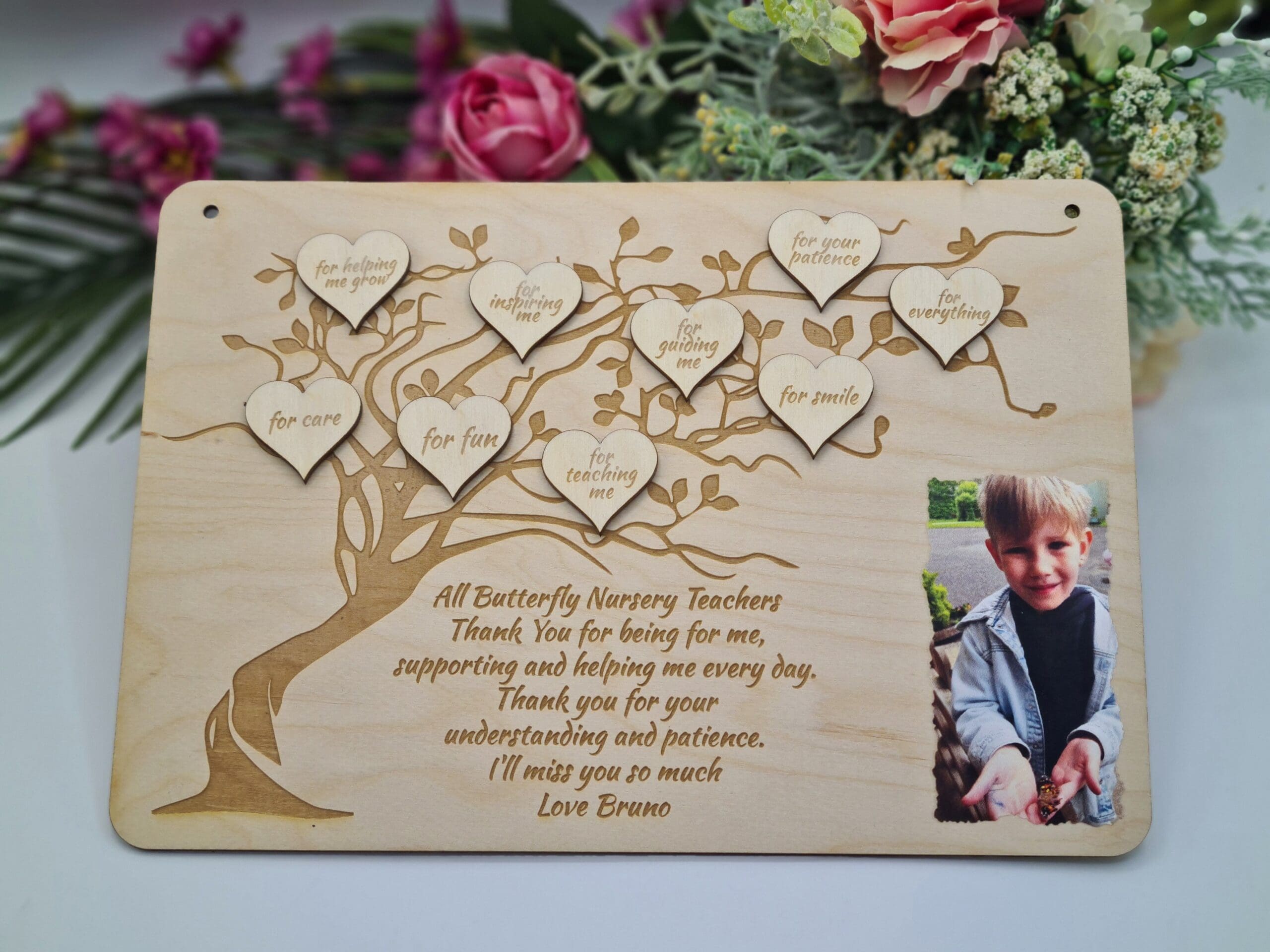 Unikalny Prezent dla Szkoły, Przedszkola na Zakończenie Roku: Grawerowana Tabliczka z Drzewem ze zdjęciem dziecka