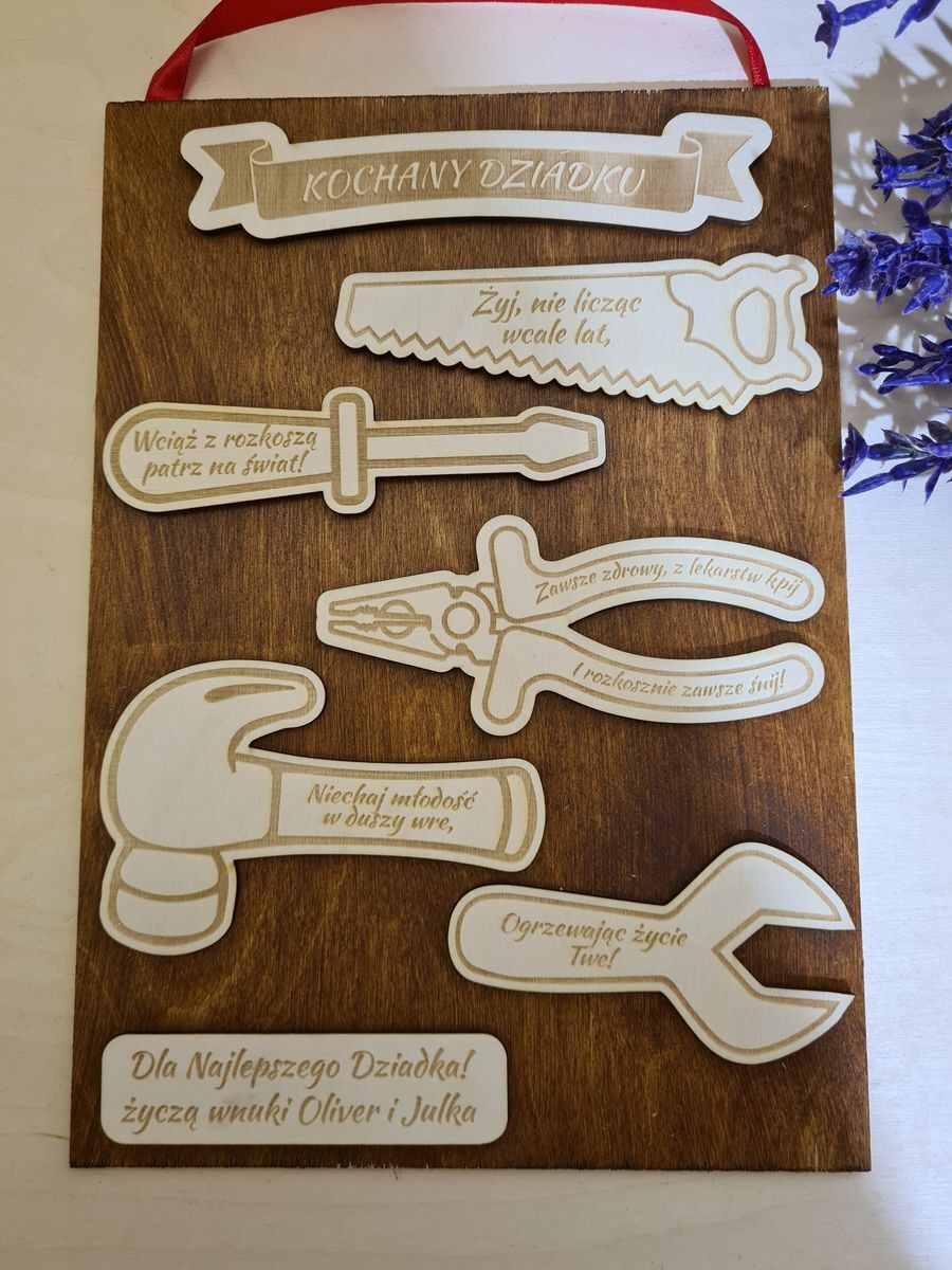 Duża grawerowana tabliczka z narzędziami idealnie sprawdzi się jako prezent dla dziadka.