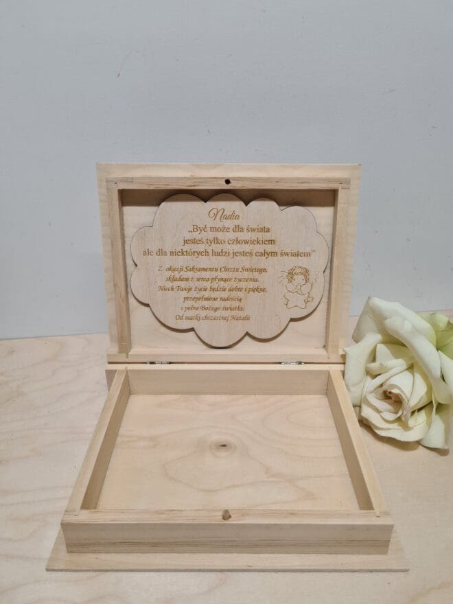 Uwiecznij piękne wspomnienia Chrztu Świętego w wyjątkowym, drewnianym pudełku w kształcie książki. Personalizowany grawerunek z imieniem dziecka, datą uroczystości i życzeniami czyni ten prezent niepowtarzalnym. Idealne do przechowywania biblii, kartek z życzeniami, medalików czy innych pamiątek z chrztu. Wykonane z naturalnego drewna, solidne i eleganckie.