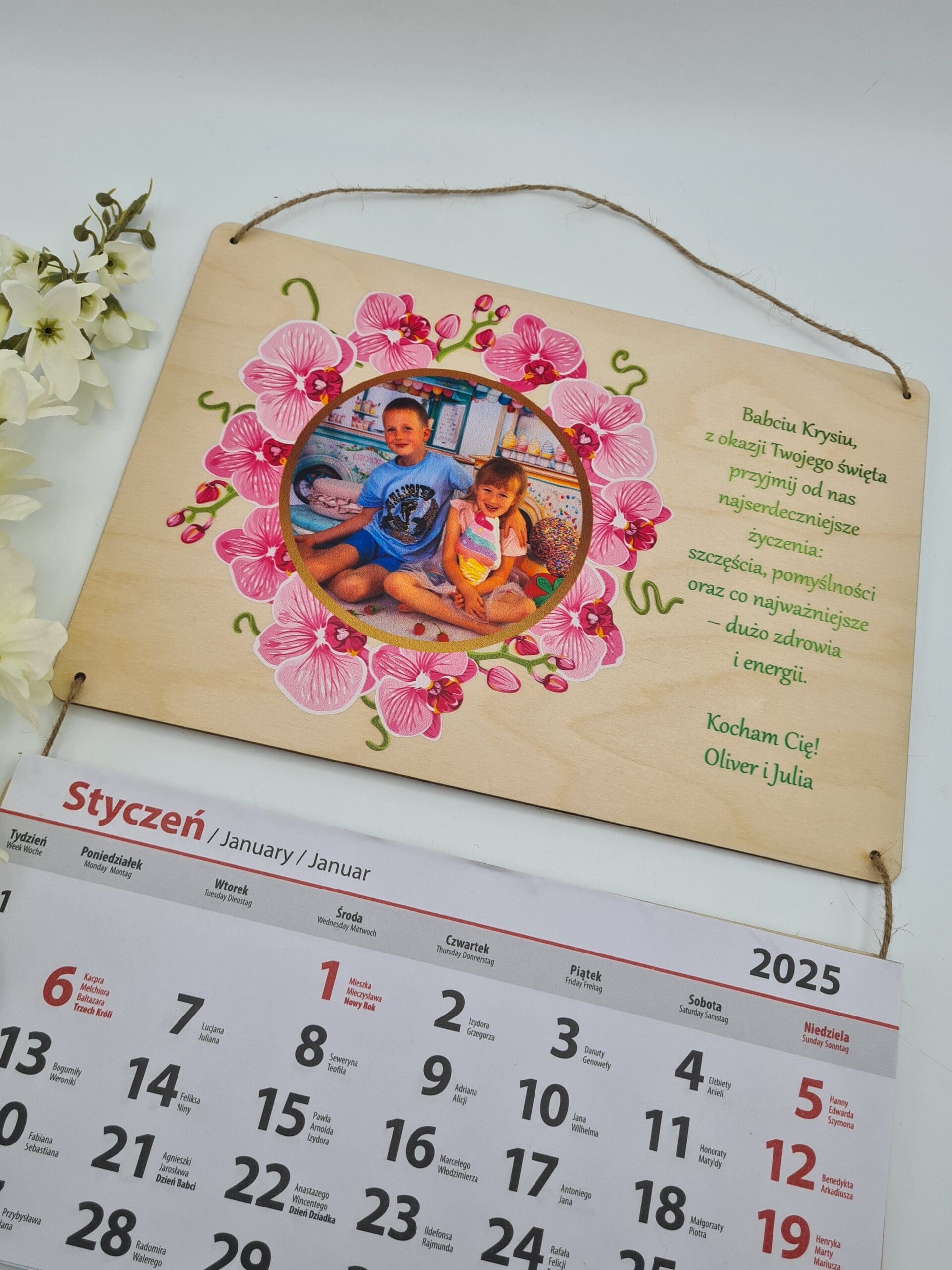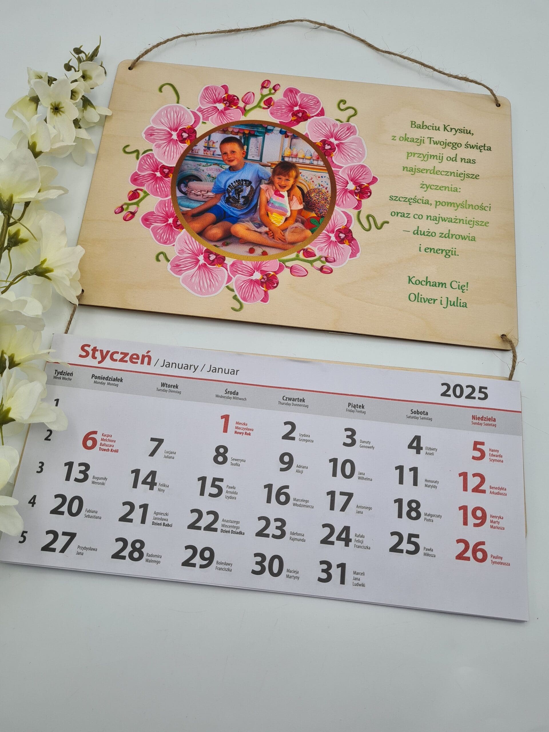 Szukasz wyjątkowego prezentu dla swojej babci? 🌸 Kalendarz na rok 2025 z personalizowaną dedykacją i zdjęciem to idealny upominek, który łączy funkcjonalność z emocjonalnym akcentem.