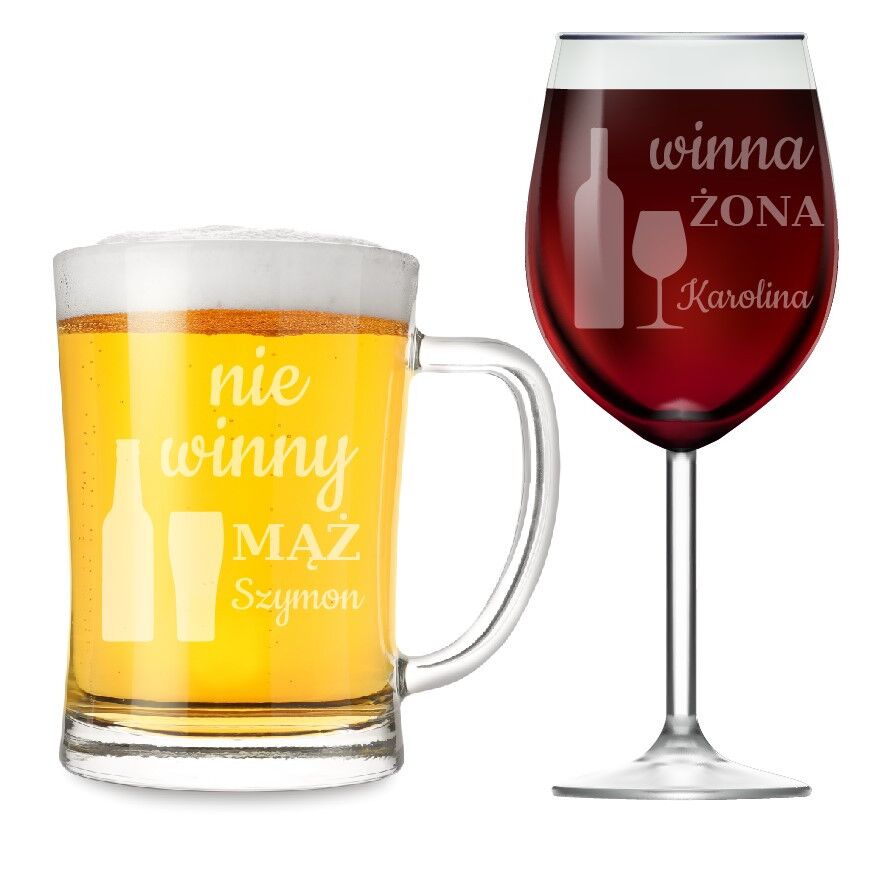 - Na kieliszku widnieje imię wskazane przez klienta i napis „winna żona” z grafiką kieliszka i butelki wina. Na kuflu podobnie jak na kieliszku umieszczone są wskazane imię, napis „niewinny mąż” oraz grafika szklanki i butelki piwa.