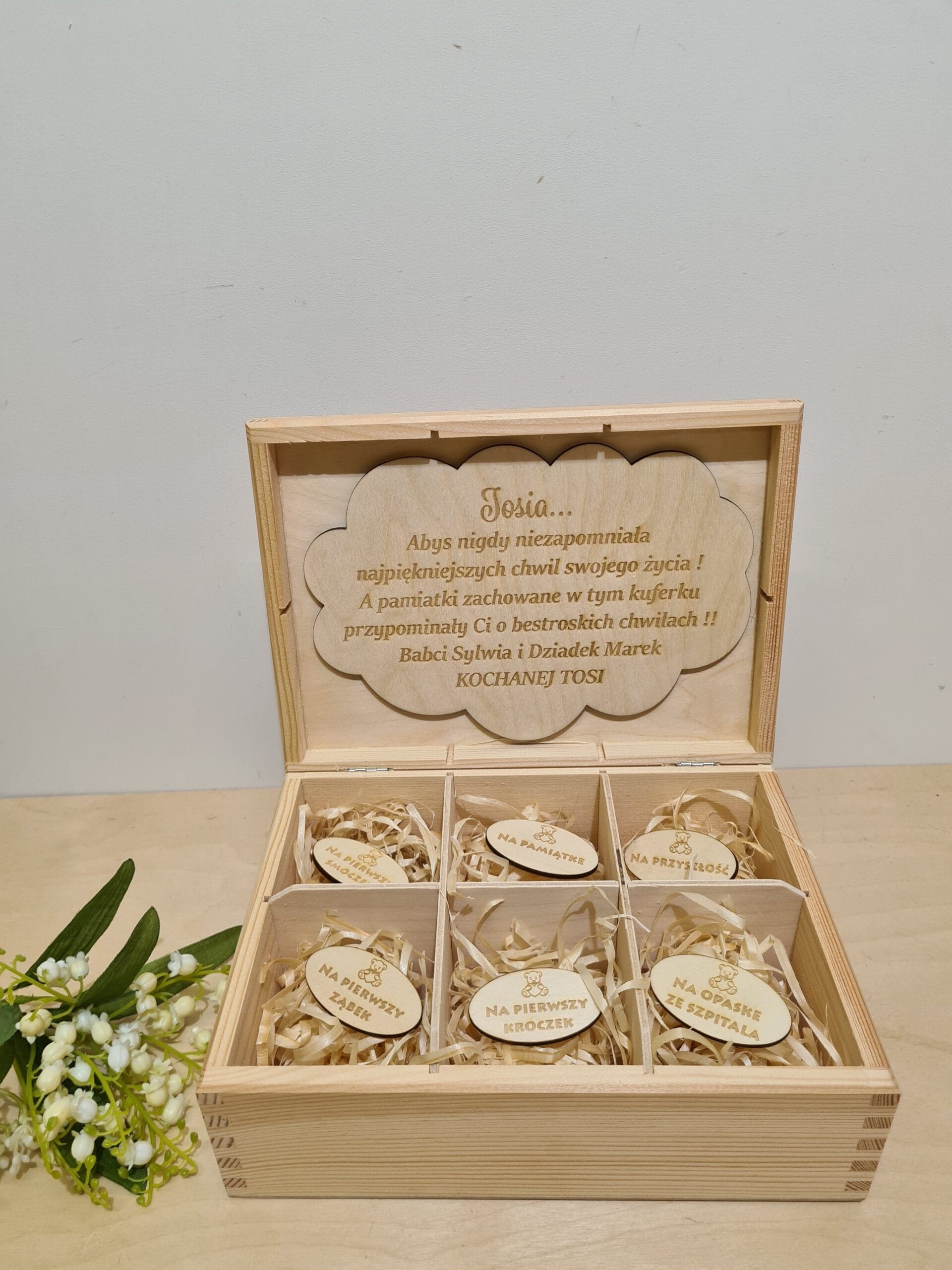 Szukasz wyjątkowego prezentu na narodziny dziecka? Nasz personalizowany kuferek „Miś z Balonikami” to idealny wybór! Ta urocza, drewniana skrzynka to nie tylko piękna pamiątka, ale i praktyczny schowek na pierwsze skarby maluszka: smoczek, opaskę ze szpitala, pierwszy ząbek czy ulubioną grzechotkę.