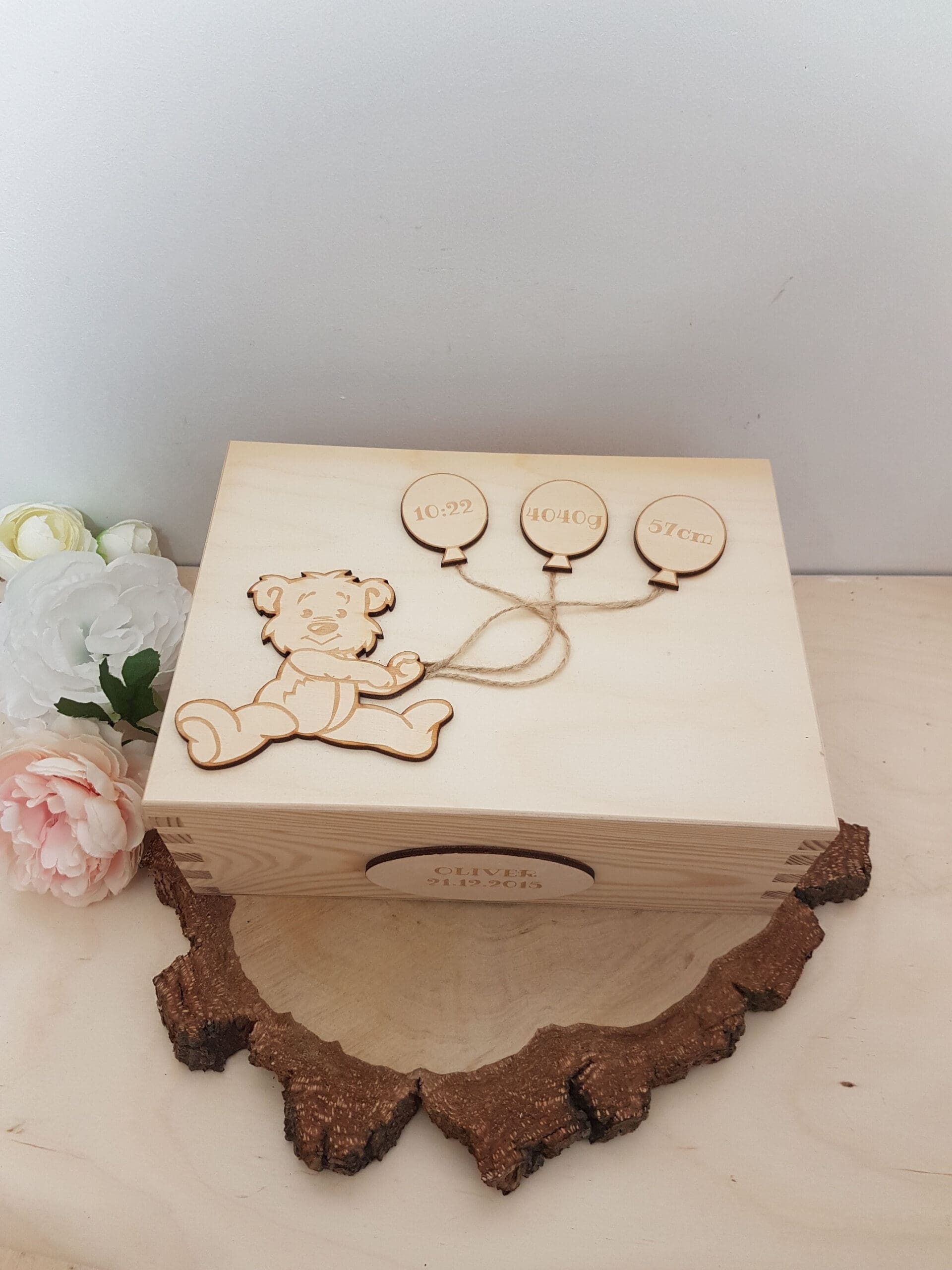 Kuferek Prezent na Narodziny | Drewniana Skrzynka „Miś z Balonikami” | Personalizowany Upominek dla Niemowlaka
