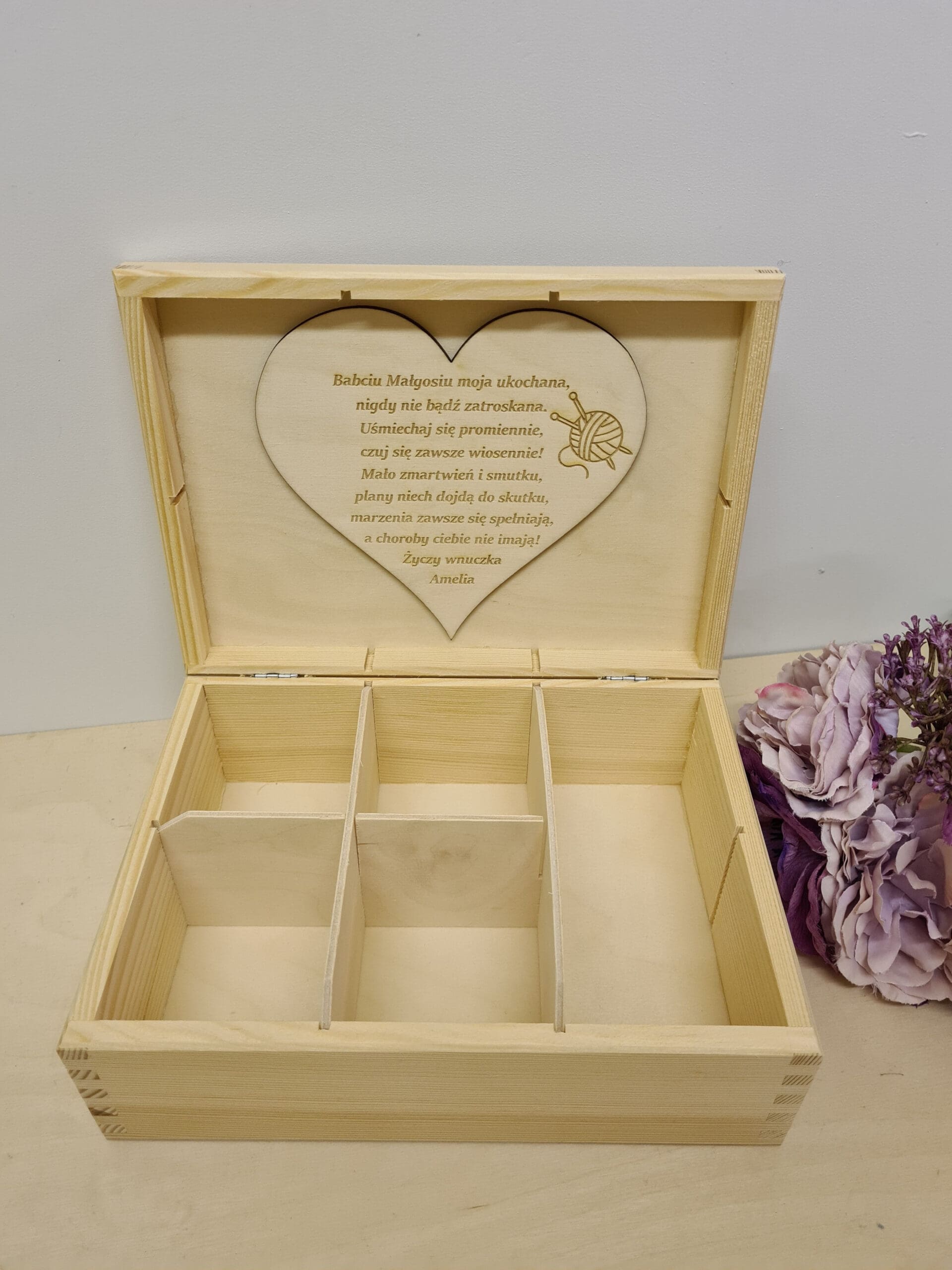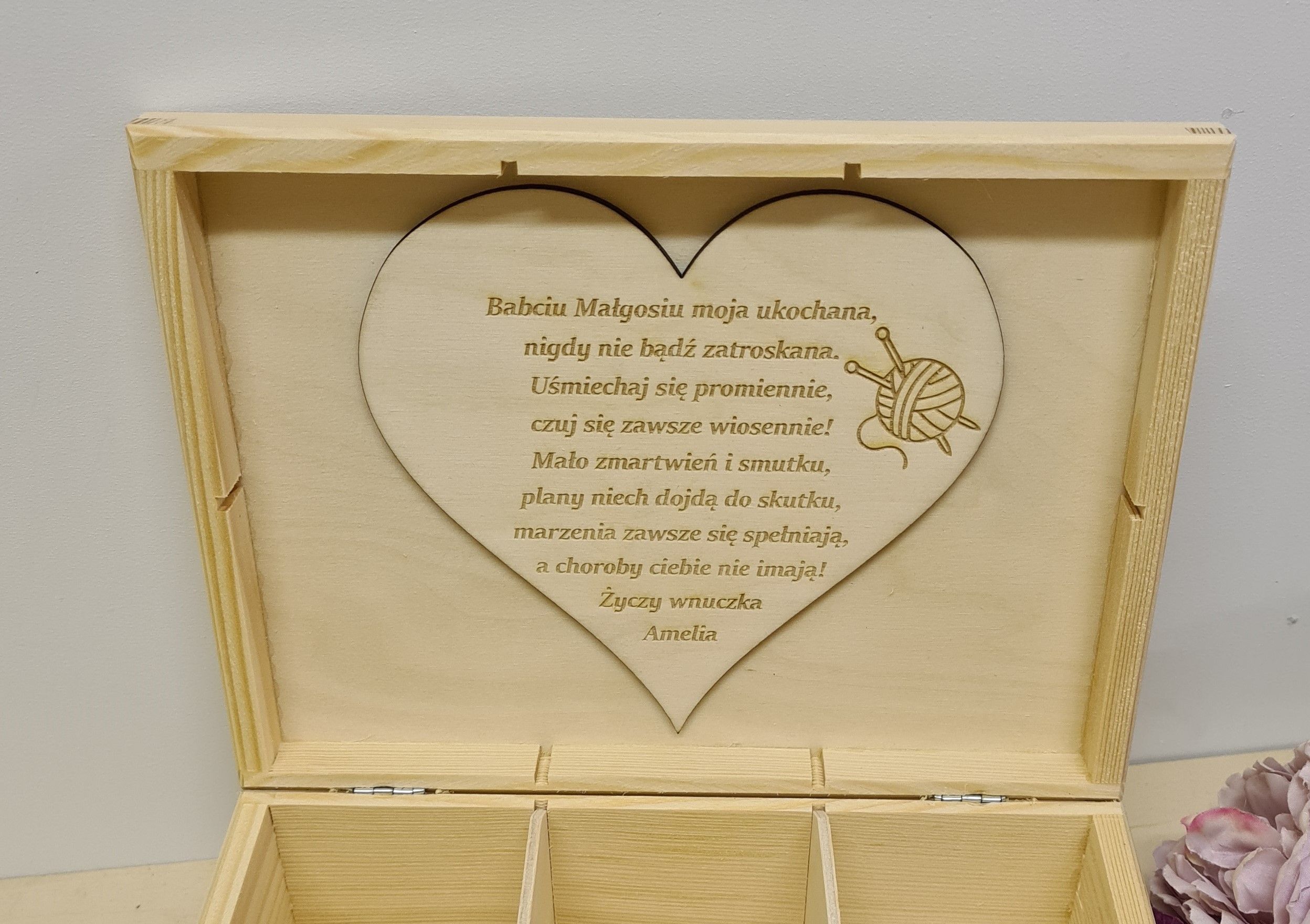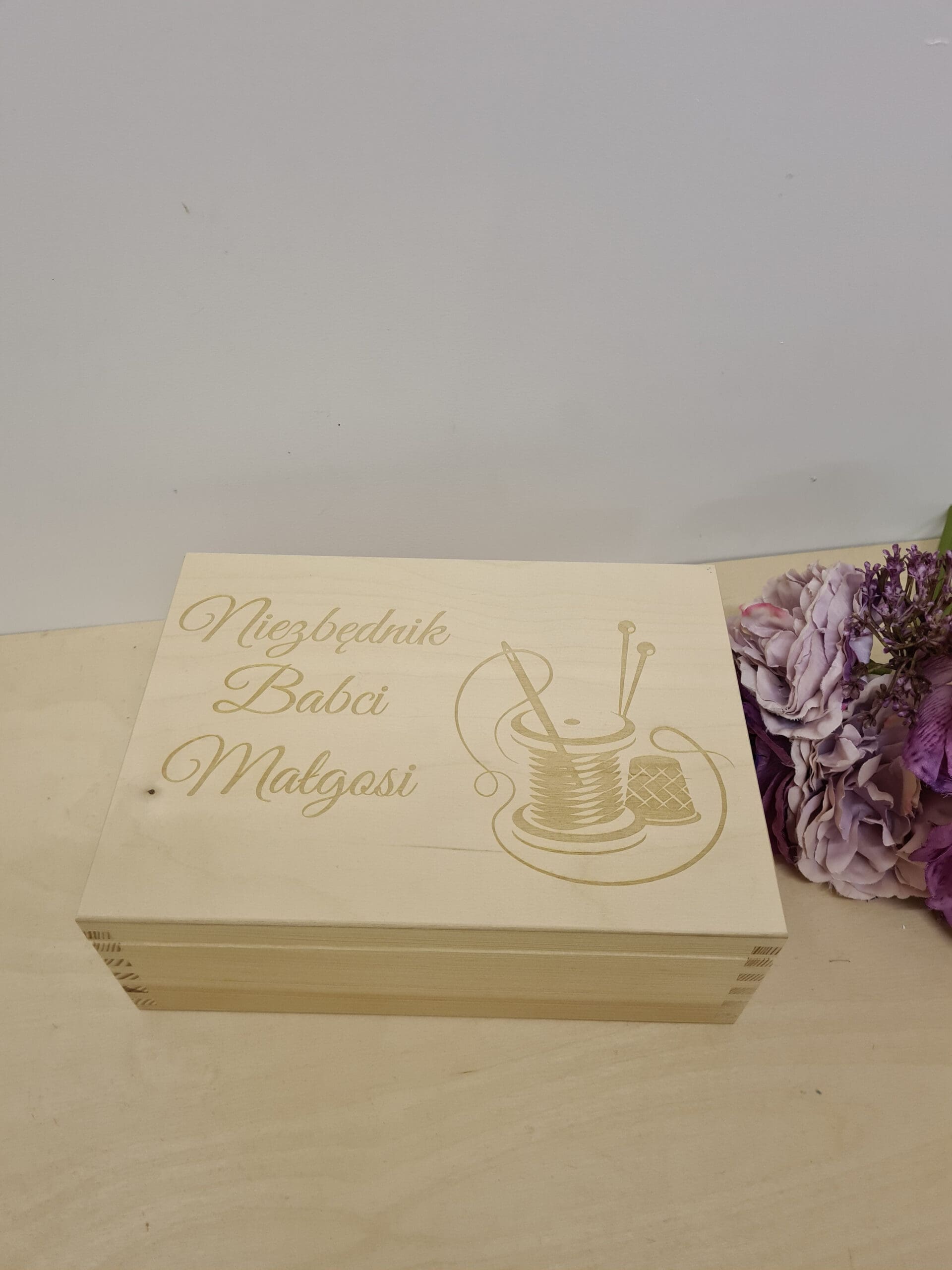 Piękna skrzynka z grawerem, która pełni rolę przybornika do szycia to bardzo fajna propozycja na prezent dla Babci.