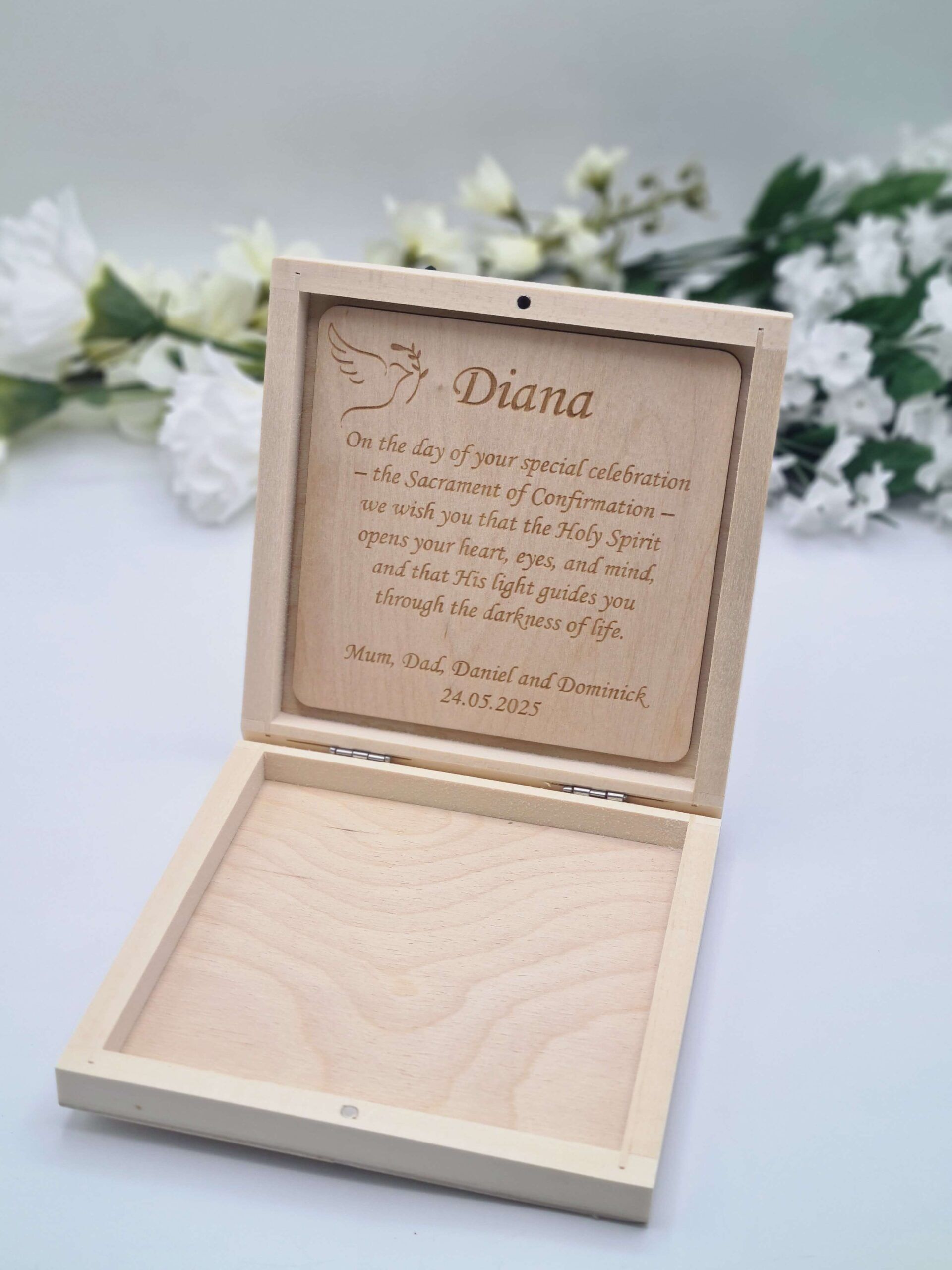 Pamiątka Bierzmowania – Drewniana Koperta na Pieniądze z Grawerem w języku angielskim