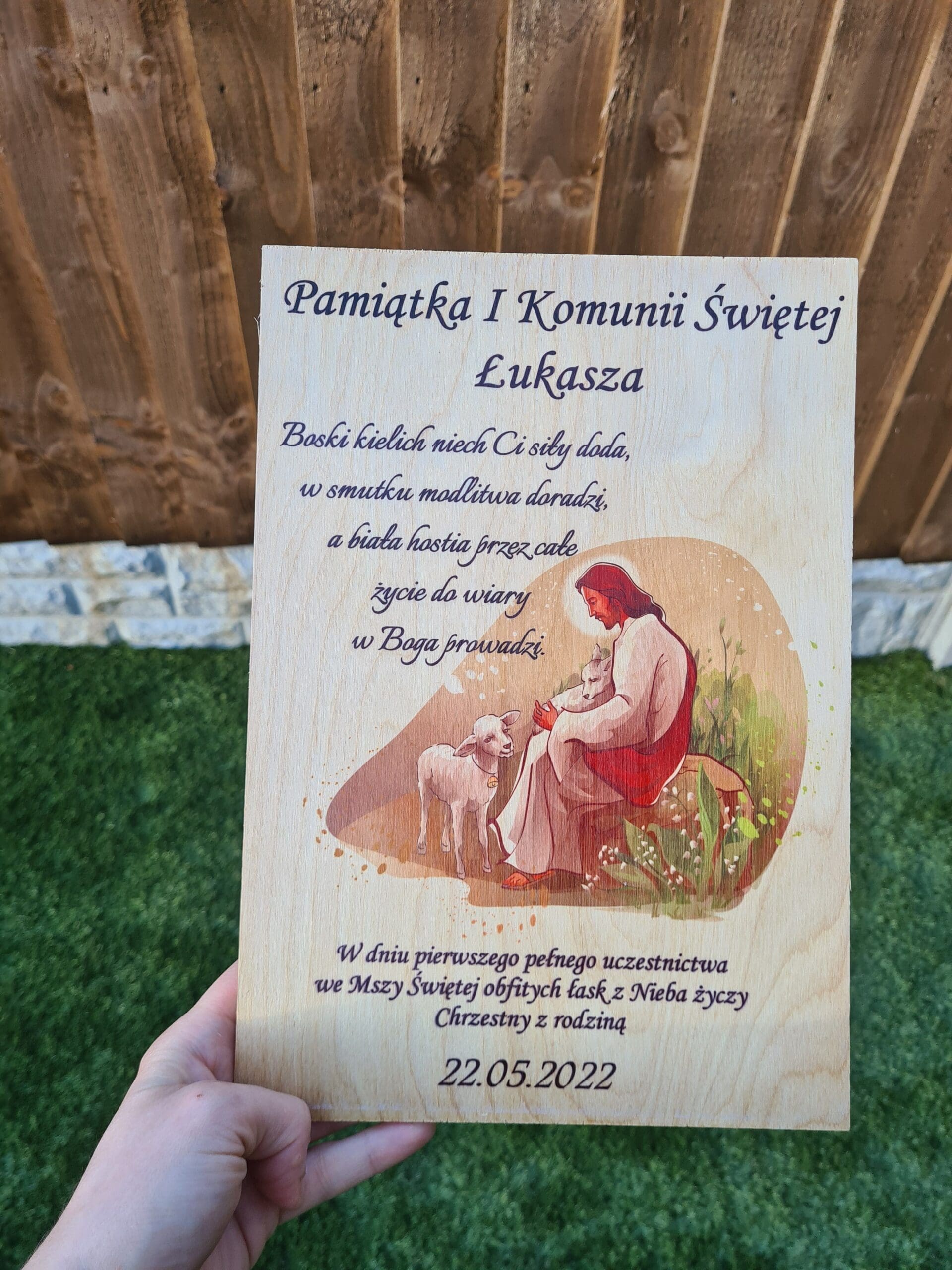 Drewniana tabliczka do postawienia, świetnie sprawdzi się jako prezent z okazji Pierwszej Komunii Świętej.