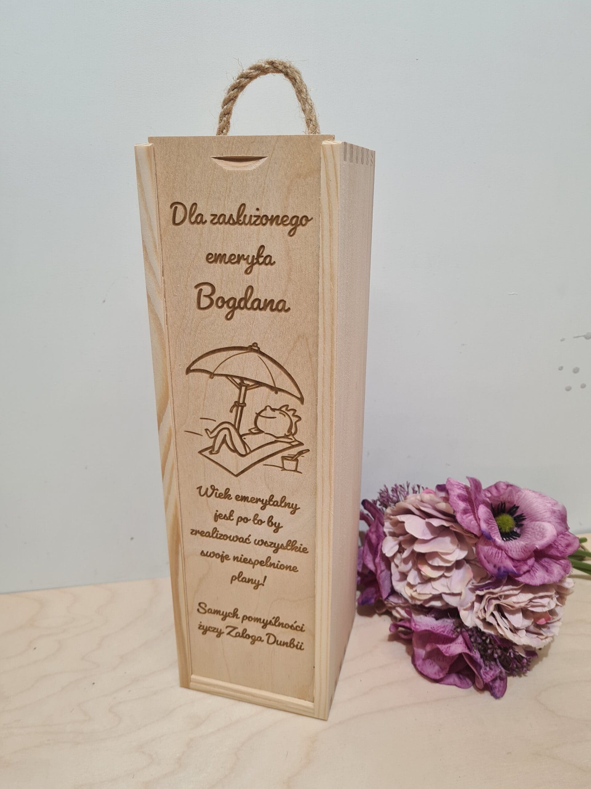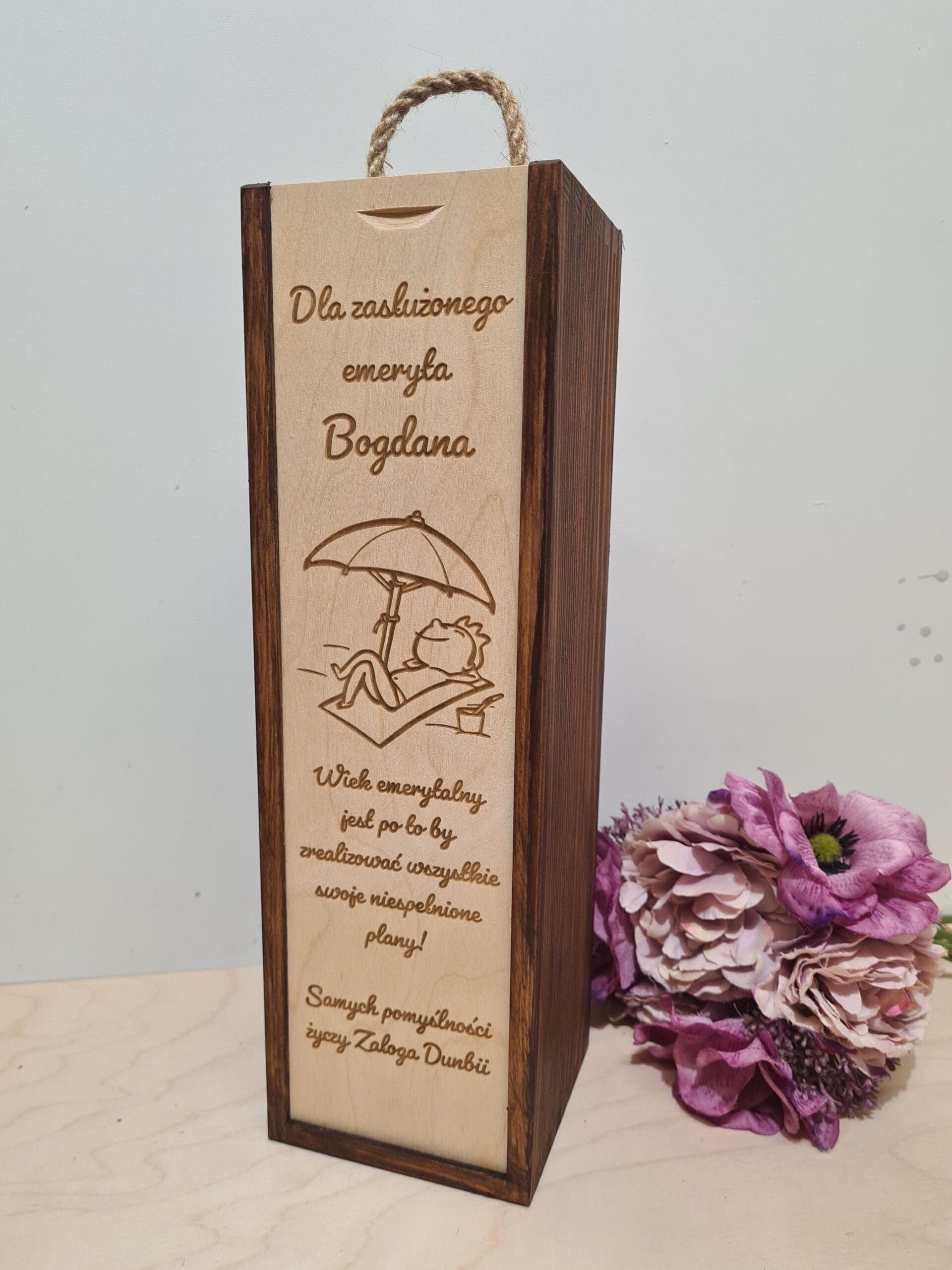 Szukasz niezapomnianego prezentu z okazji przejścia na emeryturę? Ta personalizowana, drewniana skrzynka na alkohol to idealny sposób, aby wyrazić uznanie dla zasłużonego emeryta. Wykonaliśmy tę skrzynkę z wysokiej jakości drewna, dzięki czemu jest nie tylko piękna, ale także praktyczna. Możliwość dodania osobistego grawerunku sprawia, że prezent staje się jeszcze bardziej wyjątkowy i sentymentalny.