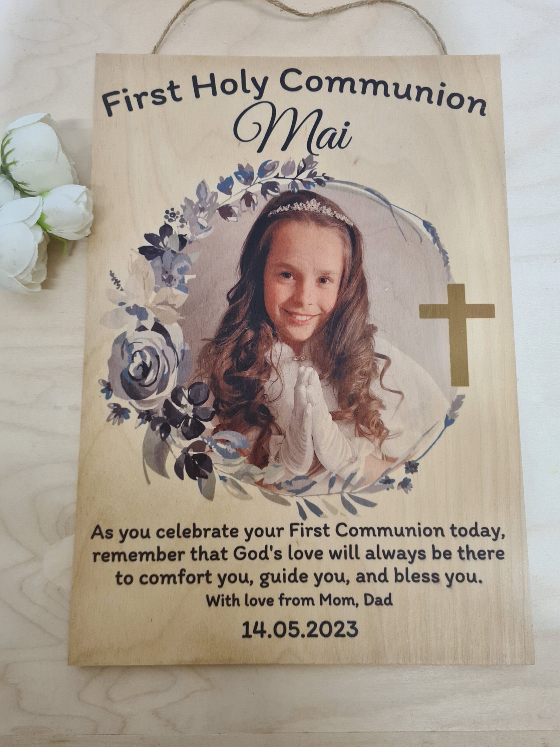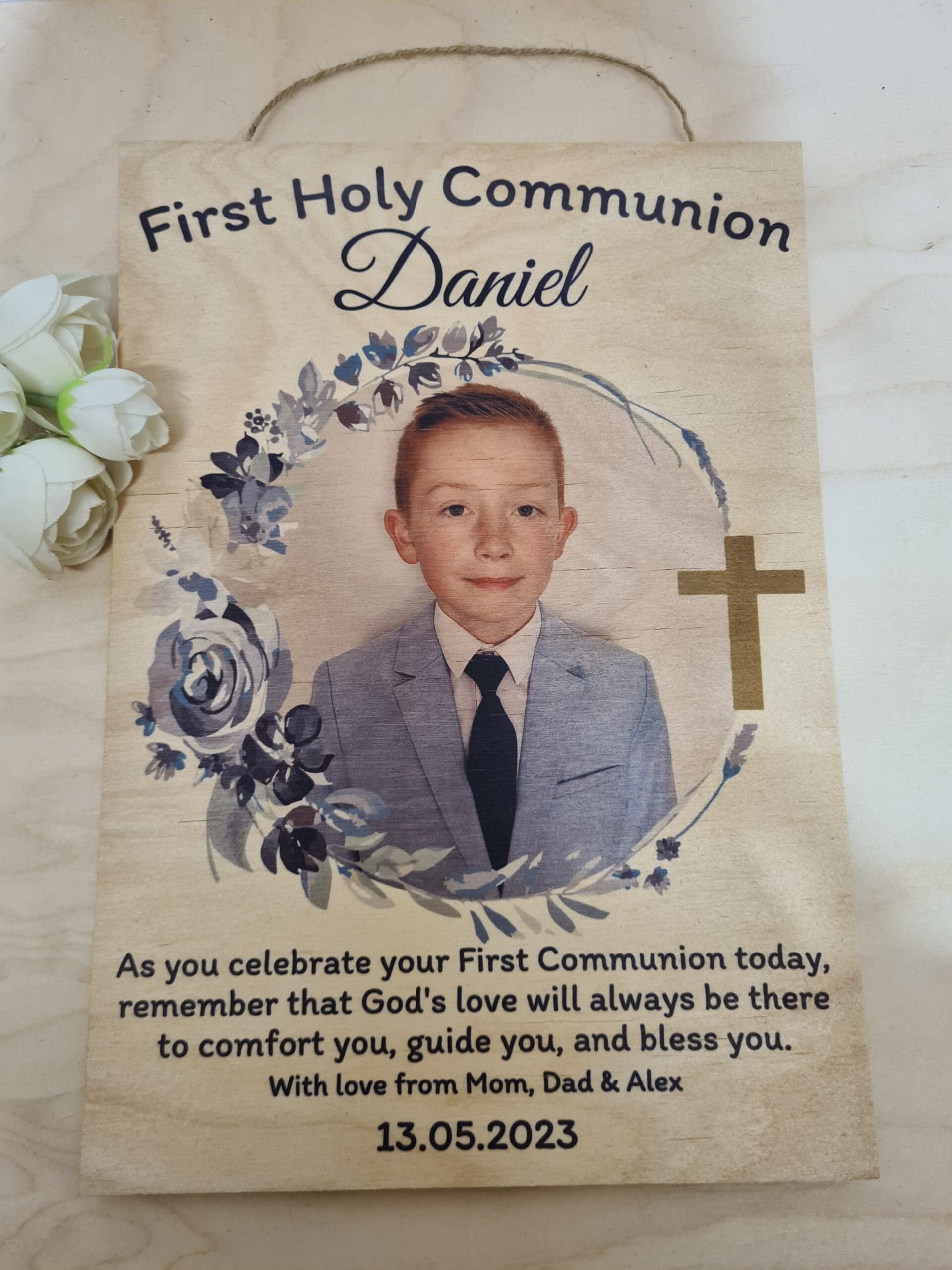 Spersonalizowana Pamiątka Pierwszej Komunii Świętej w formie Tabliczki drewnianej do zawieszenia na ścianie ze zdjęciem oraz tekstem własnej dedykacji to hit tegorocznych Pamiątek komunijnych.