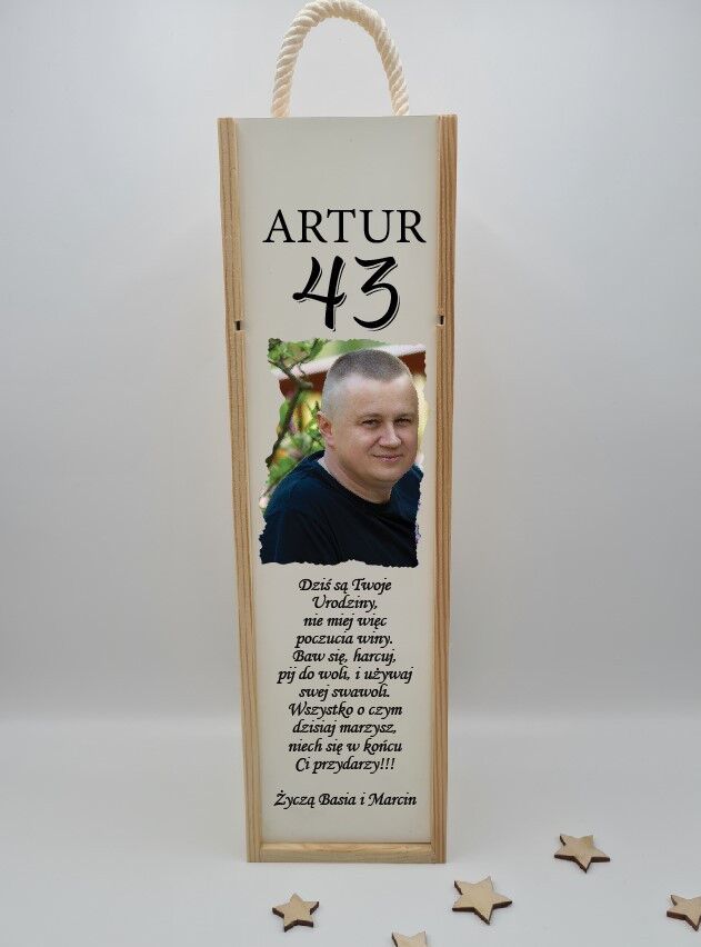 Niepowtarzalna skrzynka na butelkę z personalizowanym drukiem oraz zdjeciem,to prezent, który z pewnością sprawi radość obdarowanemu i sprawi, że Twój wyjątkowy gest będzie na długo zapamiętany. Idealnie pasuje na prezent urodzinowy.