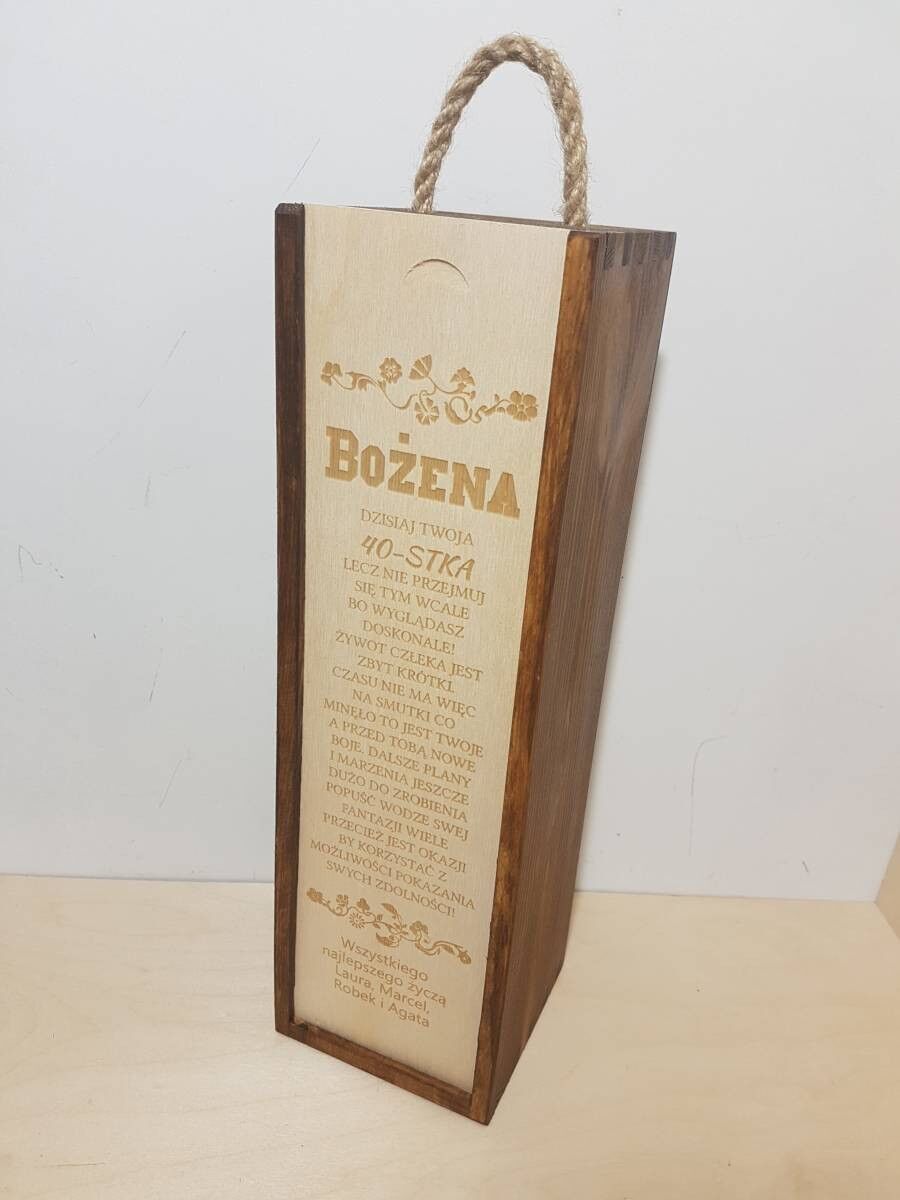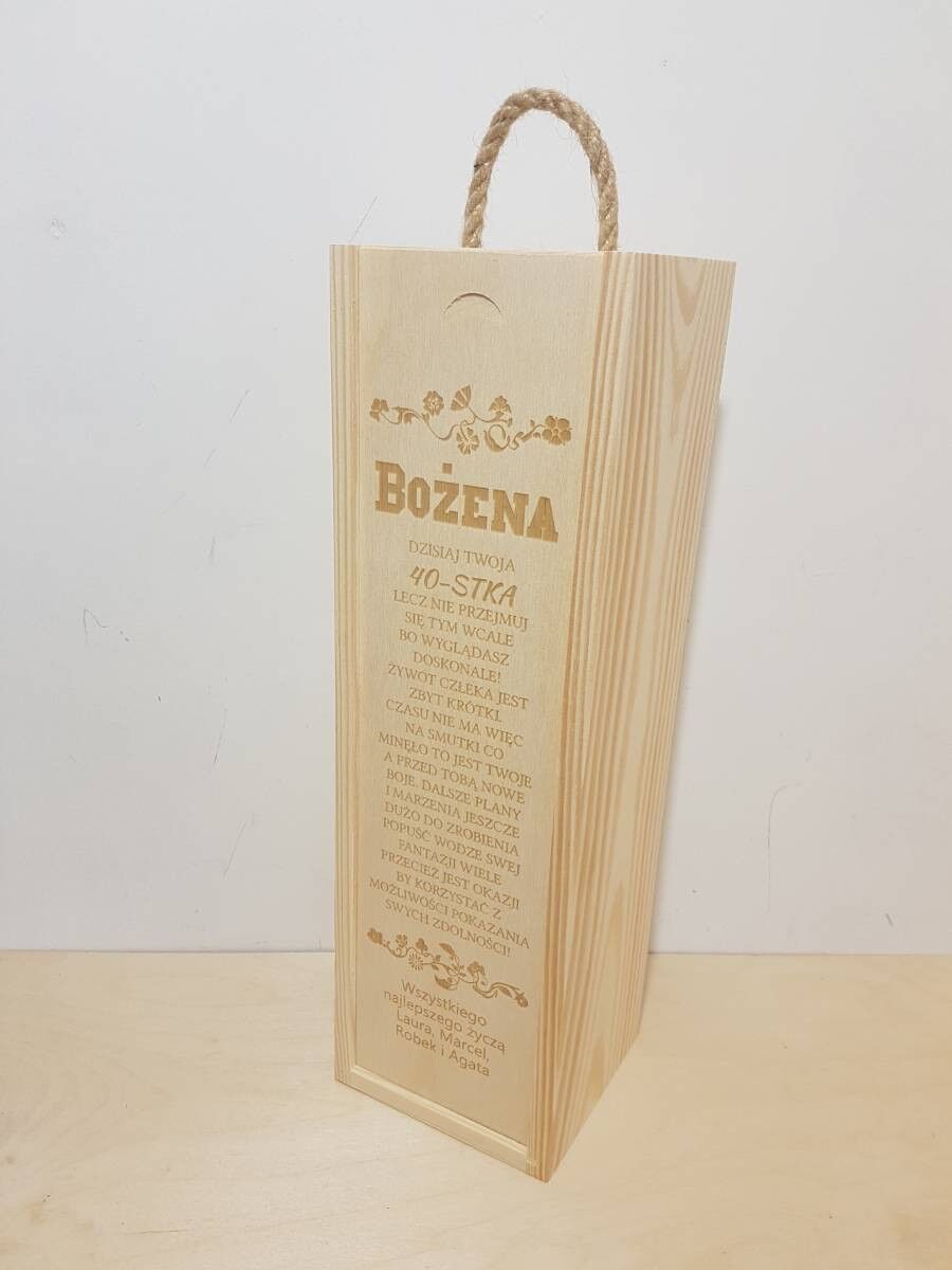 Niepowtarzalna skrzynka na butelkę z personalizowanym grawerem, to prezent, który z pewnością ucieszy każdego i sprawi, że Twój wyjątkowy gest będzie na długo zapamiętany. Idealnie pasuje na prezent urodzinowy. Każda skrzynka wypełniona jest wełną drewnianą którą dodajemy gratis.