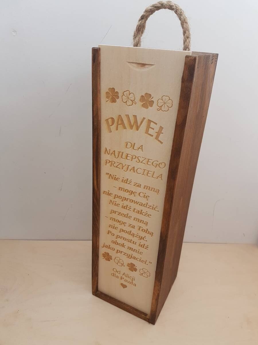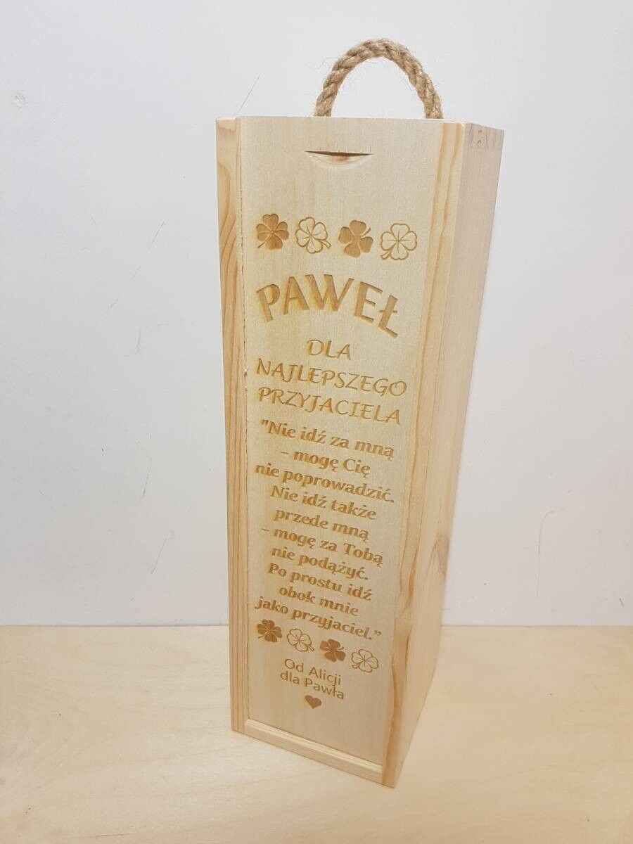 Niepowtarzalna skrzynka na butelkę z personalizowanym grawerem,to prezent, który z pewnością ucieszy przyjaciela i sprawi, że Twój wyjątkowy gest będzie na długo zapamiętany. Idealnie pasuje na prezent urodzinowy. Każda skrzynka wypełniona jest wełną drewnianą którą dodajemy gratis.