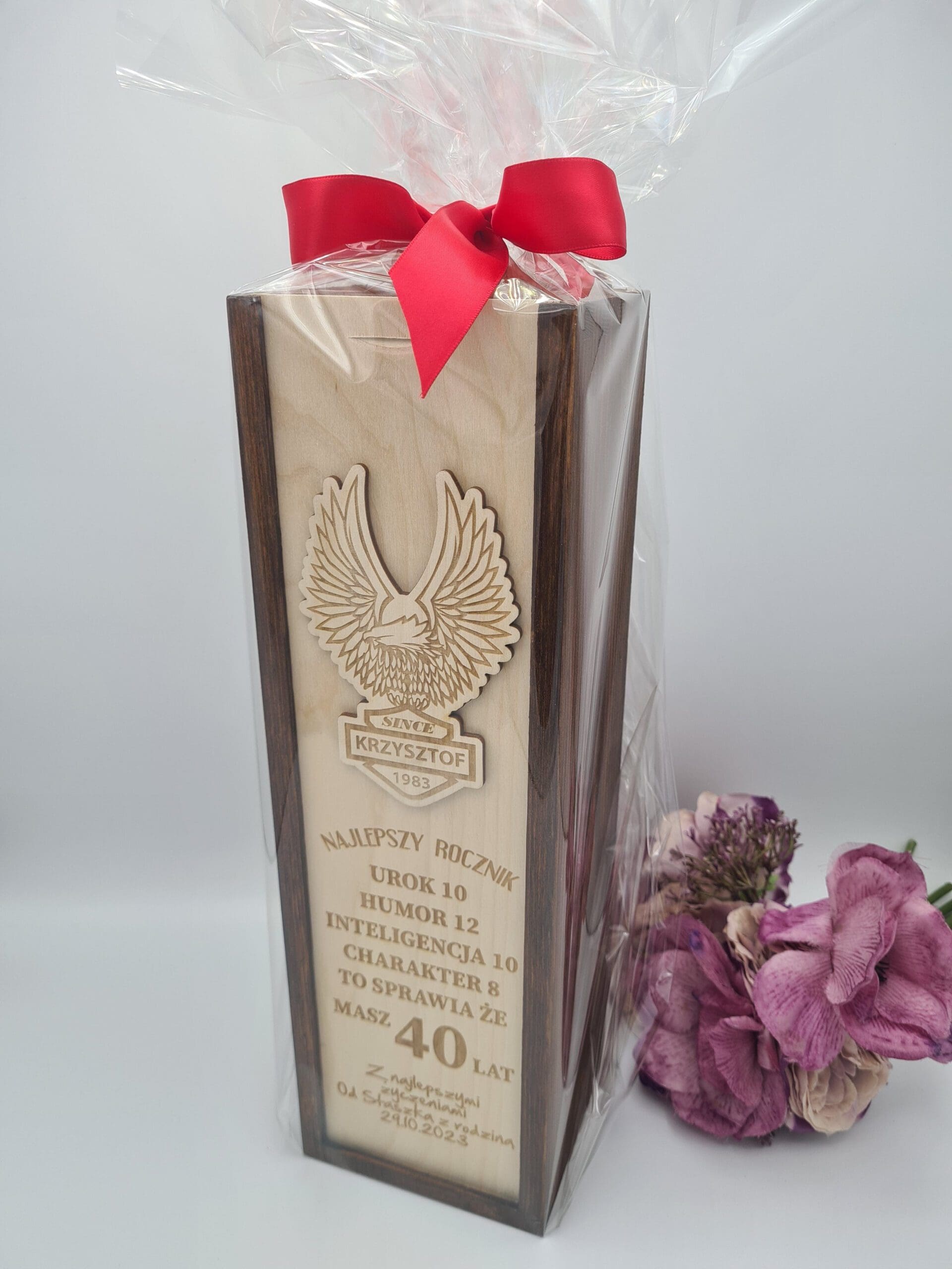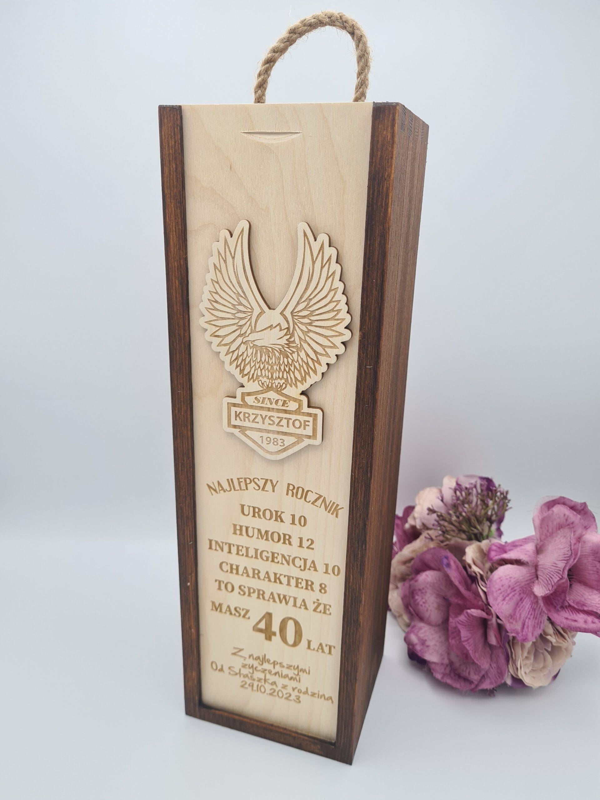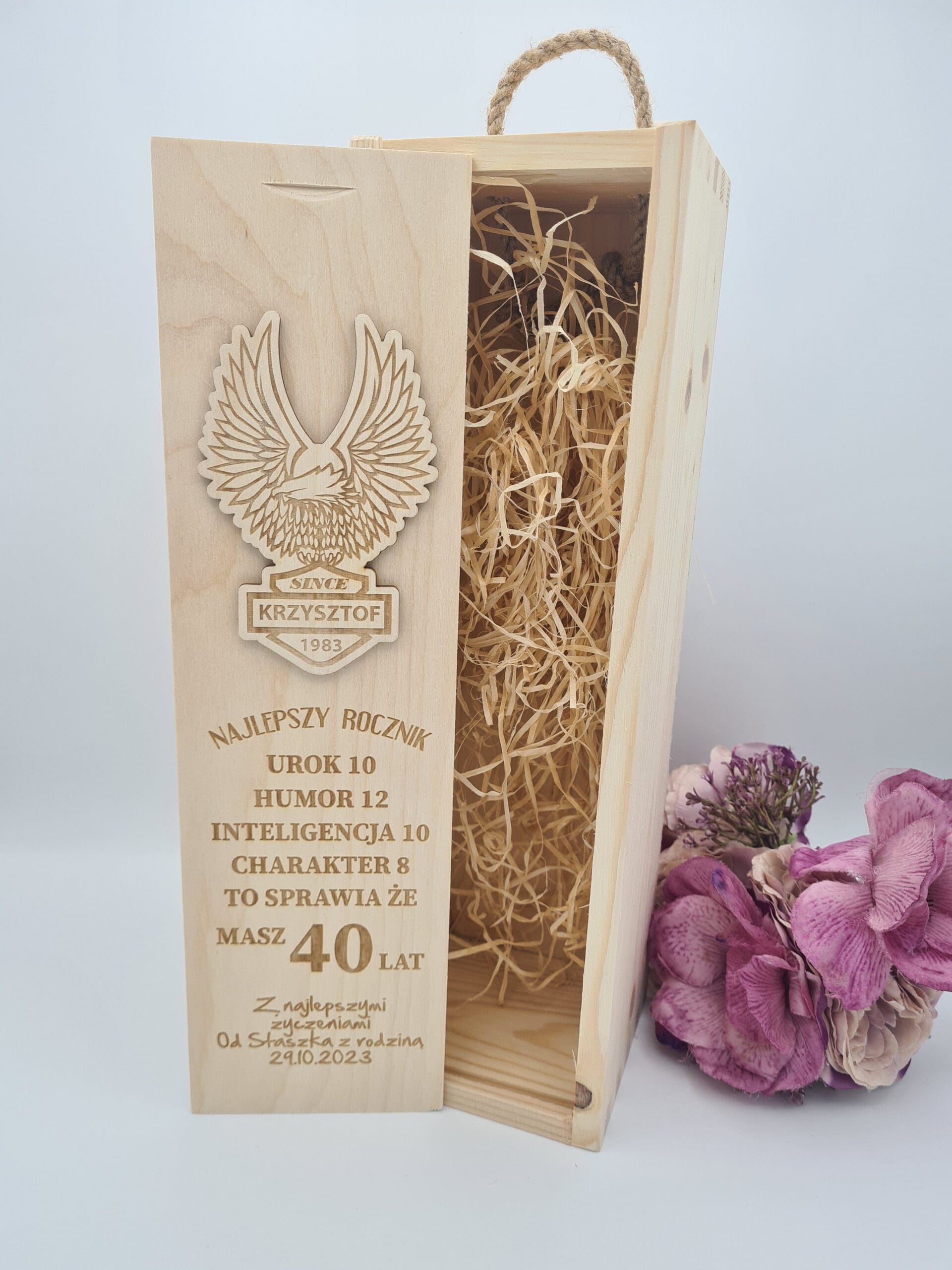 Niepowtarzalna skrzynka na butelkę z personalizowanym grawerem,to prezent, który z pewnością ucieszy każdego i sprawi, że Twój wyjątkowy gest będzie na długo zapamiętany. Idealnie pasuje na prezent urodzinowy. Każda skrzynka wypełniona jest wełną drewnianą którą dodajemy gratis.