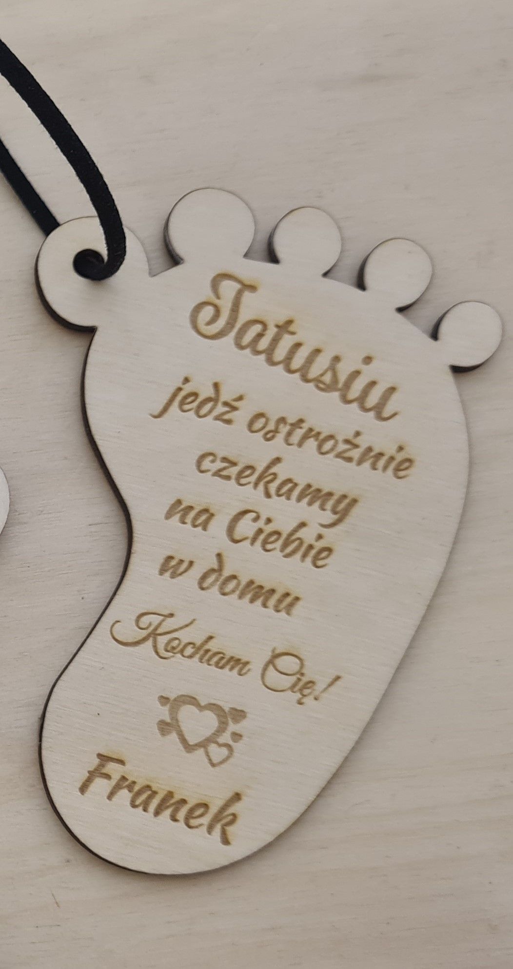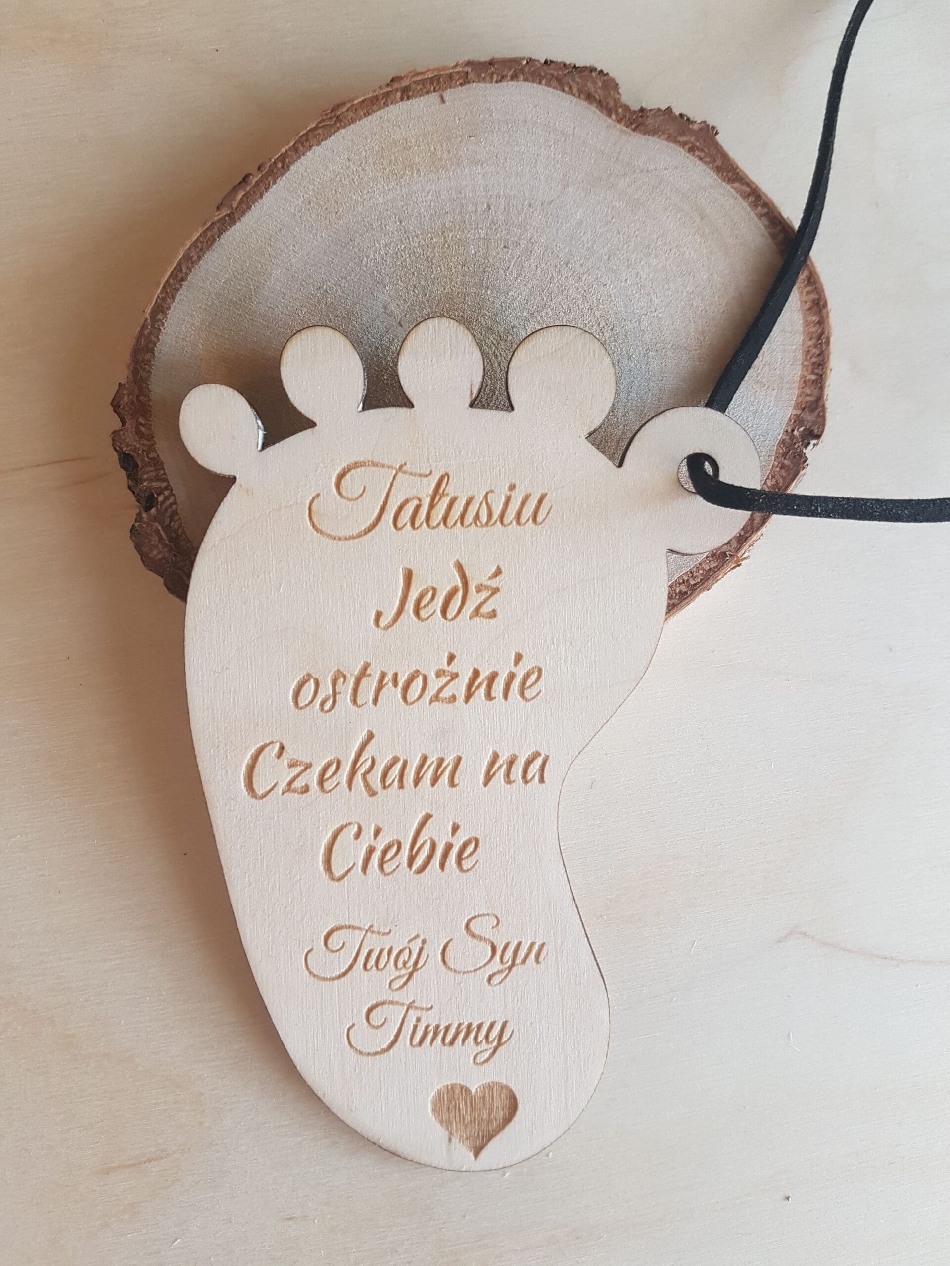 Drewniana zawieszka do auta w kształcie stópki z napisem będzie wspaniałą niespodzianką dla taty.