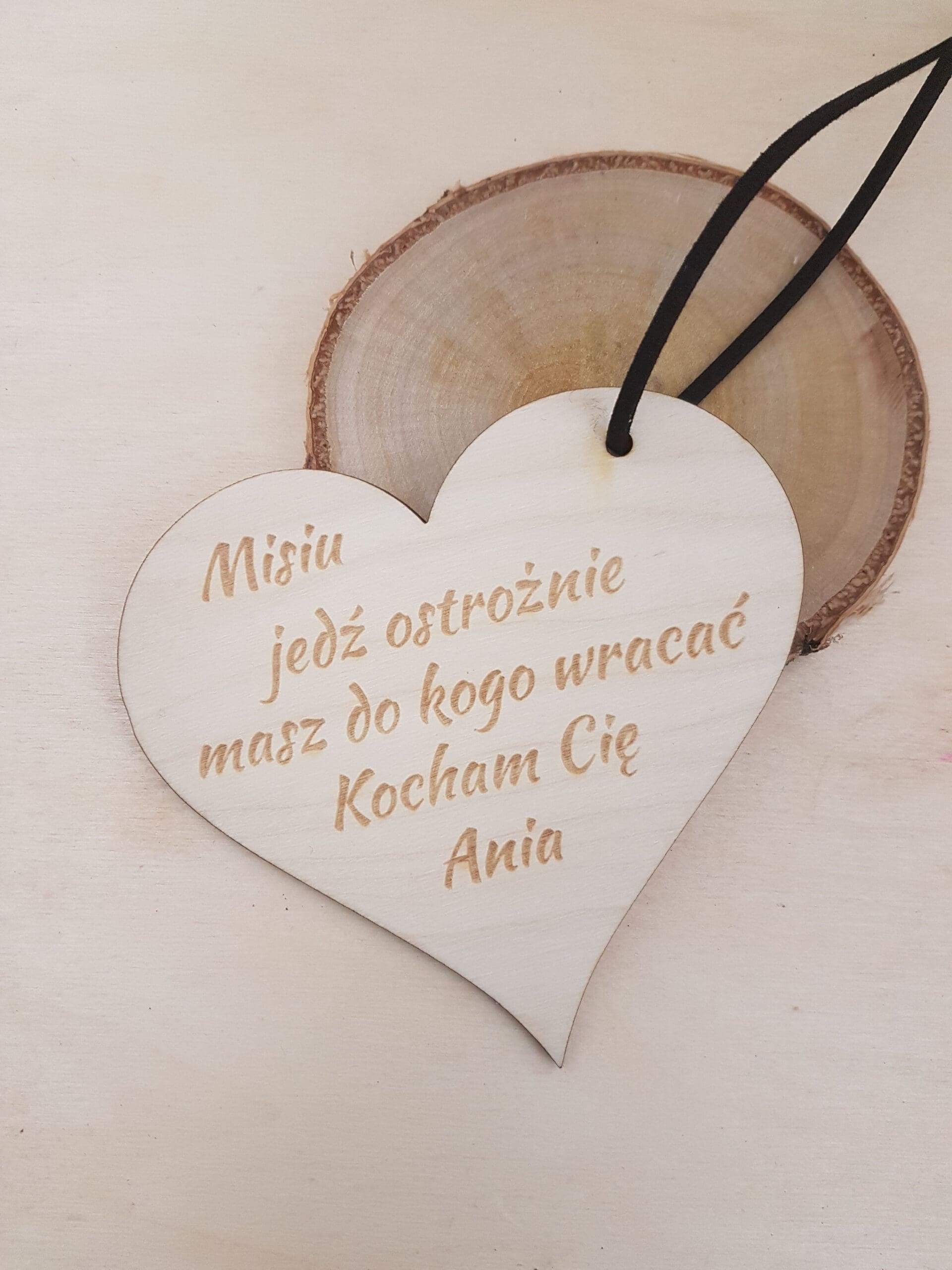 Drewniana zawieszka do auta z napisem „Jedź ostrożnie masz do kogo wracać” będzie wspaniałą niespodzianką dla każdego. Zawieszka będzie stale przypominać ukochanej osobie o tym, by bezpiecznie wróciła do Ciebie. Nasz produkt z grawerem podarowany na urodziny lub z okazji walentynek będzie miłym gadżetem o osobistym charakterze.Twoje imię umieszczone na jego powierzchni sprawi, że ukochana osoba będzie myślami zawsze przy Tobie.
