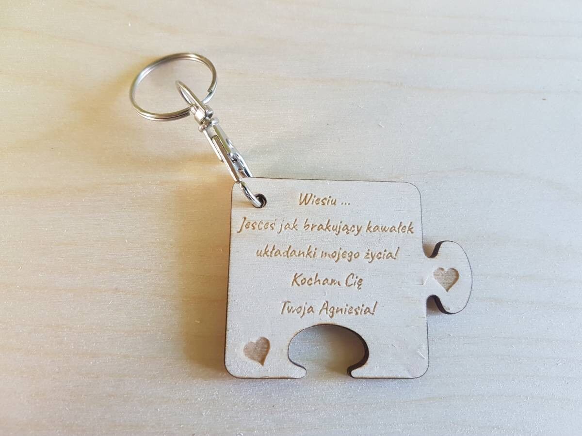 Drewniany brelok z napisem „Jesteś jak brakujący kawałek układanki mojego życia!” będzie wspaniałą niespodzianką dla każdego. Nasz produkt z grawerem podarowany na urodziny lub z okazji walentynek będzie miłym gadżetem o osobistym charakterze.