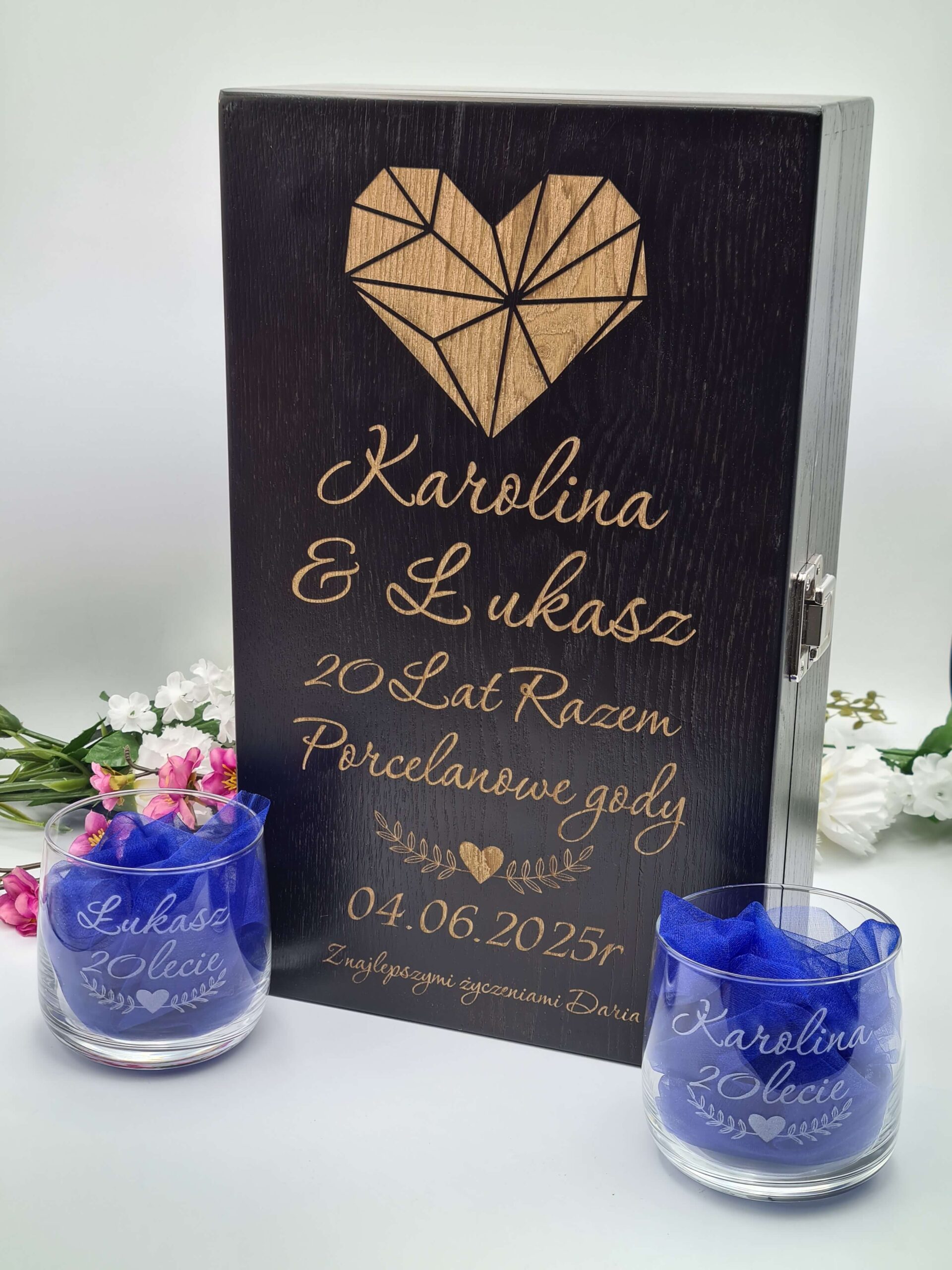 Podwójna Skrzynka na Rocznicę Ślubu z Grawerem „Serce” i Szklankami – Wyjątkowy Prezent dla Pary