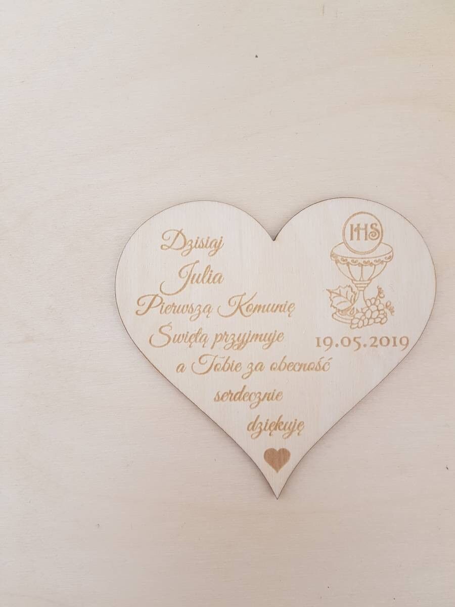 Podaruj swoim bliskim wyjątkowe drewniane podziękowania dla gości z okazji Pierwszej Komunii Świętej! Nasz personalizowany magnes w kształcie serca wykonany jest z naturalnego drewna i ozdobiony eleganckim grawerem. Znajdziesz na nim imię dziecka, datę uroczystości oraz podziękowanie za obecność.