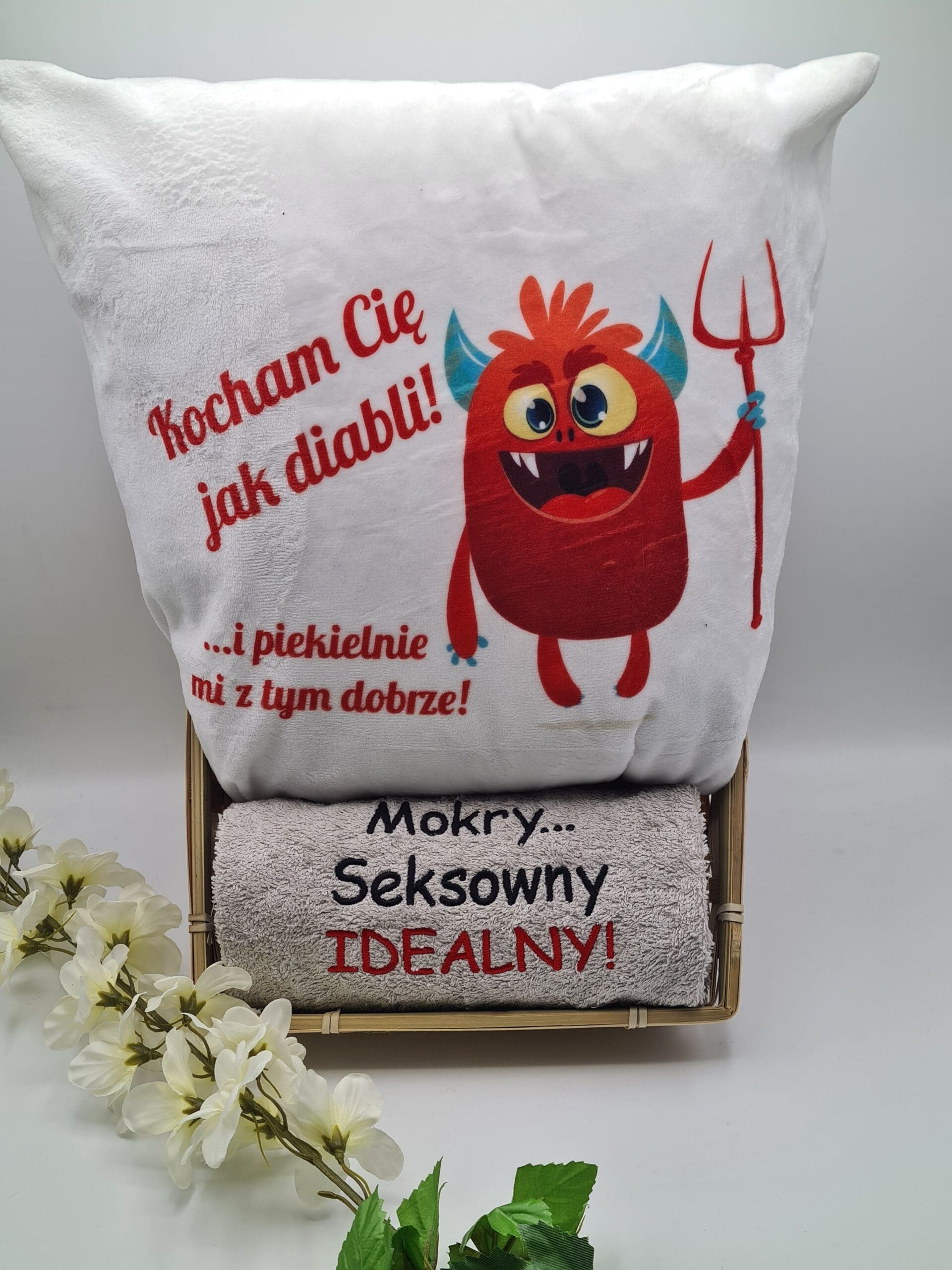 Prezent dla Ukochanej Osoby Zestaw Poduszka i Ręcznik „Kocham Cię jak diabli” – Idealny Prezent