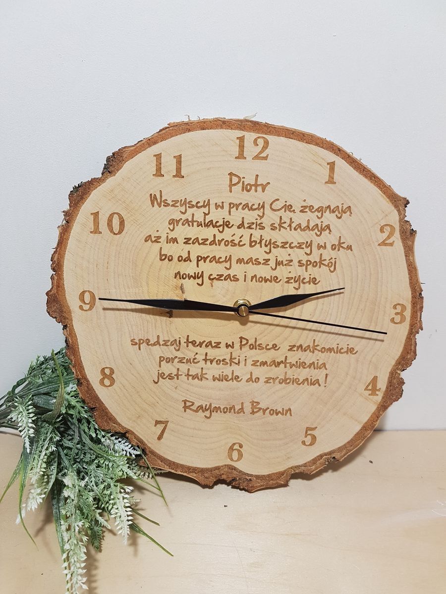 Szukasz niebanalnego prezentu na pożegnanie z pracy? Nasz drewniany zegar ścienny na naturalnym plastrze brzozy to idealna propozycja! Każdy plaster jest unikatowy, co sprawia, że zegar jest jedyny w swoim rodzaju i stanowi wyjątkowy upominek, który będzie przypominał o wspólnie spędzonych chwilach. Zegar wykonany z wysokiej jakości drewna posłuży przez lata, będąc jednocześnie oryginalną ozdobą wnętrza.