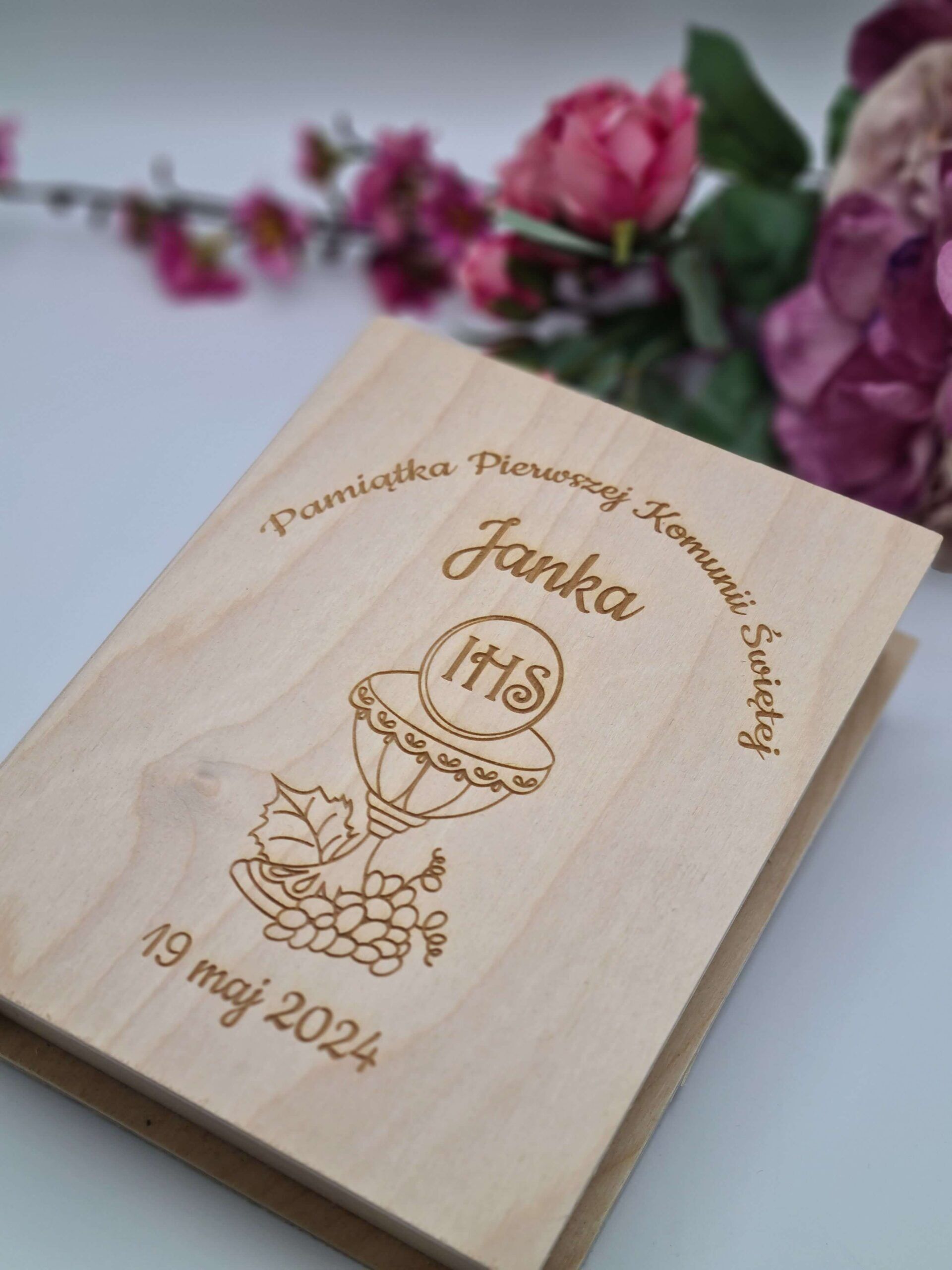 Prezent na Komunię – Drewniane Pudełko w Kształcie Książki z Grawerem i Dedykacją