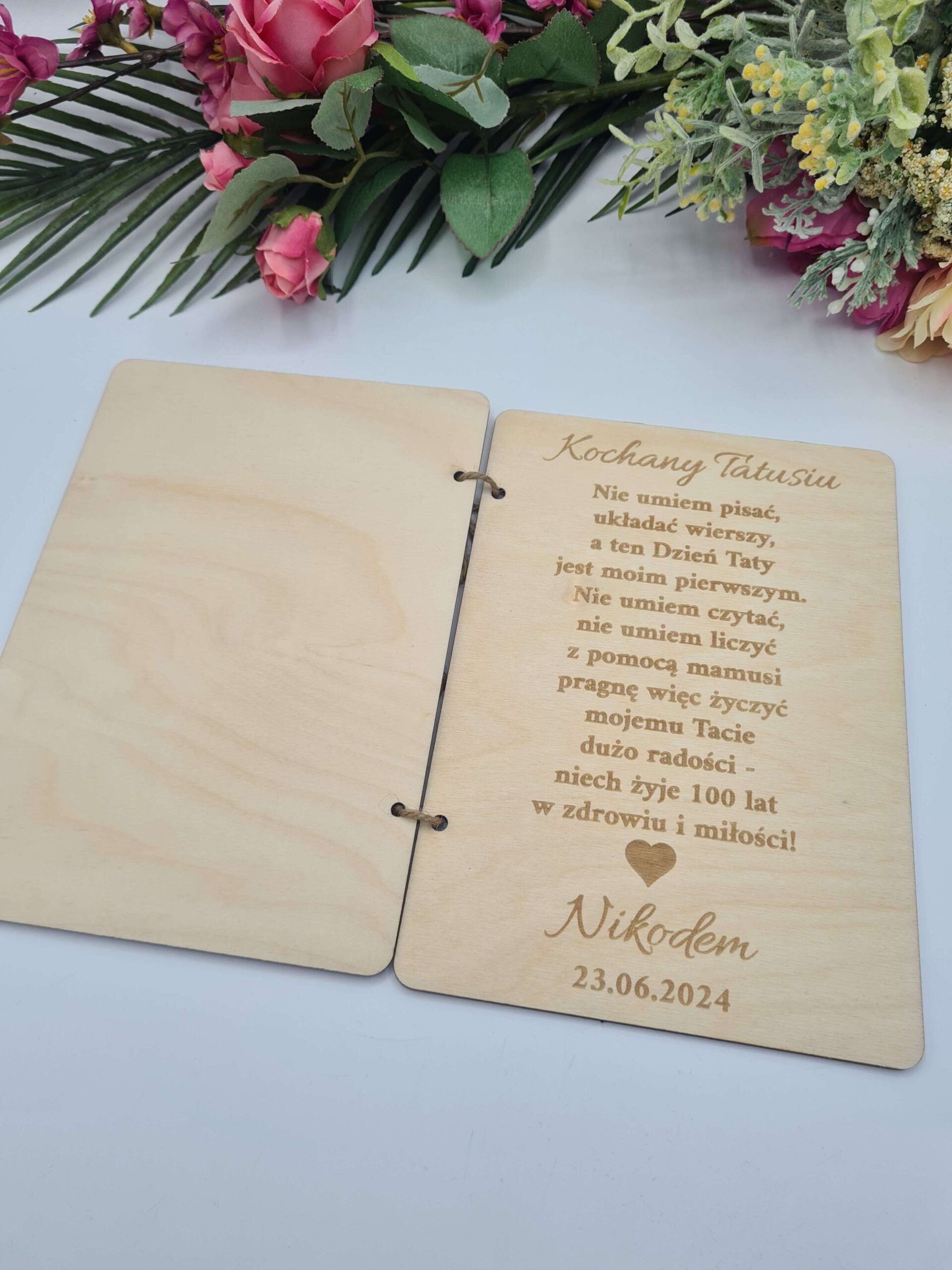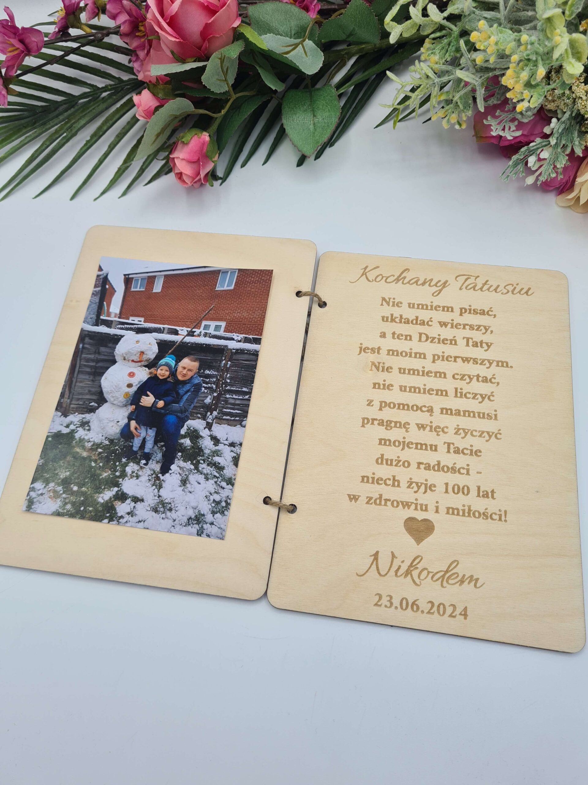Szukasz wzruszającego upominku, który stanie się pamiątką na całe życie? Nasza drewniana ramka dla taty to wyjątkowy prezent na pierwszy Dzień Ojca, łączący elegancki wygląd z osobistym przekazem. Produkt składa się z dwóch drewnianych tabliczek połączonych jutowym sznurkiem – po jednej stronie znajduje się miejsce na zdjęcie, a po drugiej wzruszający wiersz z personalizacją.