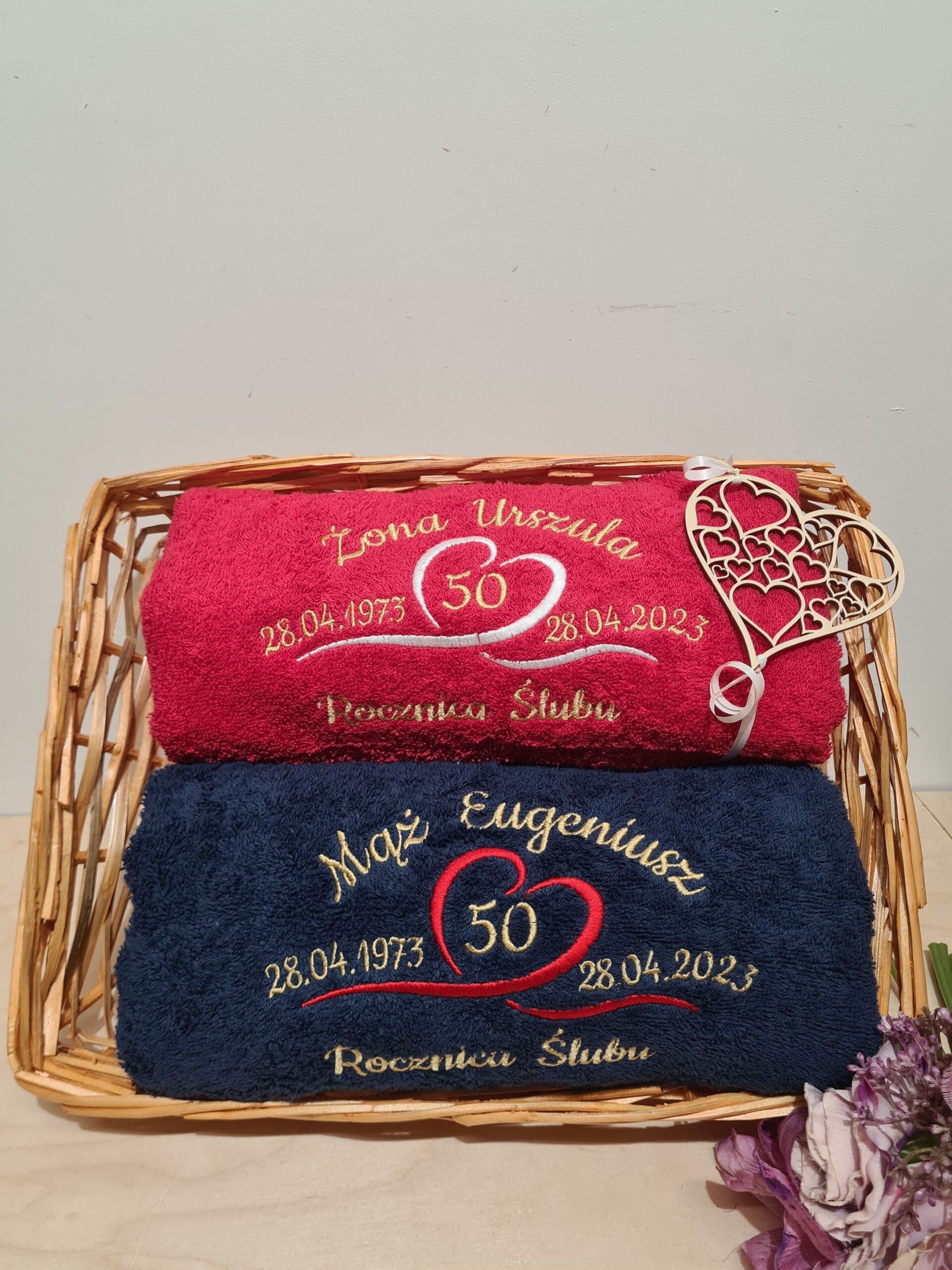 Podaruj wyjątkowy i praktyczny prezent na rocznice! Nasz zestaw dwóch ręczników kąpielowych z personalizowanym haftem to idealny wybór! Miękka, chłonna bawełna zapewni komfort i luksus po każdej kąpieli, a elegancki haft doda osobistego charakteru. Całość zapakowana w ozdobny koszyk, gotowa do wręczenia.