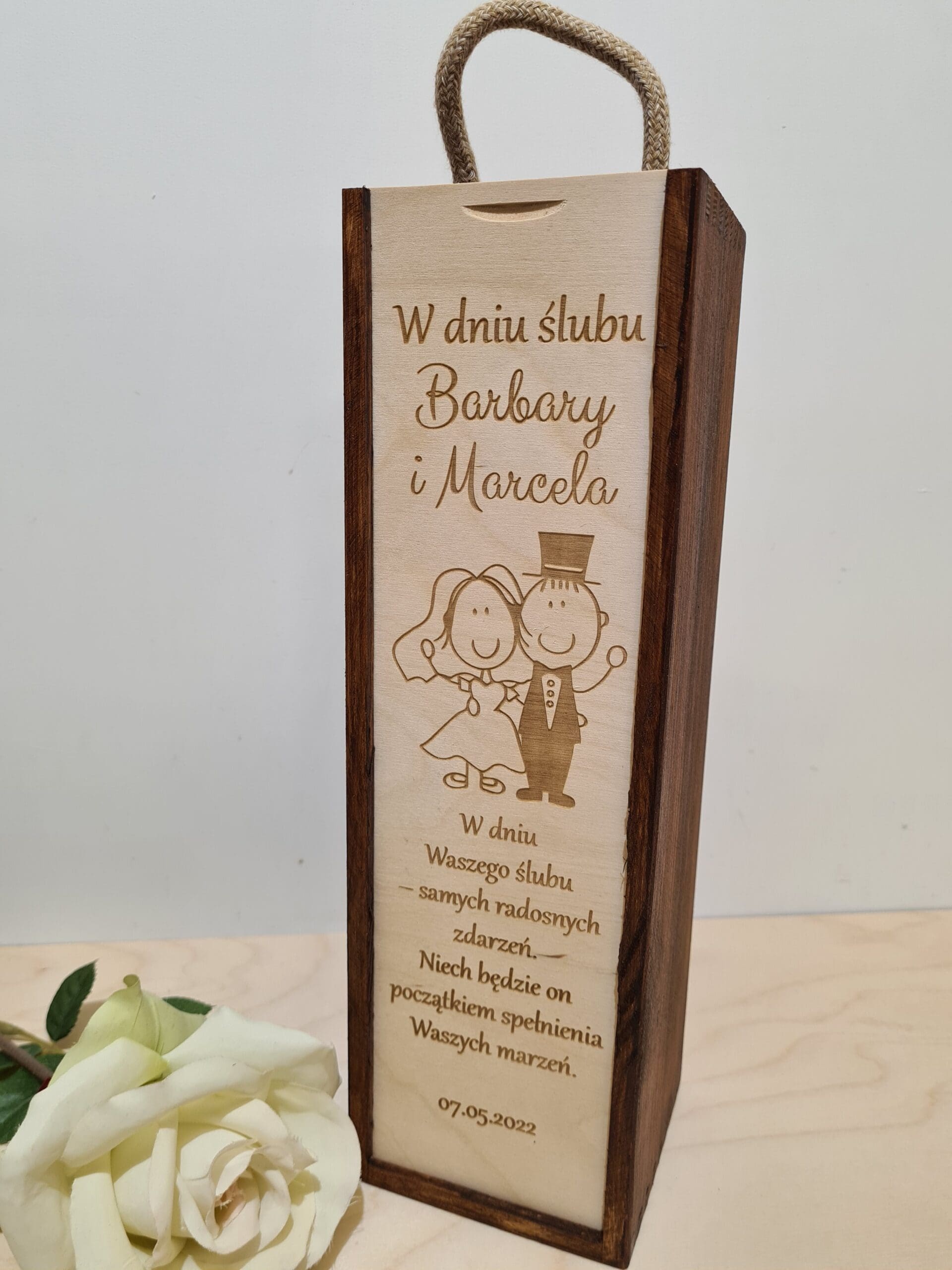 Wyraź swoje najszczersze życzenia wyjątkowym prezentem! Nasza personalizowana skrzynka na alkohol „W Dniu Ślubu” to idealny wybór dla Pary Młodej. Wykonana z naturalnego drewna, dostępna w dwóch eleganckich kolorach (naturalny i ciemny brąz), pomieści butelkę ulubionego trunku (0,7l).
