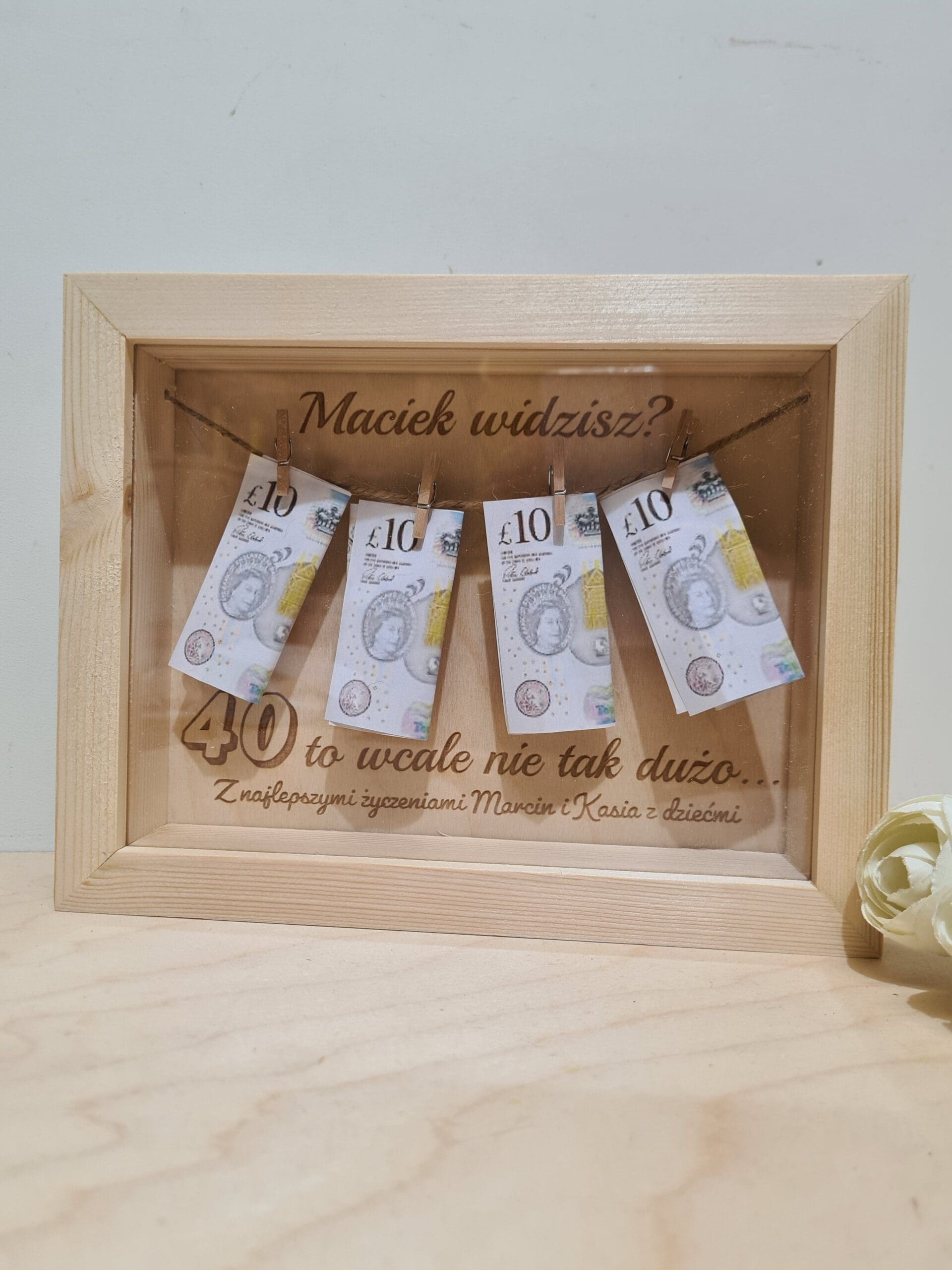 - W środku ramki zostanie zamontowany sznurek z pięcioma klamerkami na których bez problemu można przymocować zarówno banknoty jak i monety.
