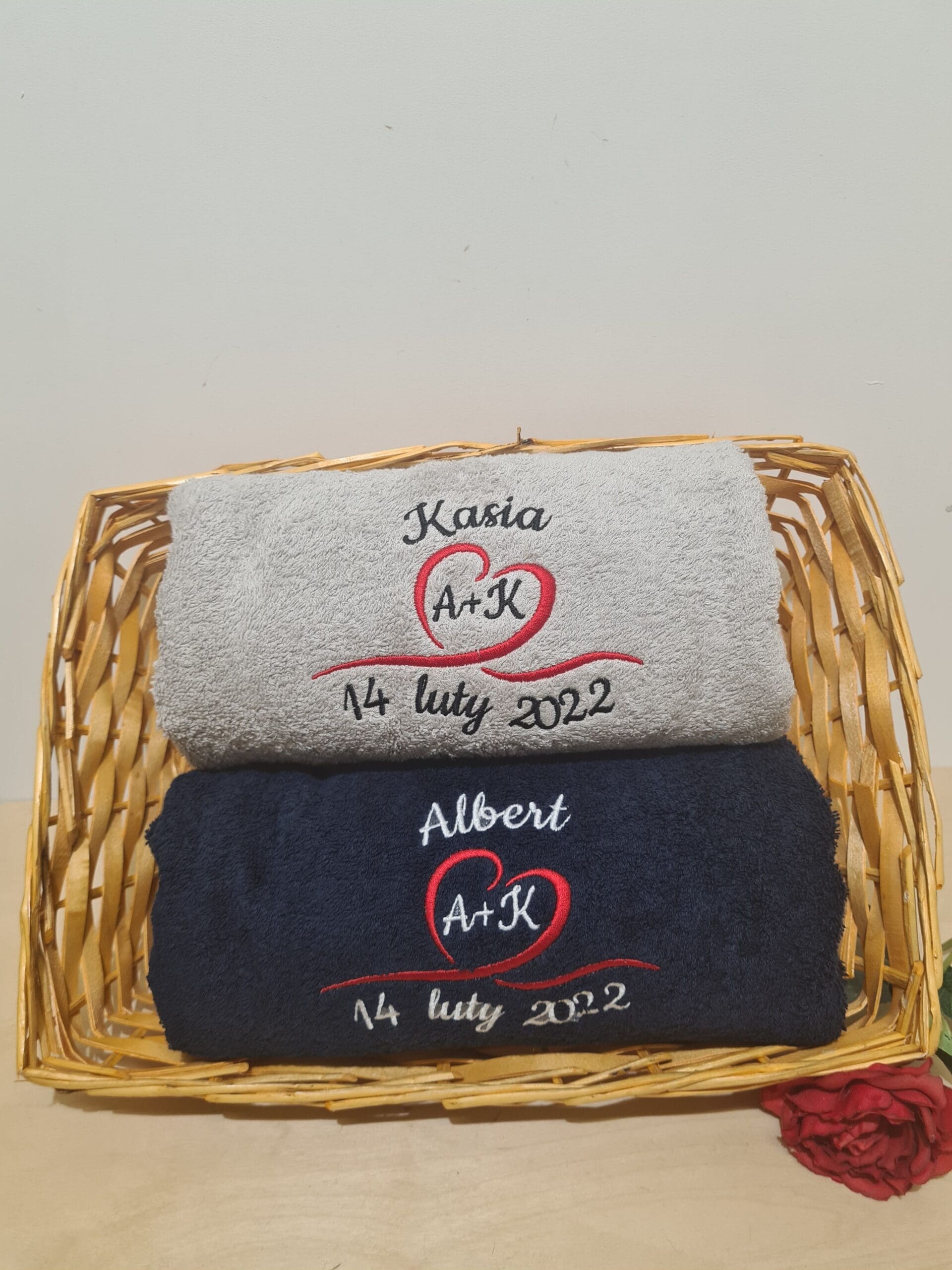 Ręczniki prezent dla zakochanych składają się z dwóch bawełnianych ręczników o wymiarach 70×130 cm oraz gramaturze 500gsm, z wyhaftowanymi inicjałami oraz datą.