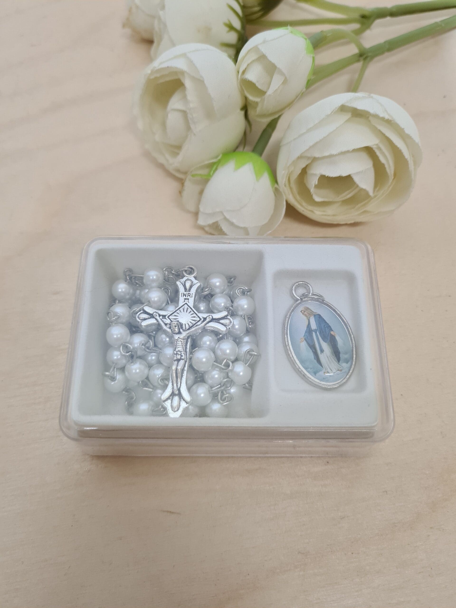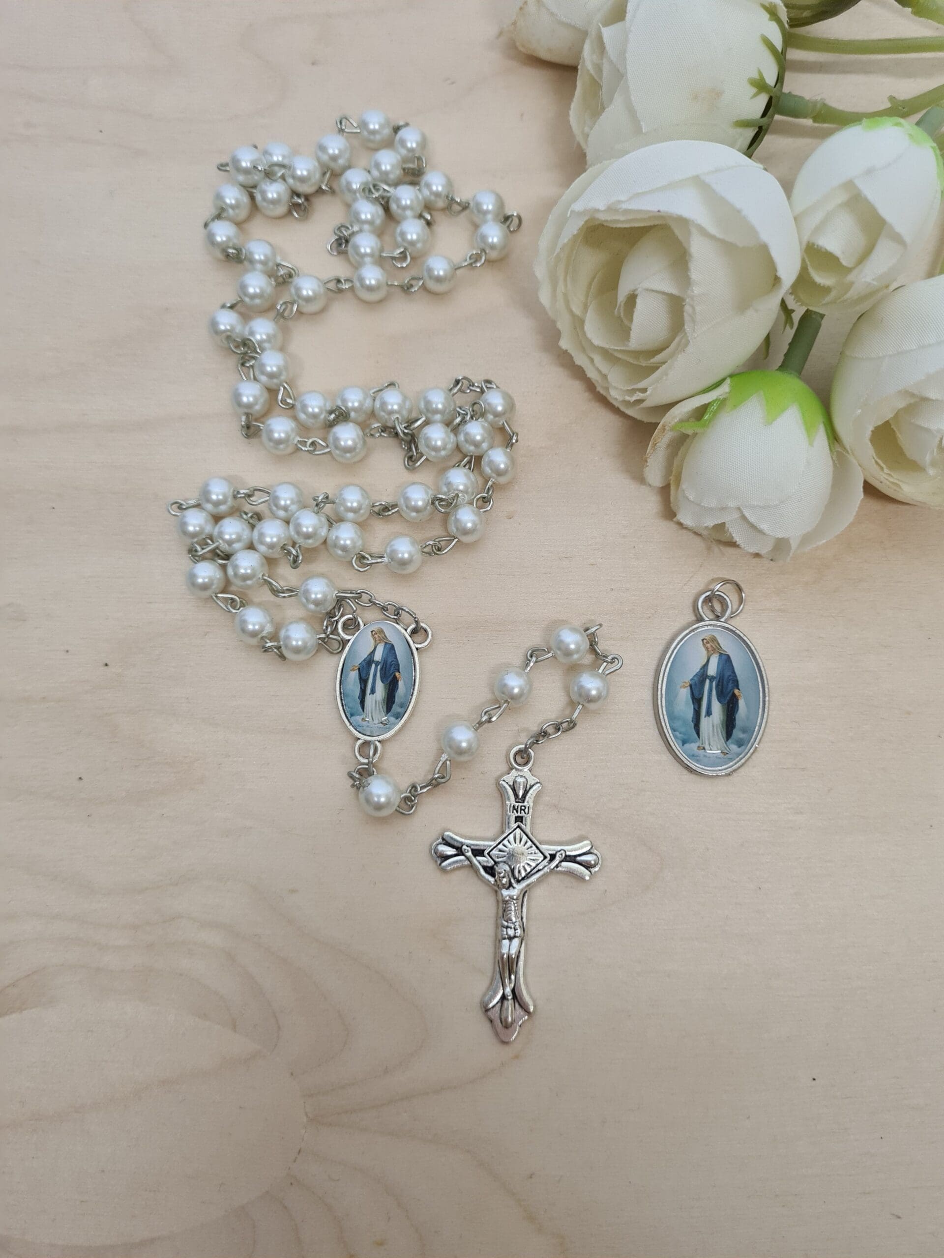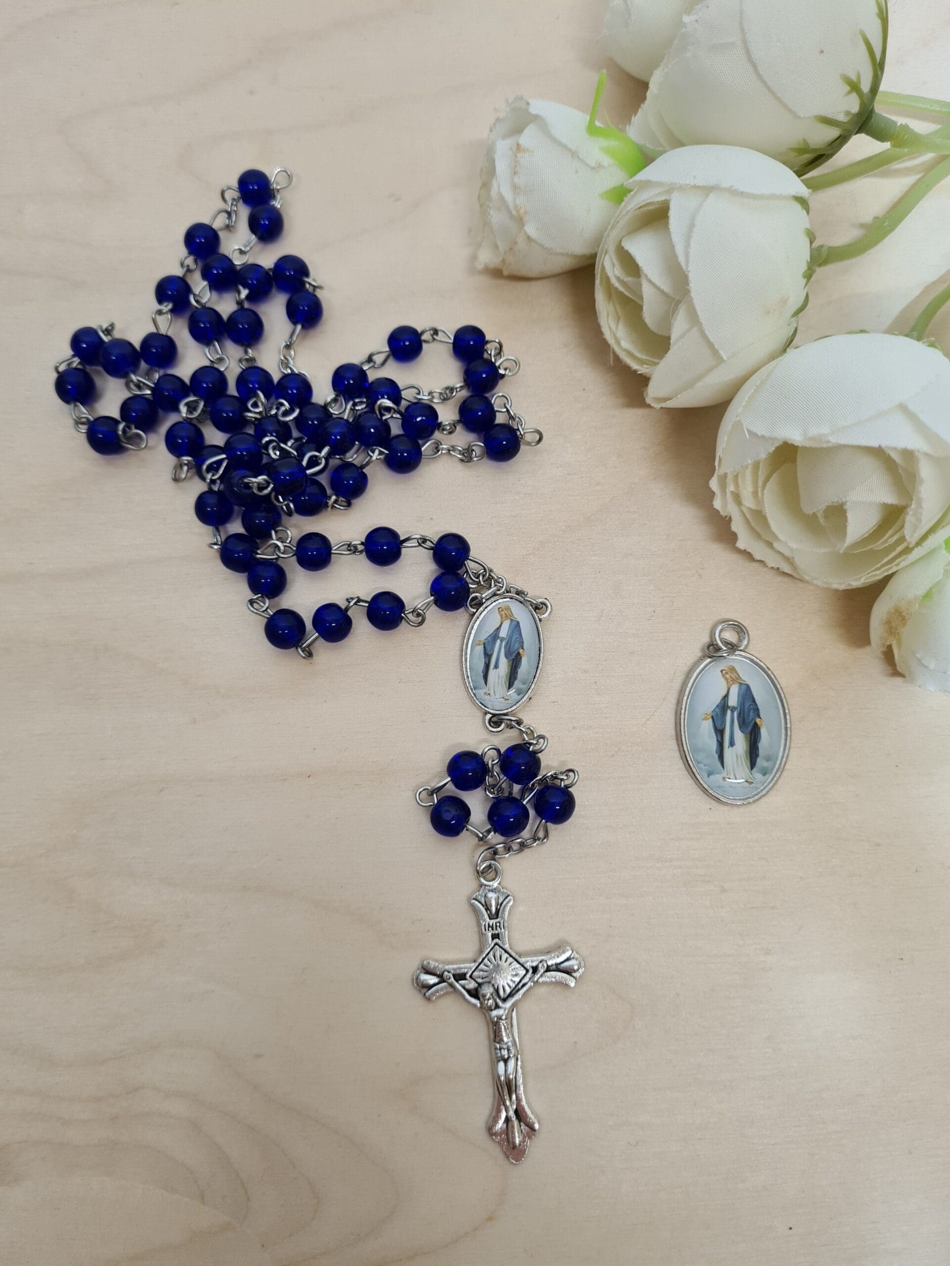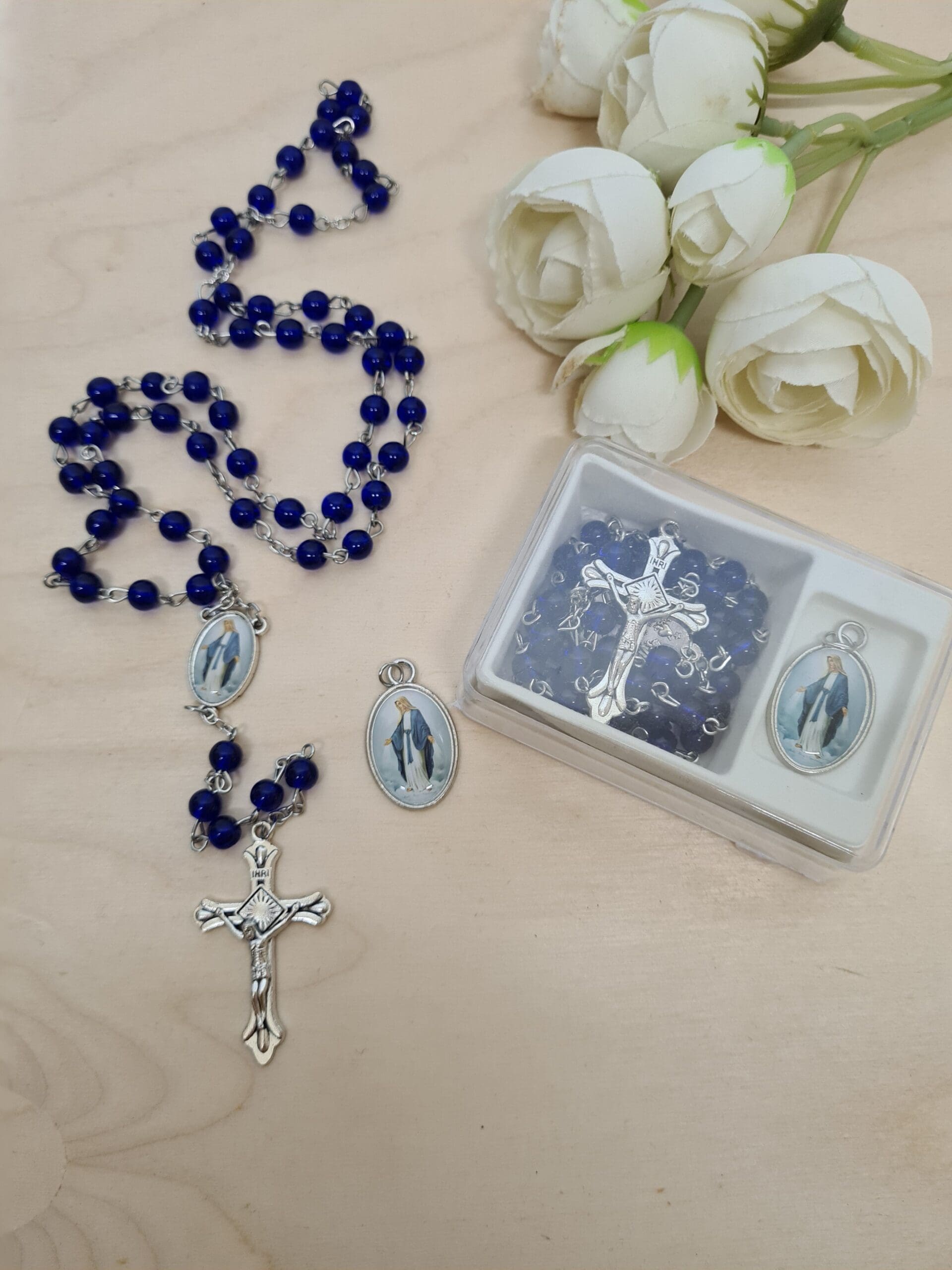 Elegancki zestaw, w skład którego wchodzą: medalik z wizerunkiem Matki Boskiej oraz różaniec z koralikami w niebieskim lub białym kolorze.