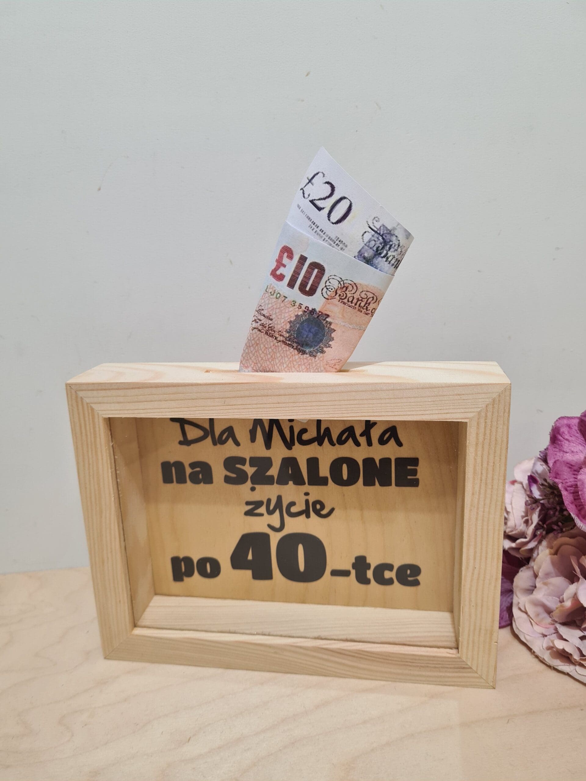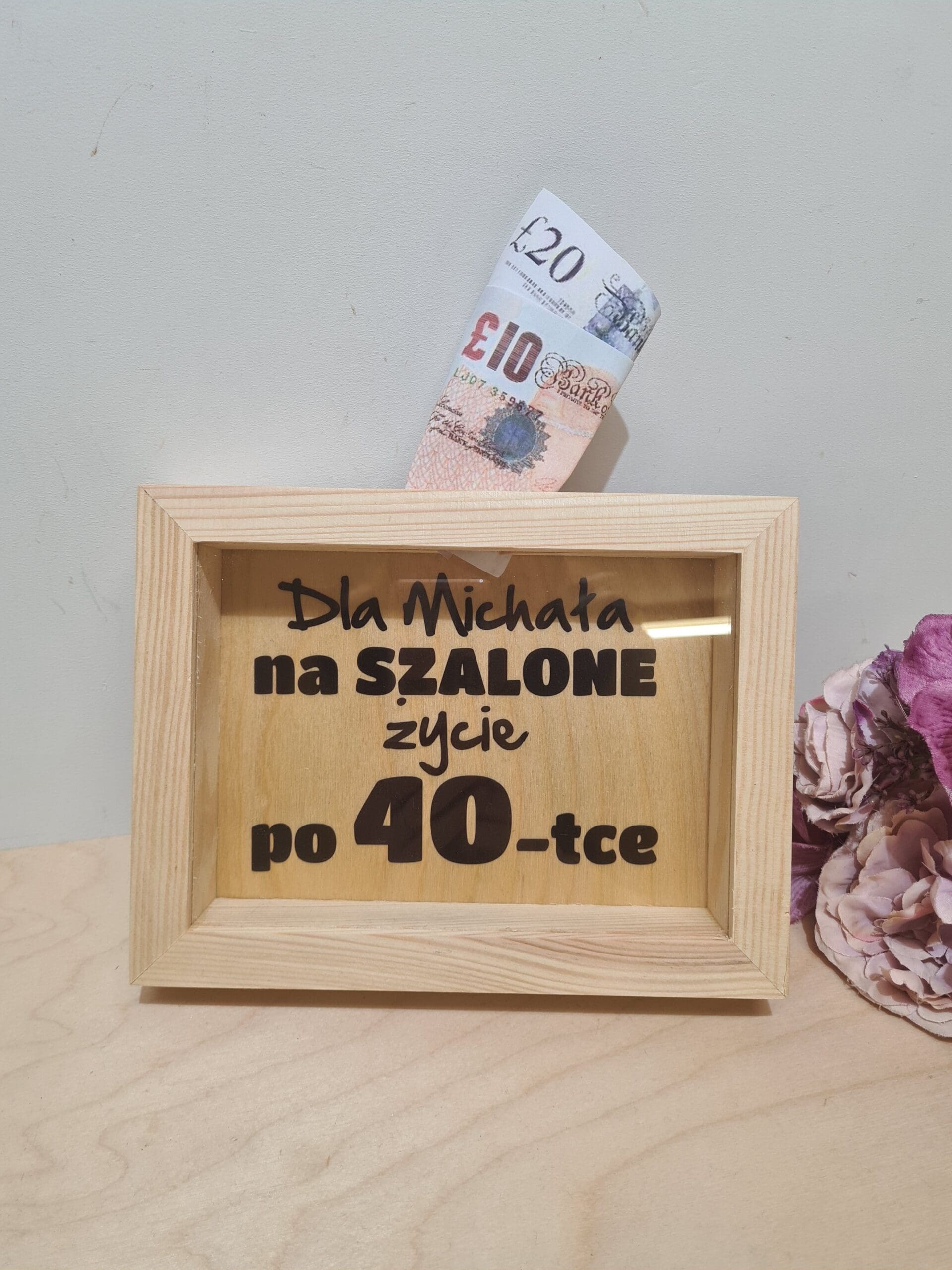 SKARBONKA 3D DREWNIANA Z SZYBKĄ „NA SZALONE ŻYCIE PO 18, 20, 30, 40, 50”