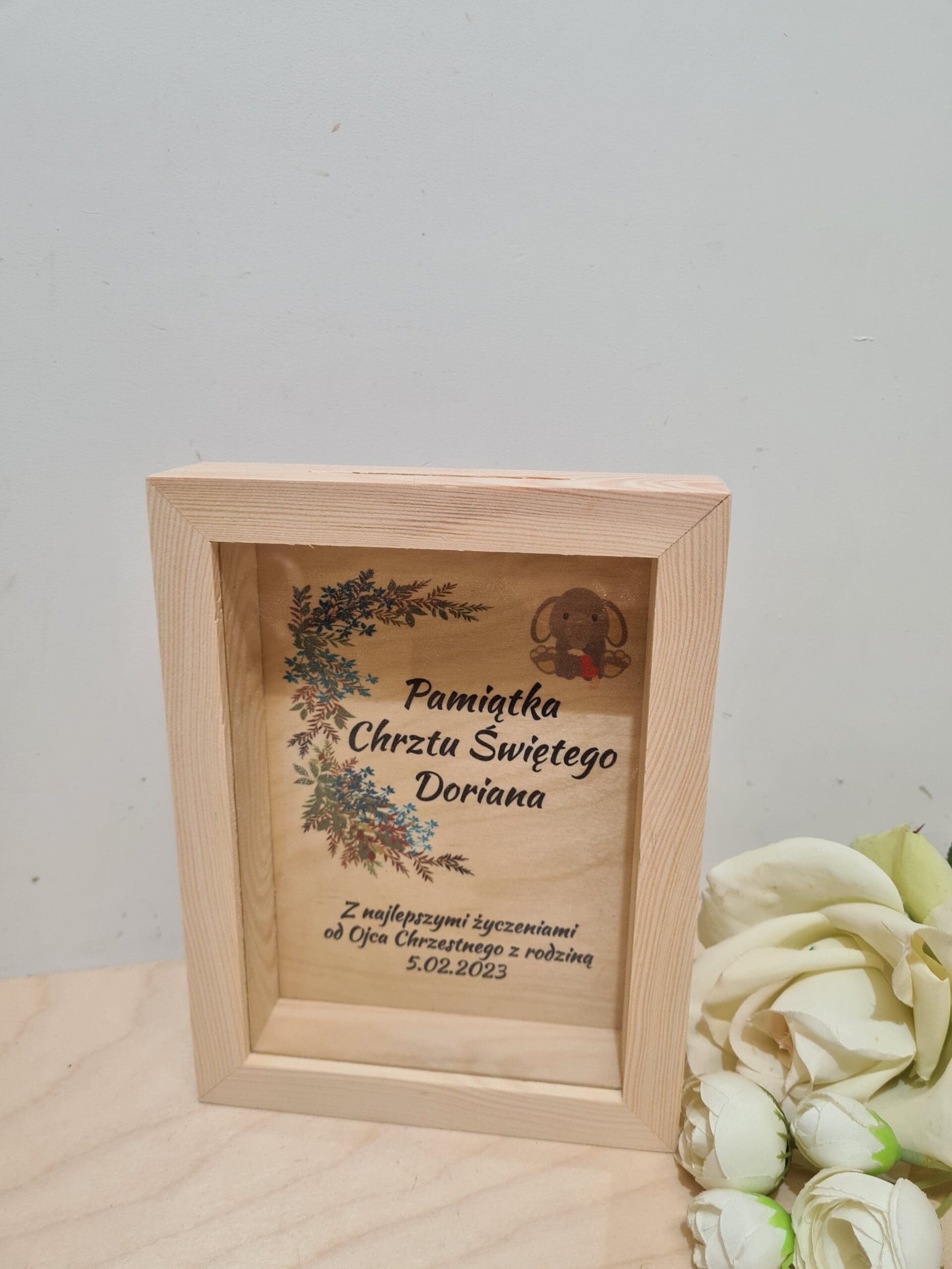 Szukasz wyjątkowego prezentu na chrzest, który będzie jednocześnie pamiątką na lata? Nasza drewniana skarbonka 3D na chrzest w kształcie uroczego słonika to idealny wybór! Personalizowana szybką z imieniem dziecka sprawia, że prezent staje się jeszcze bardziej wyjątkowy. Skarbonka nie tylko uczy maluszka oszczędzania, ale również pięknie ozdobi jego pokój.